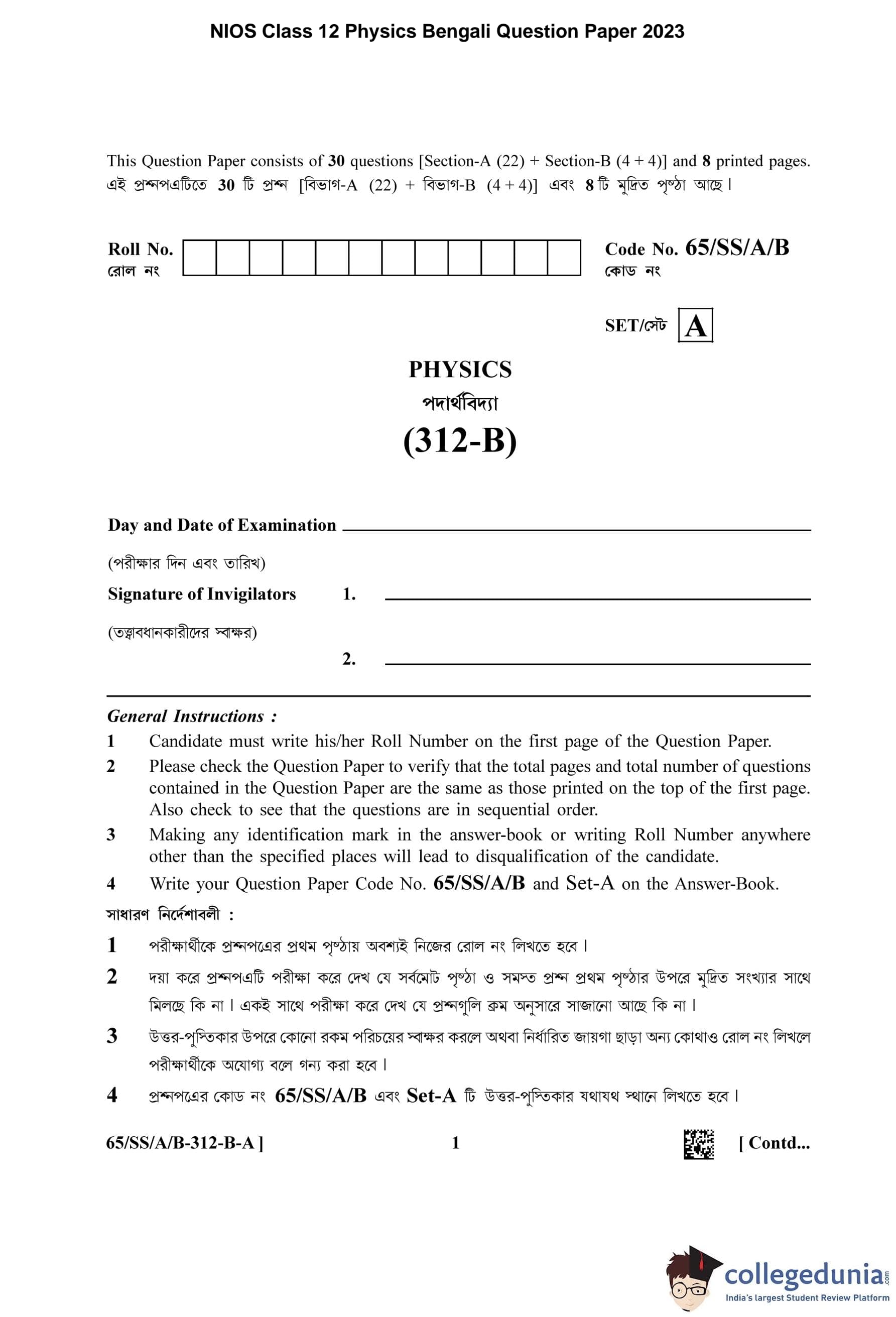 NIOS Class 12 Physics Bengali Question Paper 2023 with Answer Key pdf (Set A) is available for download here. The exam was conducted by National Institute of Open Schooling on April 28, 2023 in the Afternoon Session 2.30 PM to 5.30 PM. The question paper comprised a total of 30 questions divided among 2 sections.