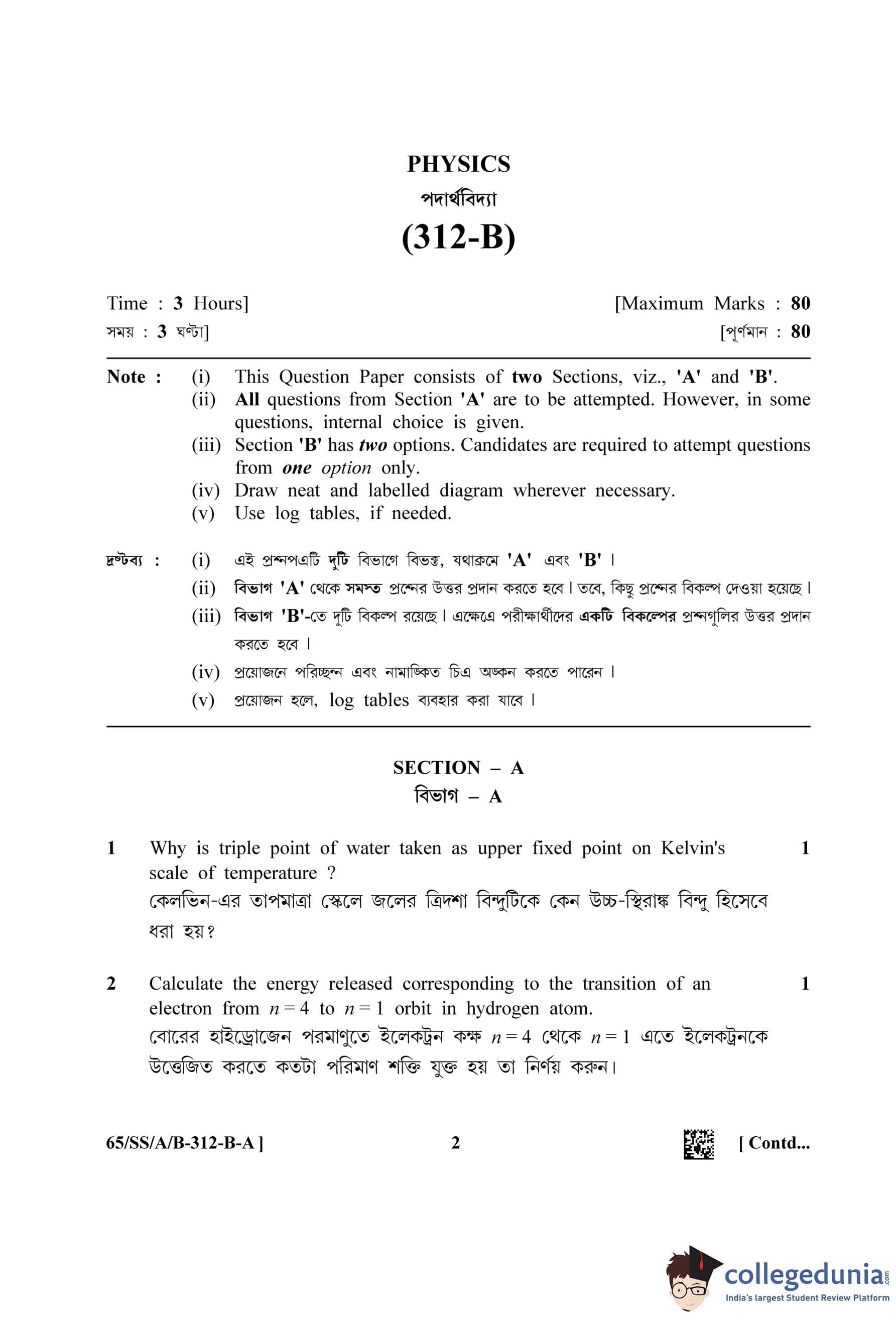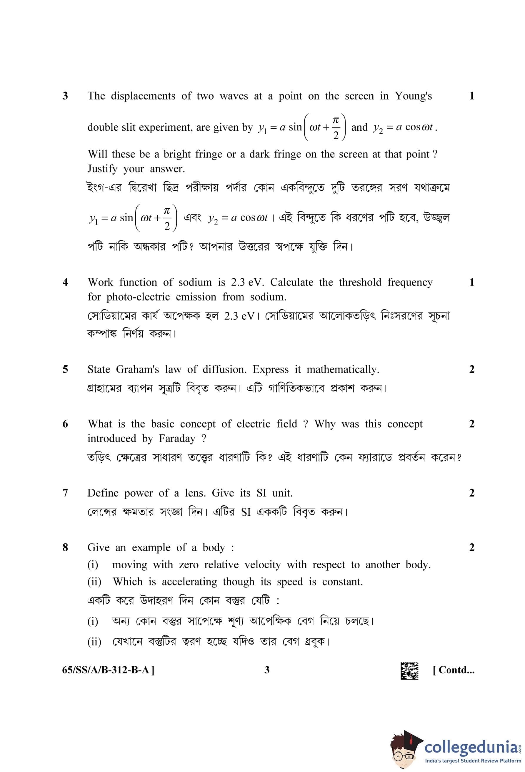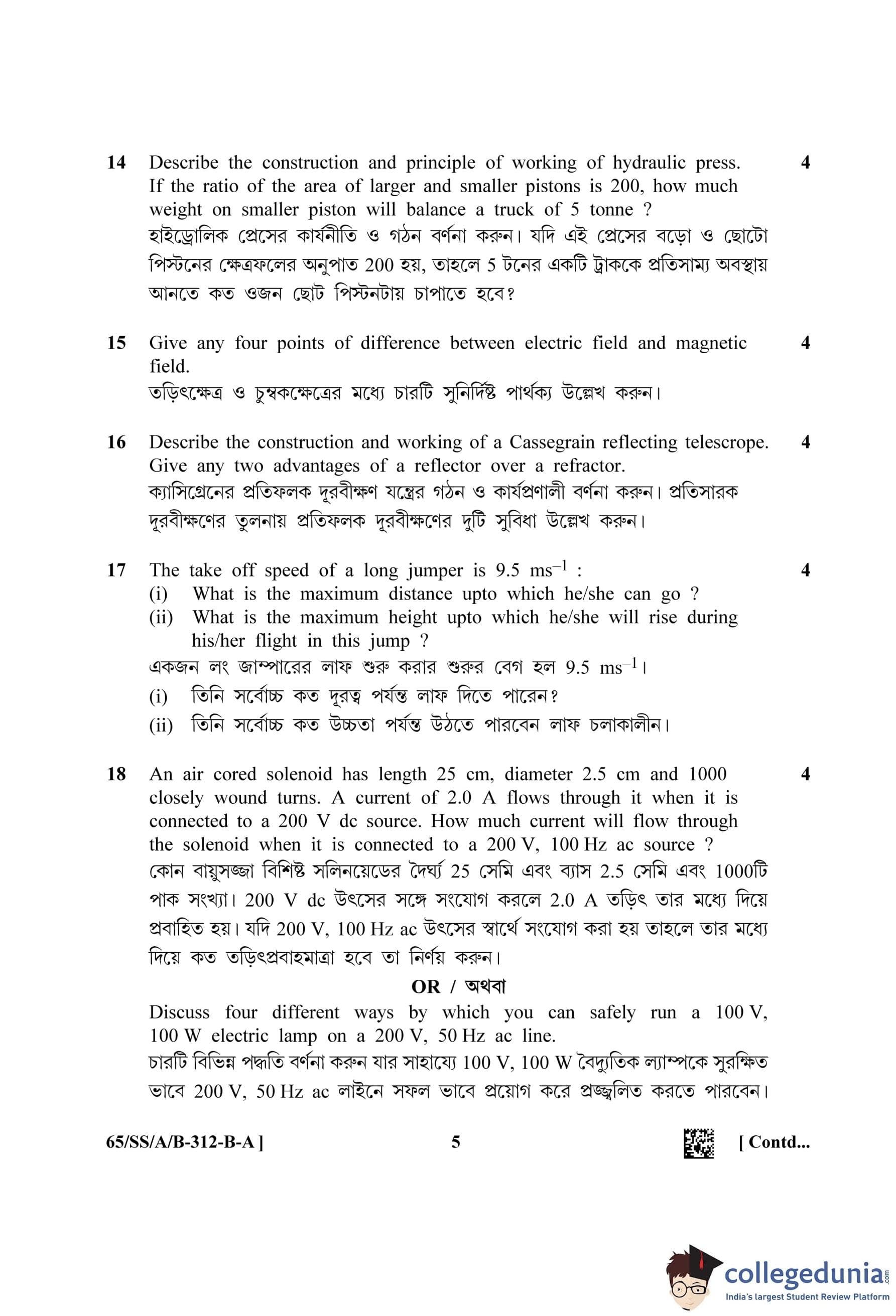 NIOS Class 12 Physics Bengali Question Paper 2023 with Answer Key Set A