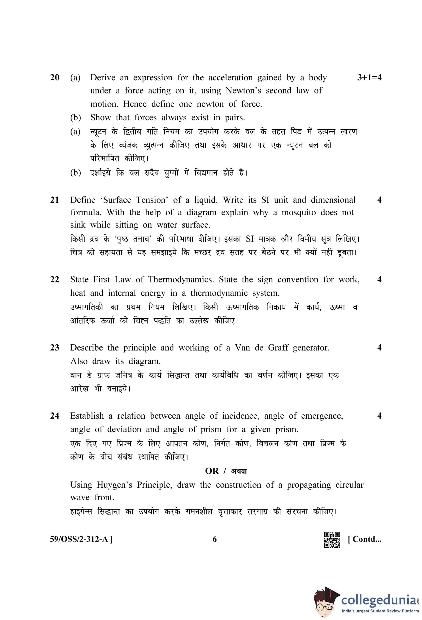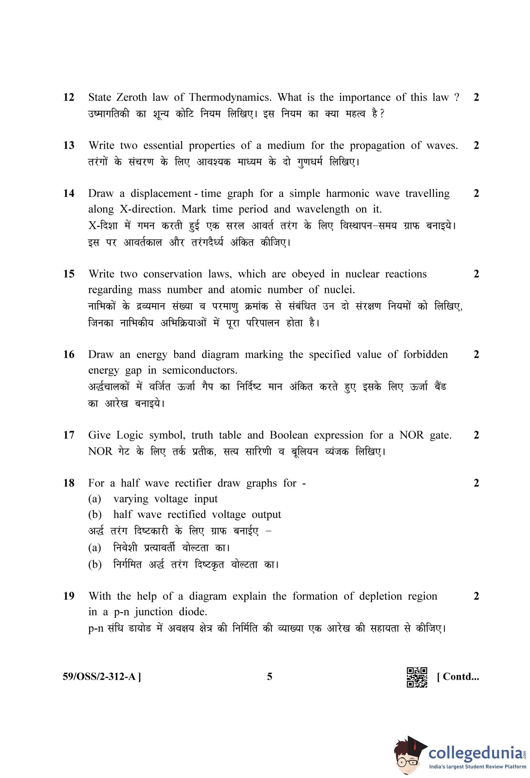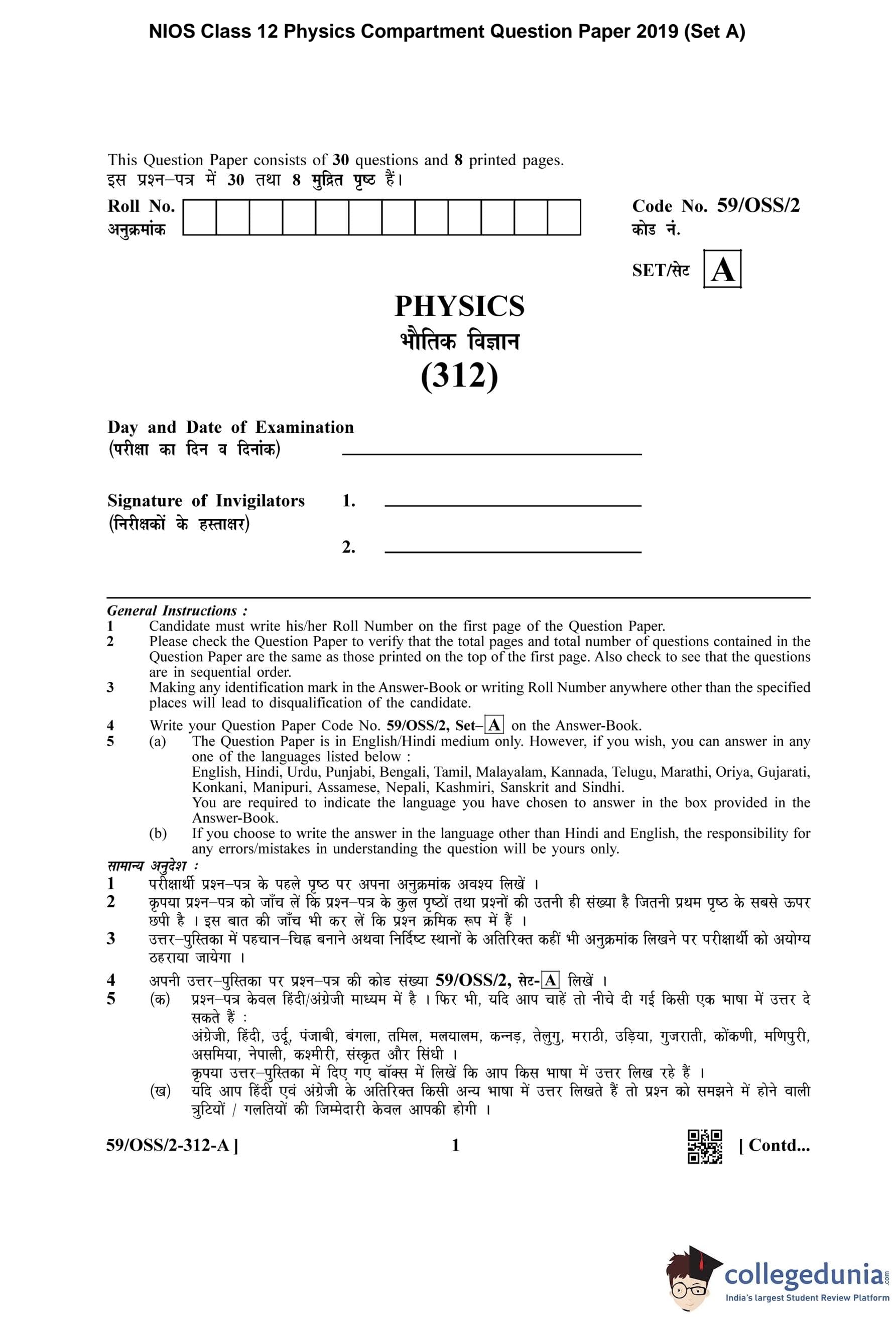 NIOS Class 12 Physics (Set A) Compartment Question Paper 2019 with Answer Key