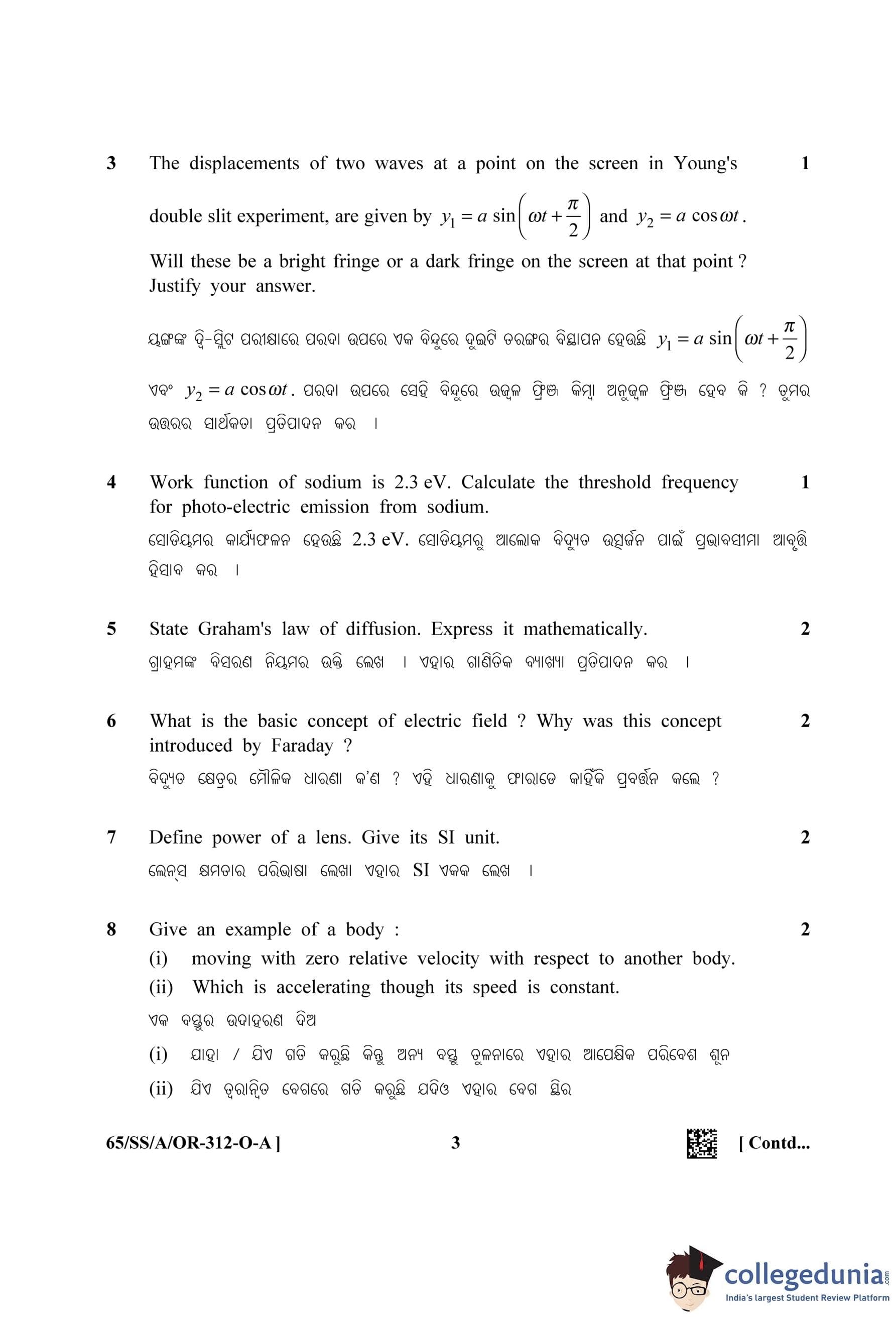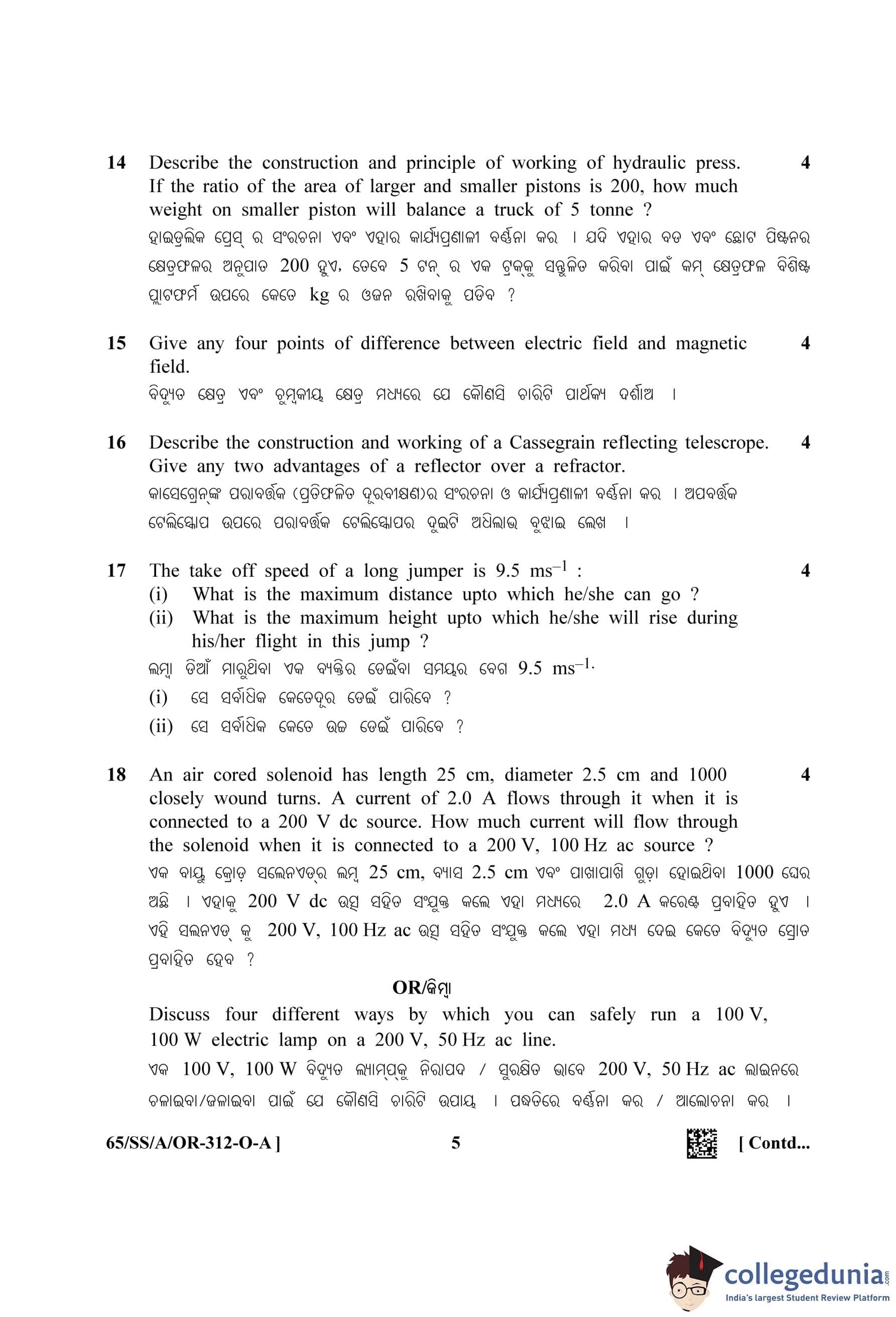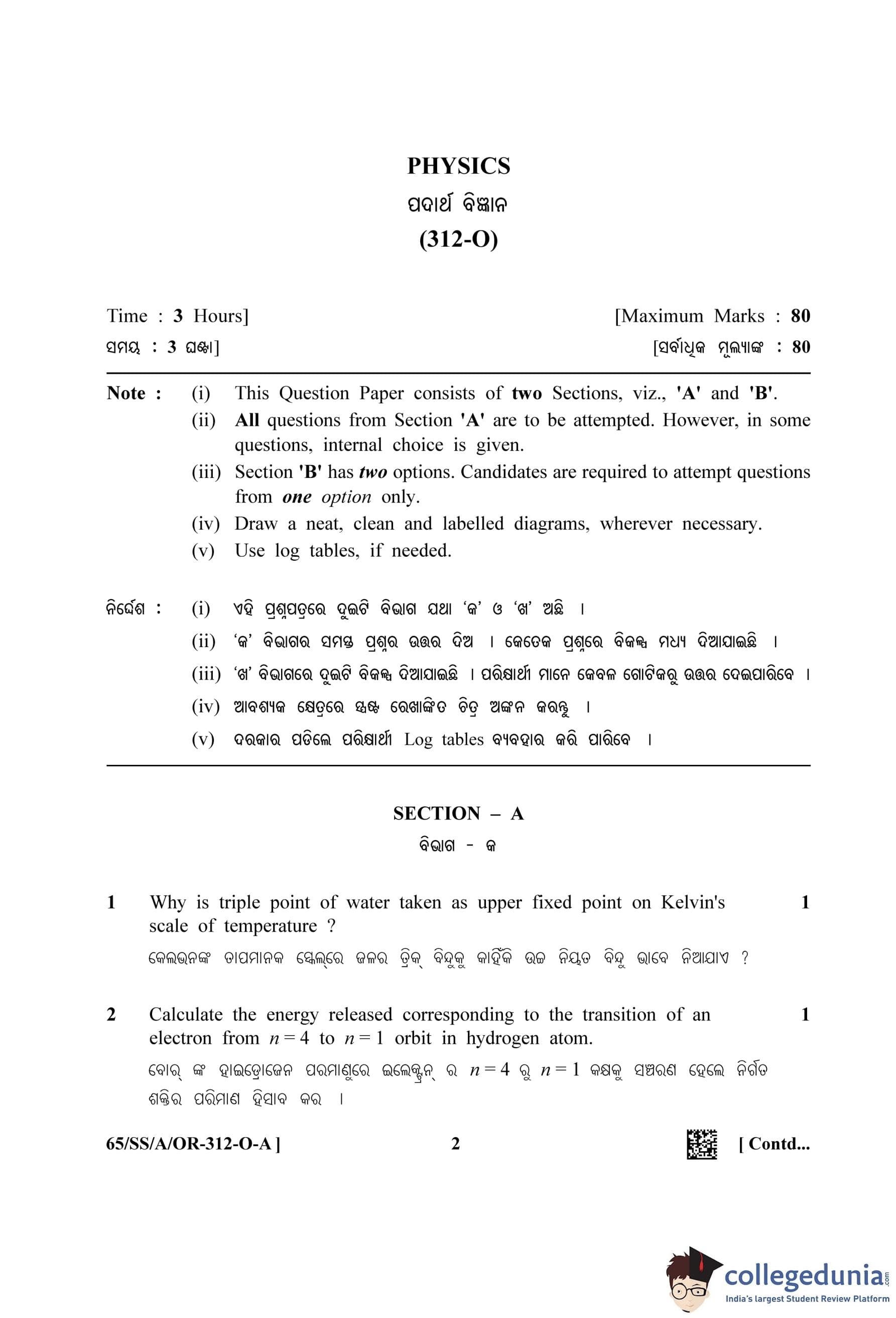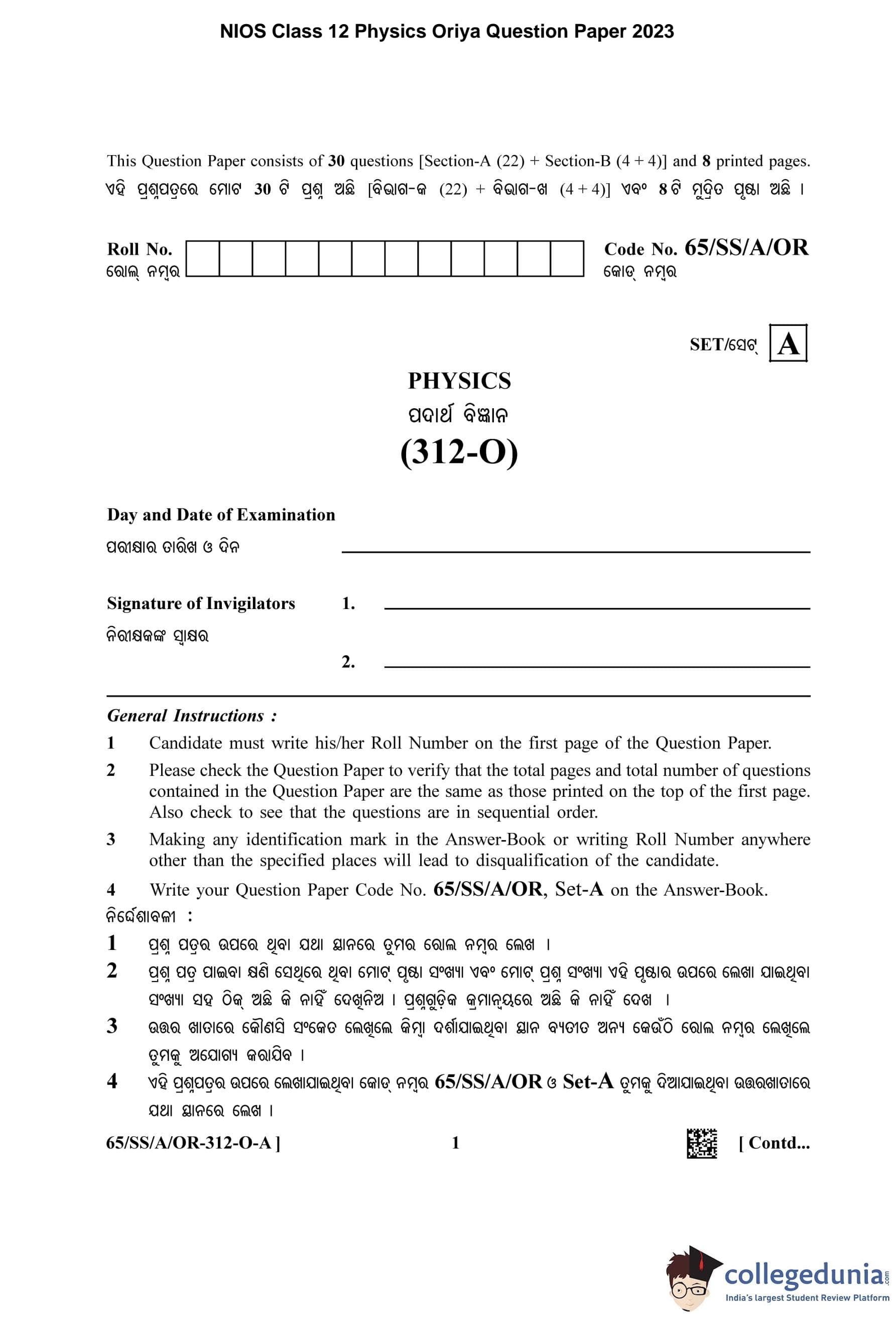NIOS Class 12 Physics Oriya Question Paper 2023 with Answer Key Set A