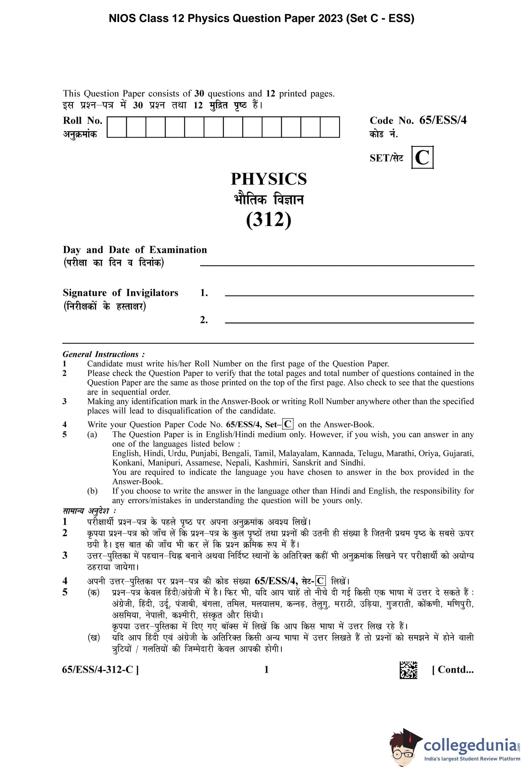 NIOS Class 12 Physics Question Paper 2023 with Answer Key pdf (Set C - ESS) is available for download here. The exam was conducted by National Institute of Open Schooling on April 28, 2023 in the Afternoon Session 2.30 PM to 5.30 PM. The question paper comprised a total of 30 questions.
