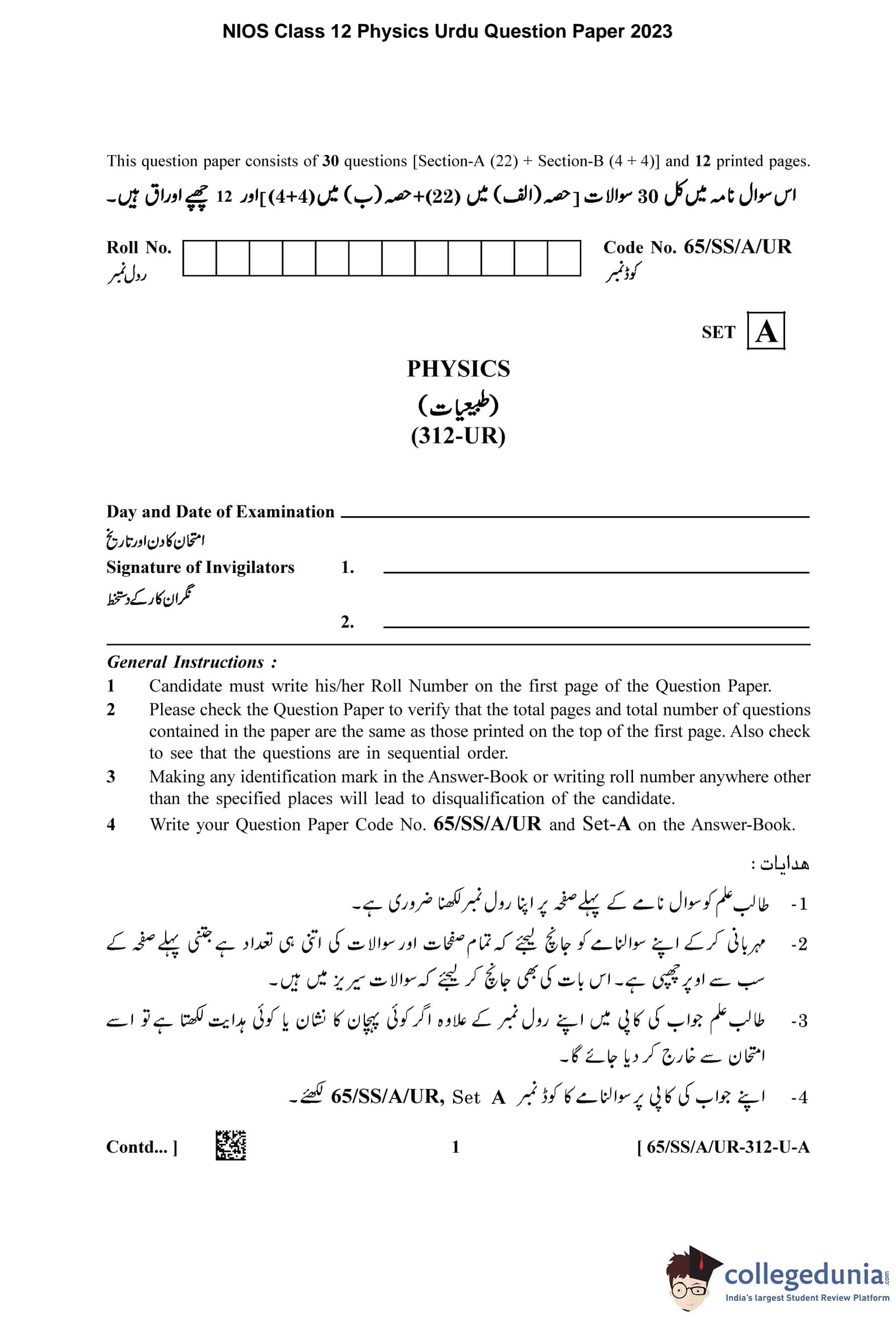 NIOS Class 12 Physics Urdu Question Paper 2023 with Answer Key pdf (Set A) is available for download here. The exam was conducted by National Institute of Open Schooling on April 28, 2023 in the Afternoon Session 2.30 PM to 5.30 PM. The question paper comprised a total of 30 questions divided among 2 sections.