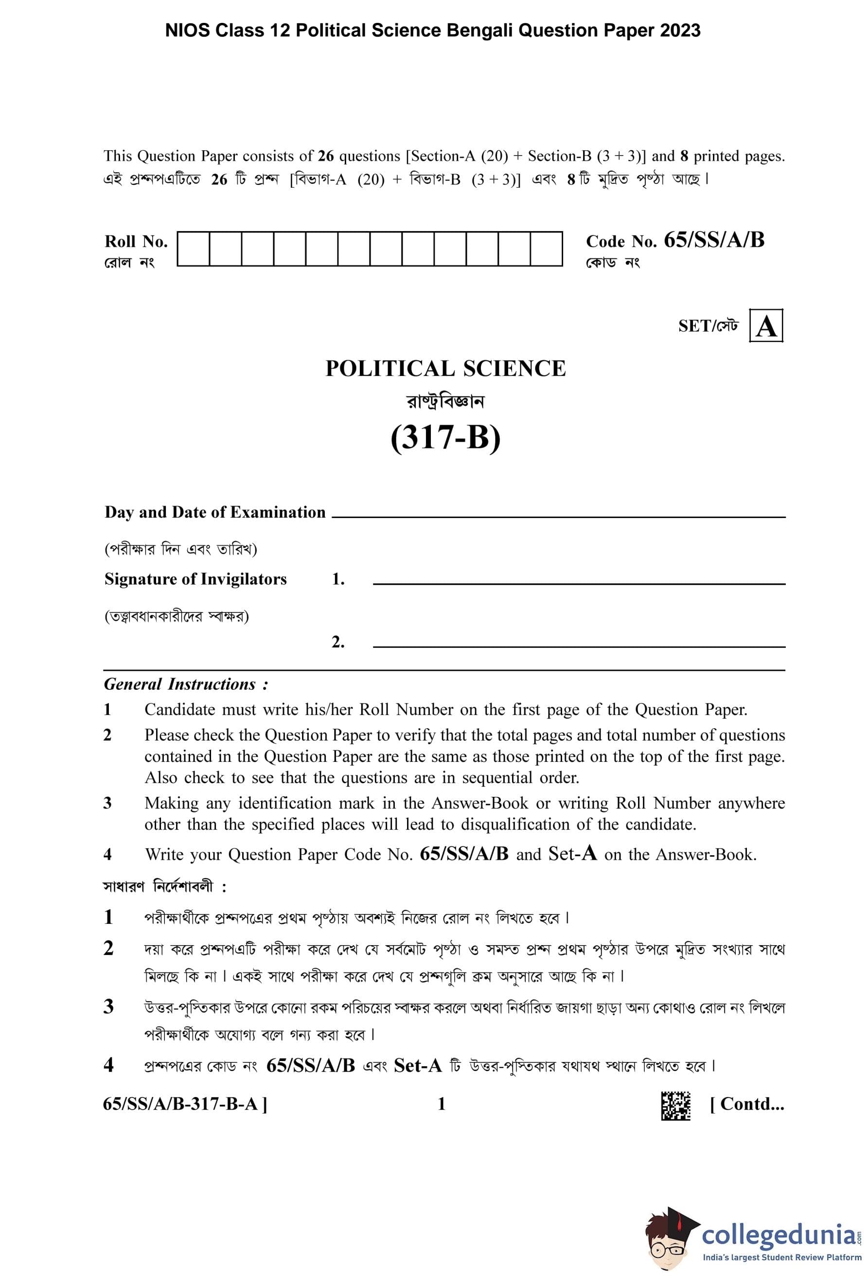 NIOS Class 12 Political Science Bengali Question Paper 2023 with Answer Key pdf (Set A) is available for download here. The exam was conducted by National Institute of Open Schooling on April 19, 2023 in the Afternoon Session 2.30 PM to 5.30 PM. The question paper comprised a total of 26 questions divided among 2 sections.