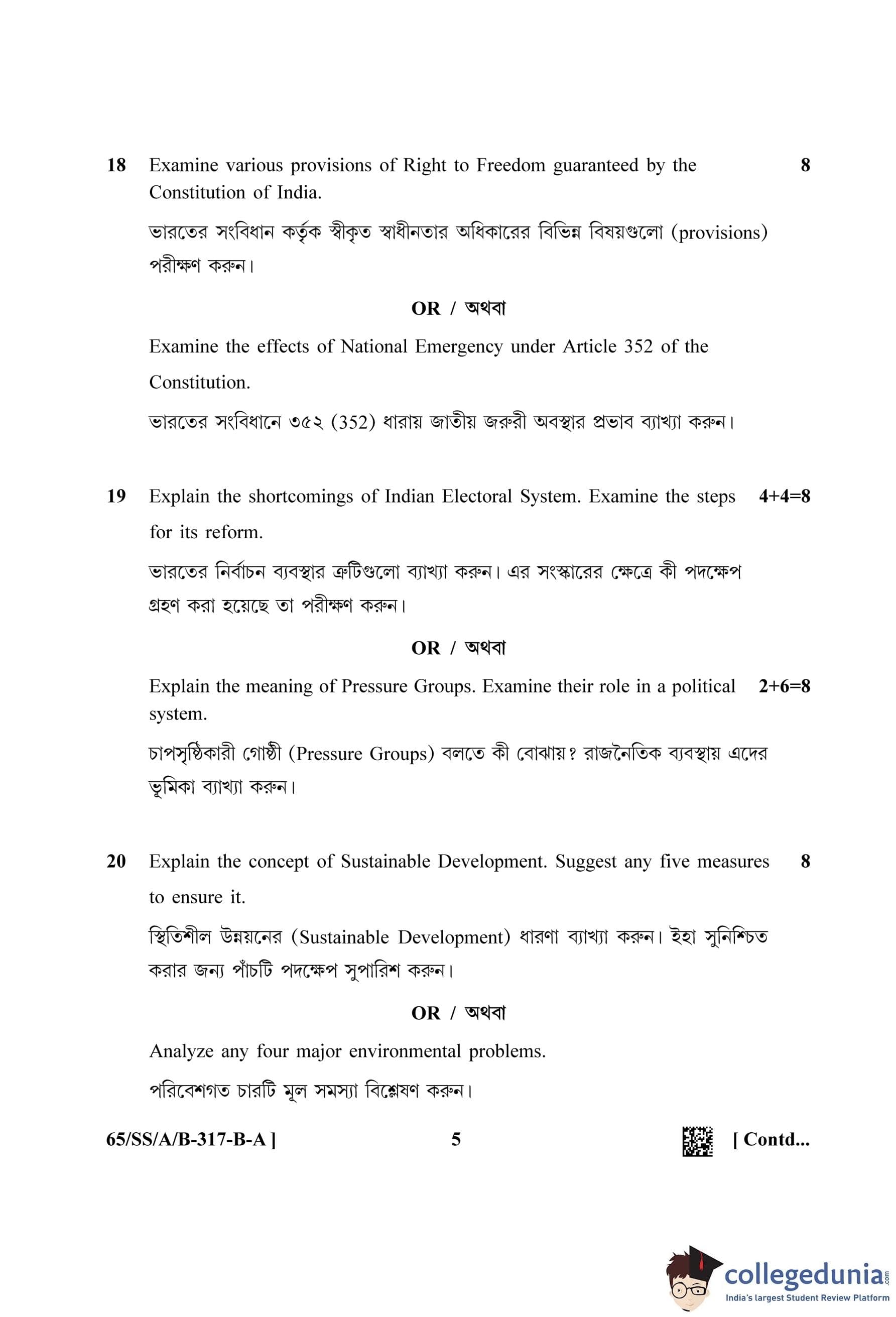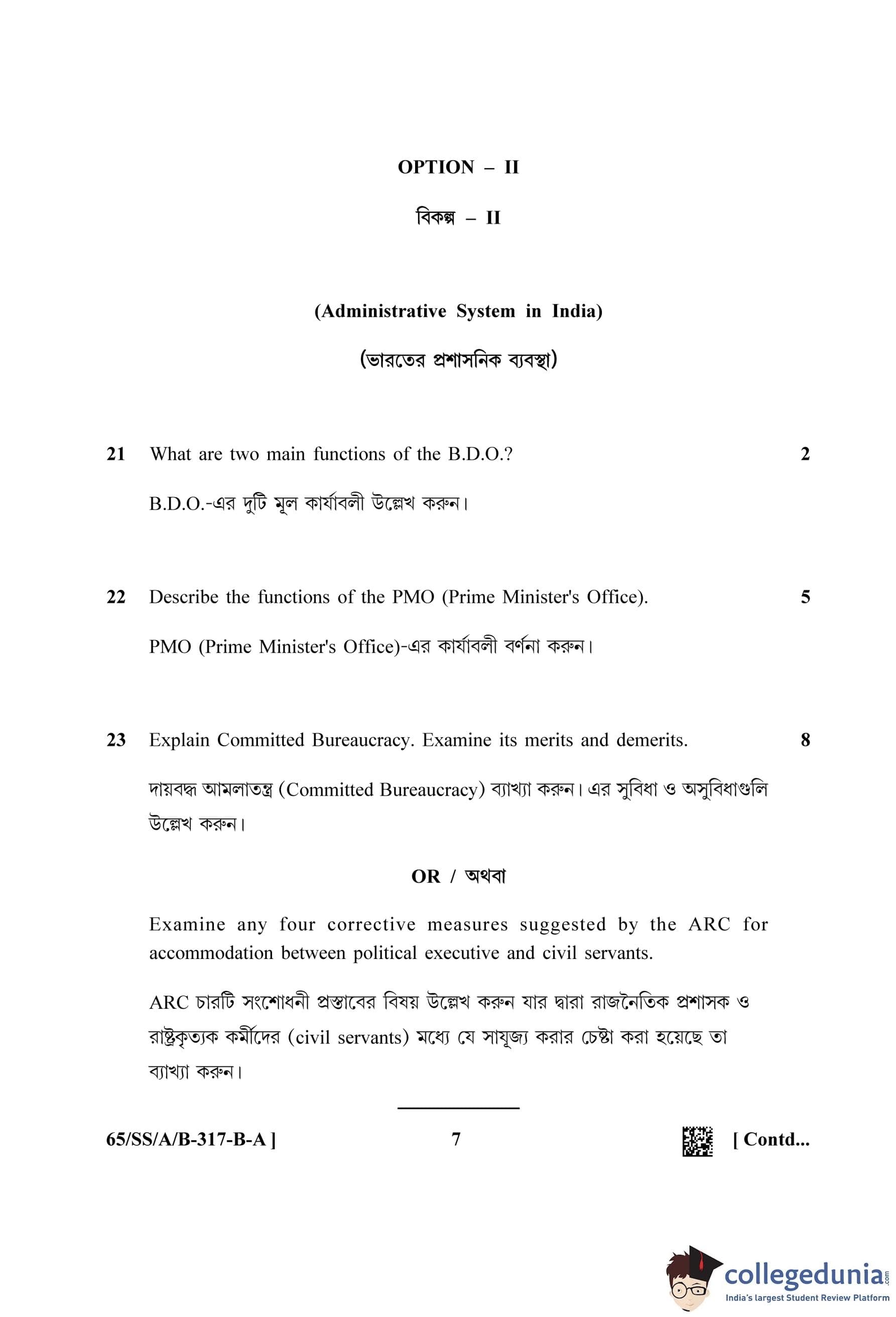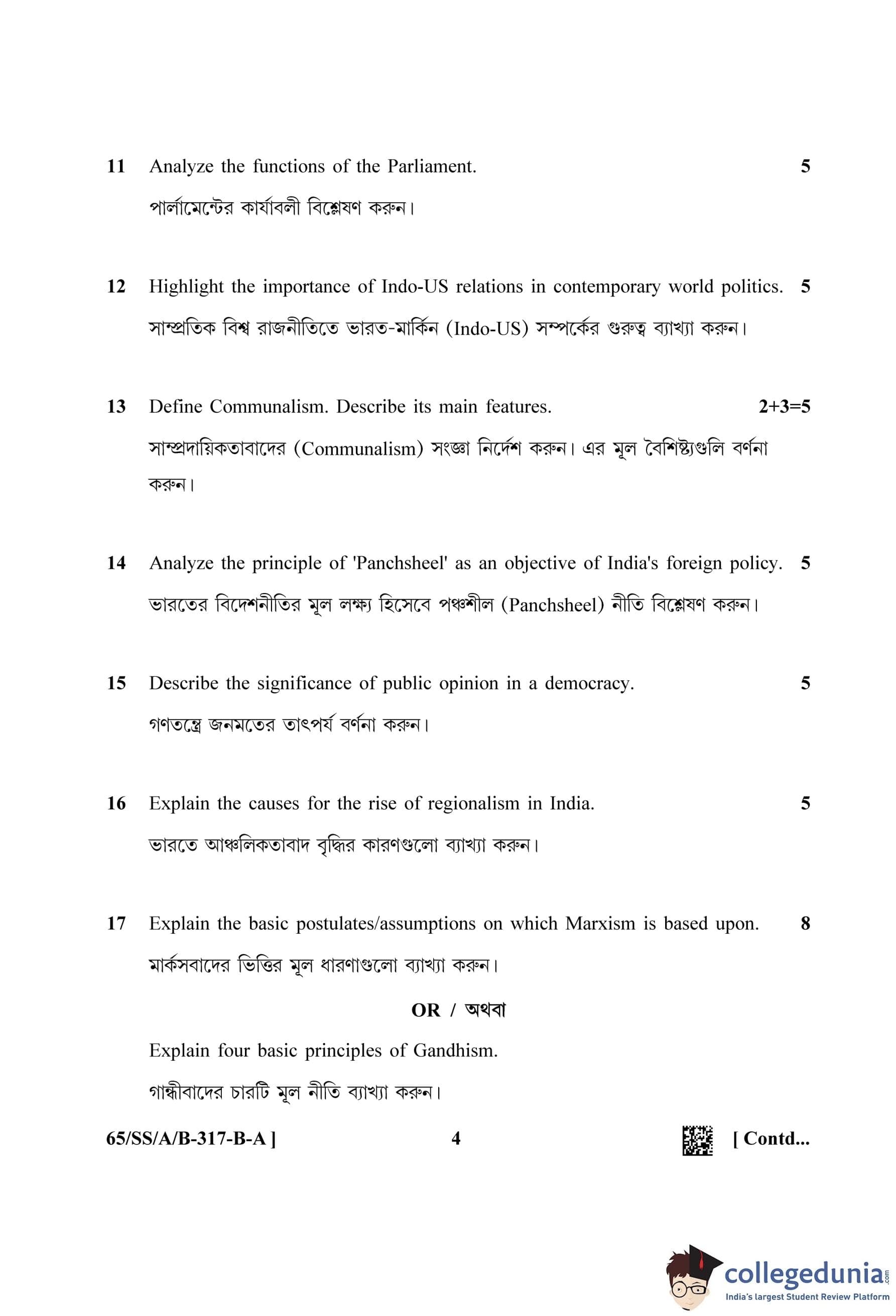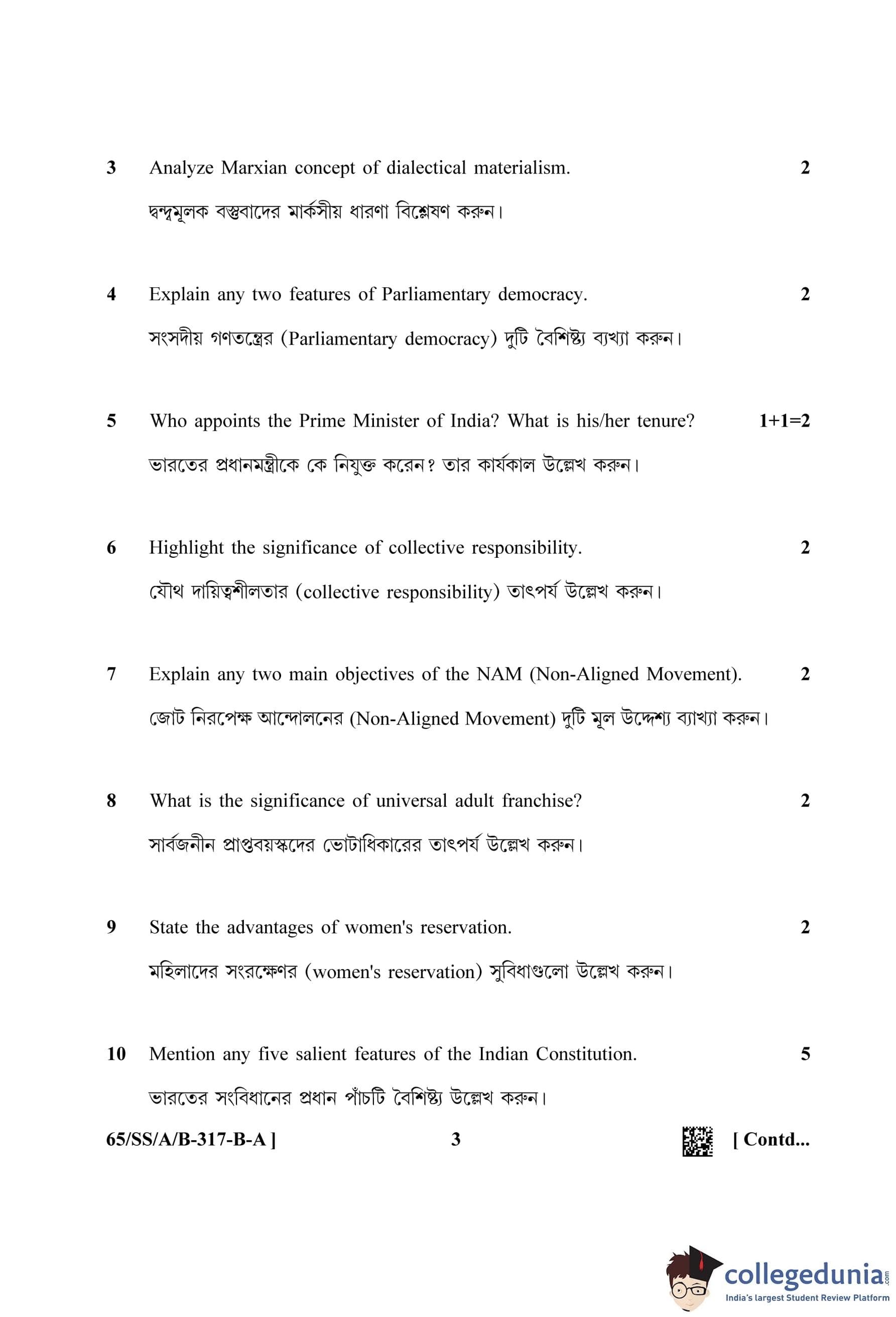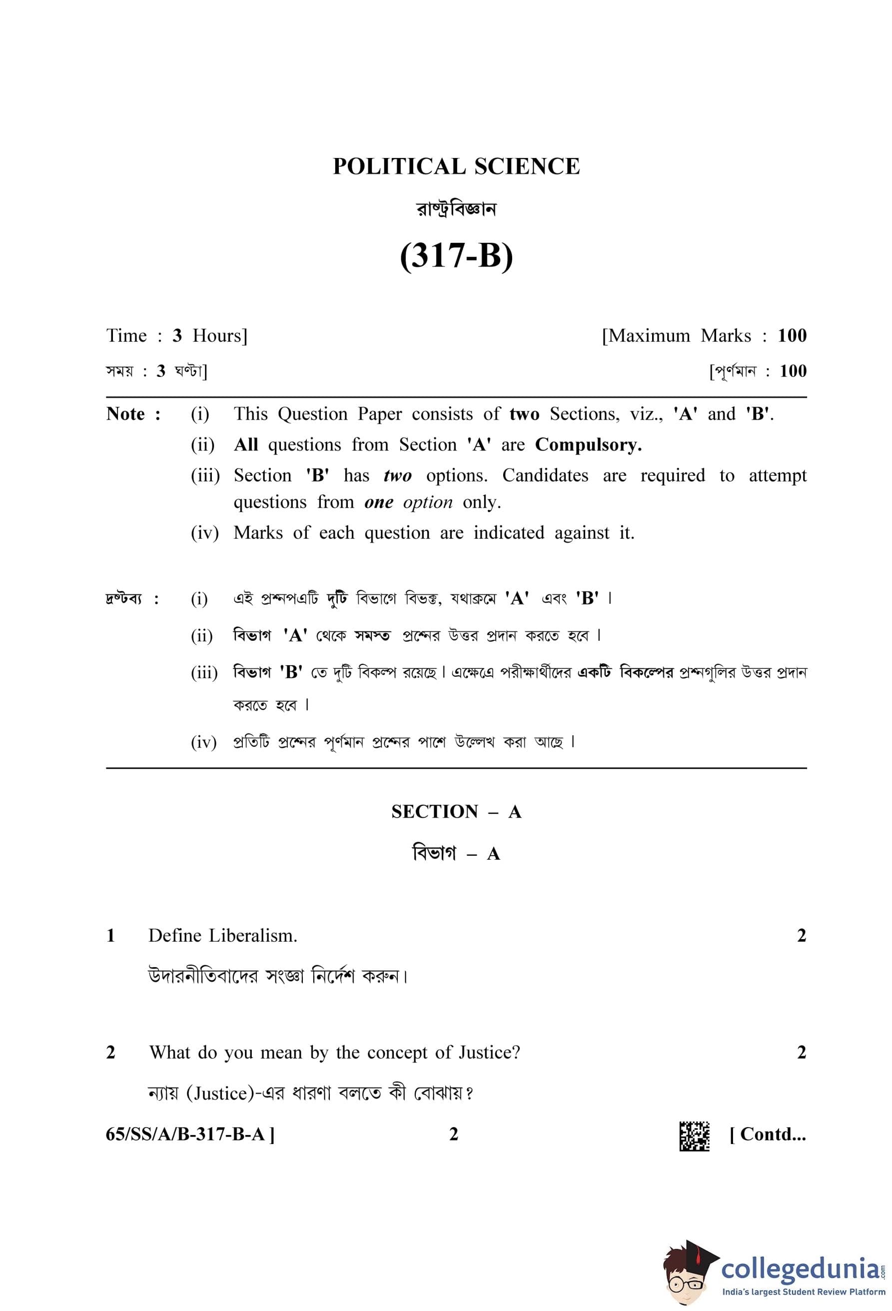 NIOS Class 12 Political Science Bengali Question Paper 2023 with Answer Key Set A