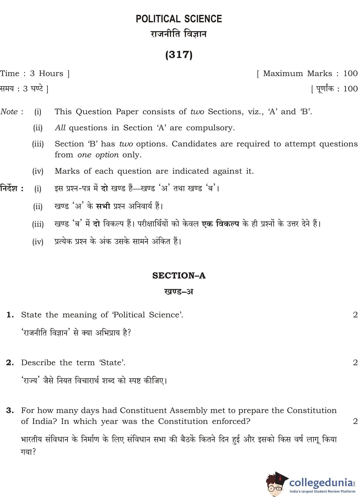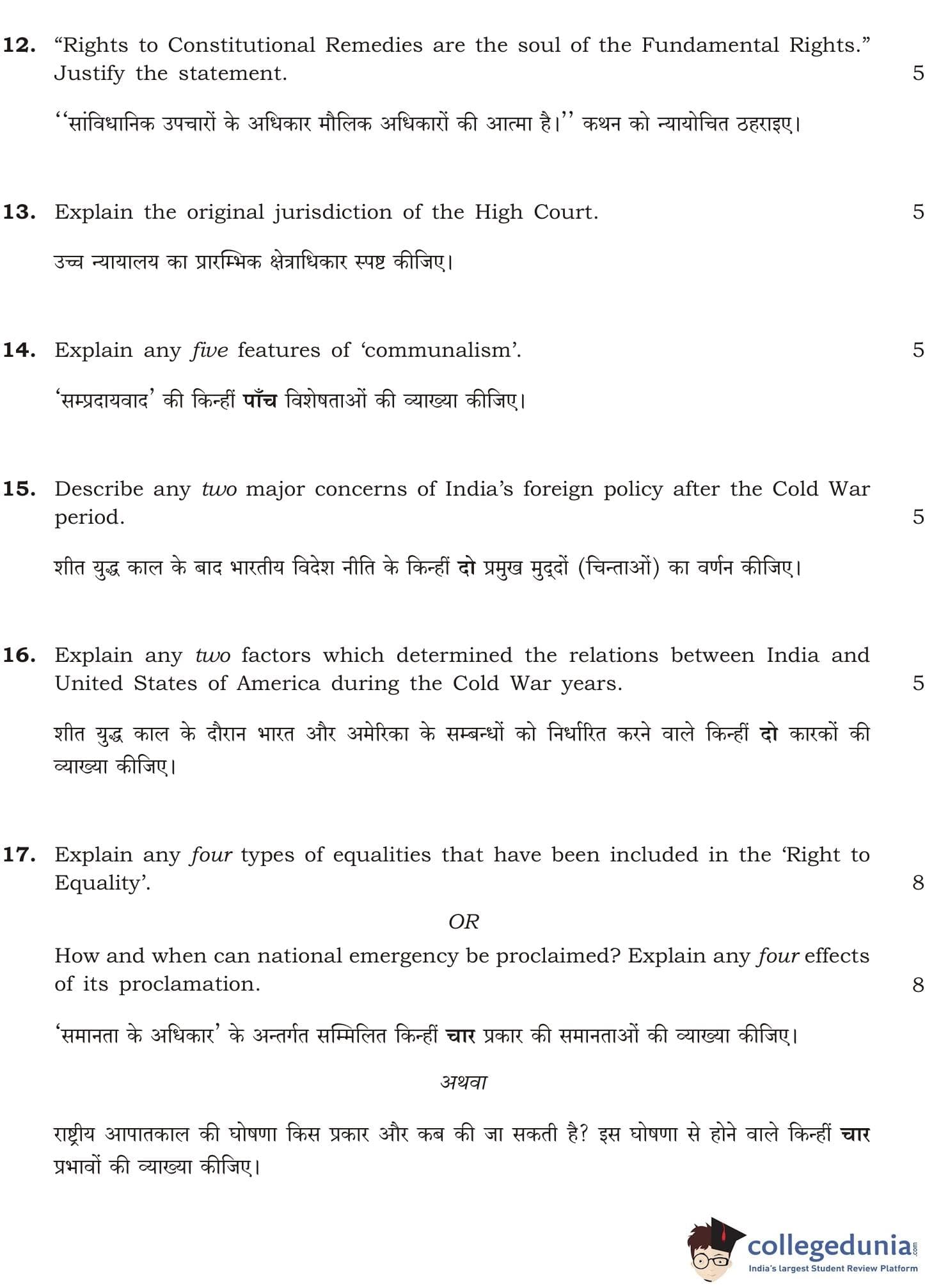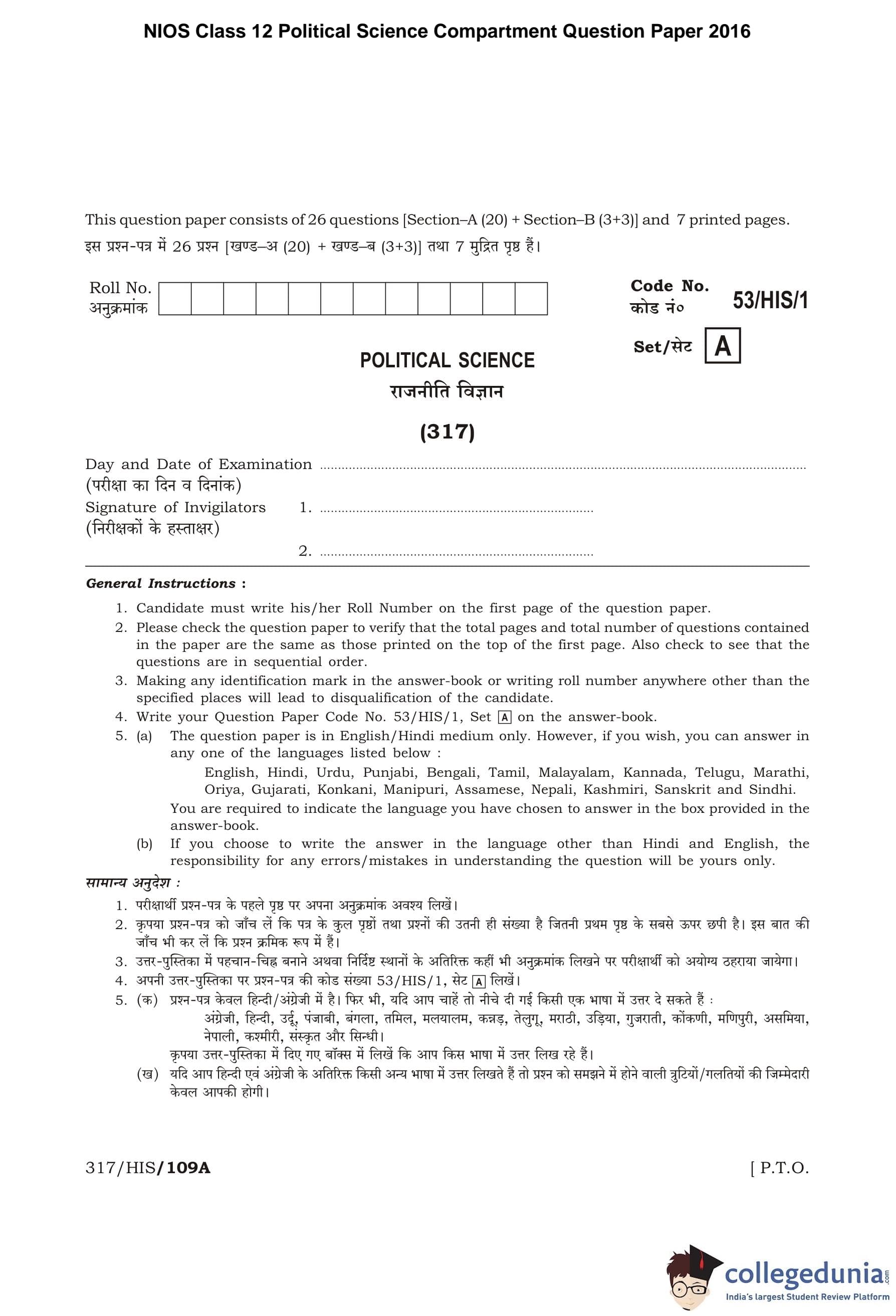 NIOS Class 12 Political Science Compartment Question Paper 2016 with Answer Key pdf is available for download here. The exam was conducted by National Institute of Open Schooling on October 26, 2016 in the Afternoon Session 3 PM to 6 PM. The question paper comprised a total of 23 questions divided among 2 sections.