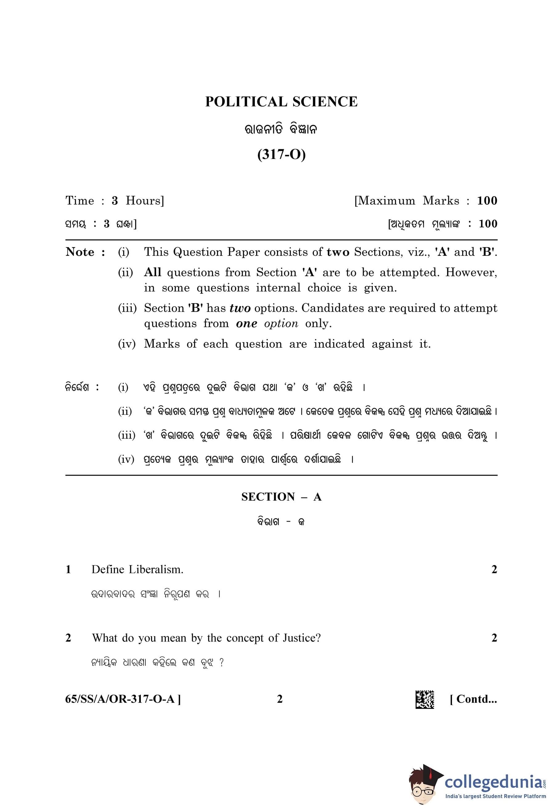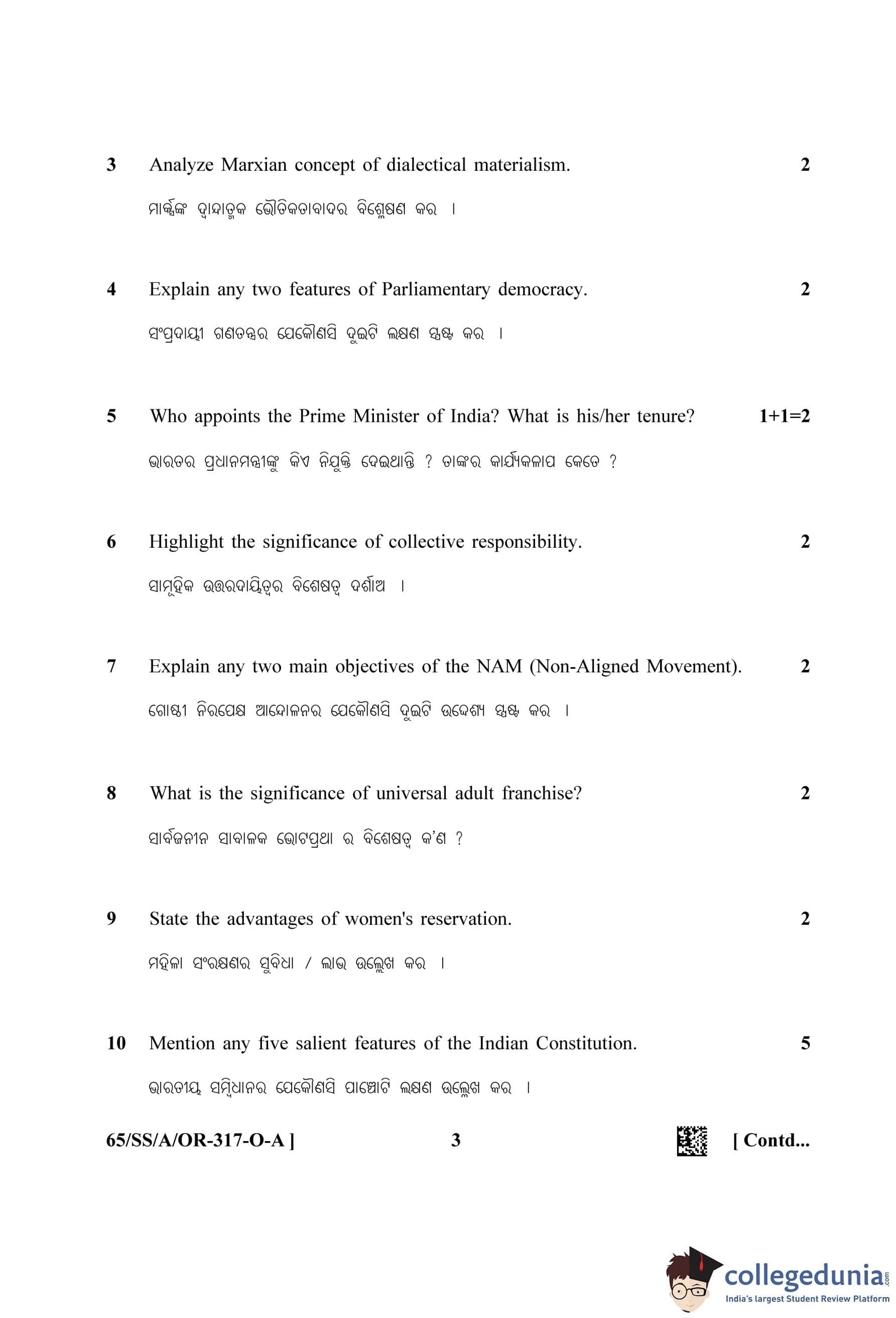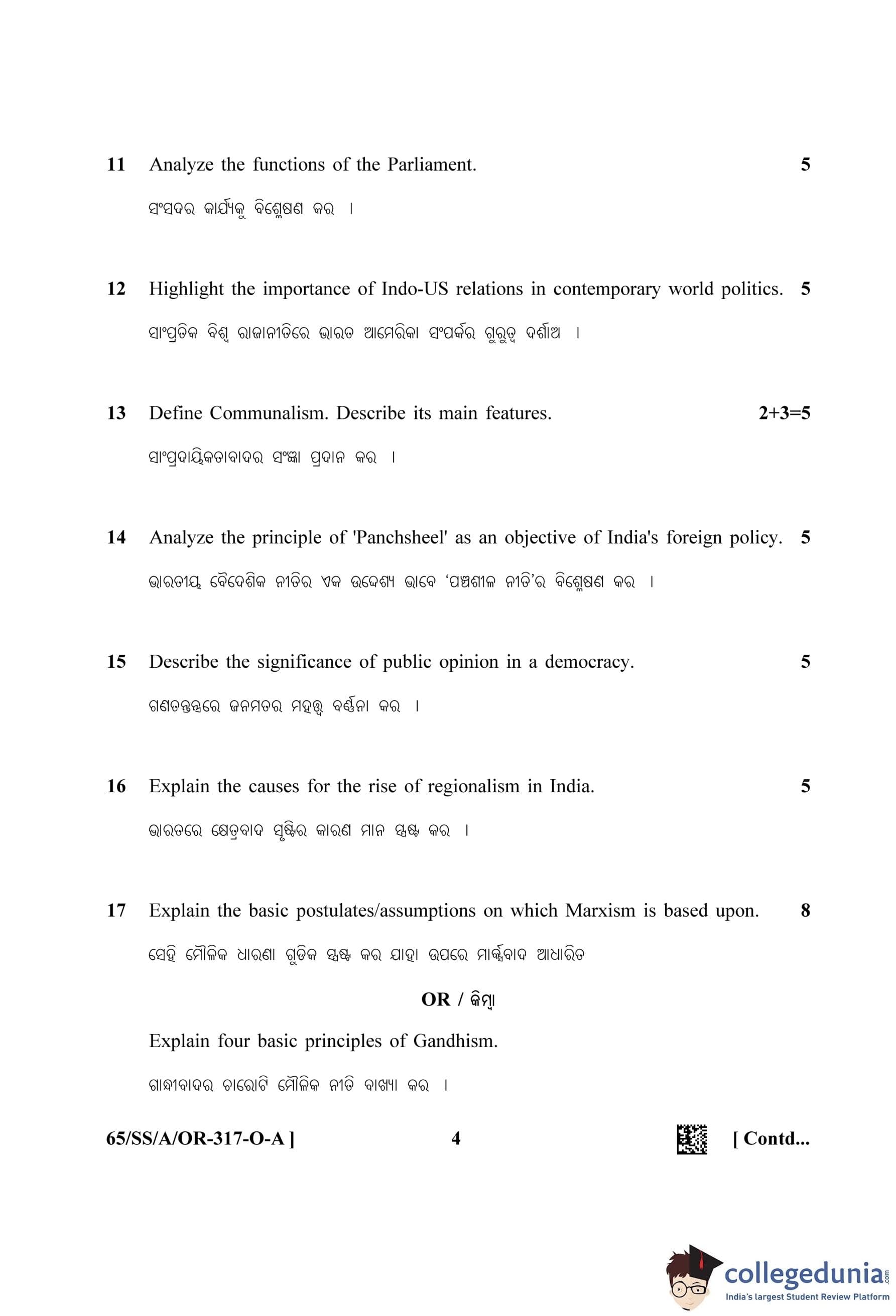 NIOS Class 12 Political Science Oriya (Set A) Question Paper 2023 with Answer Key