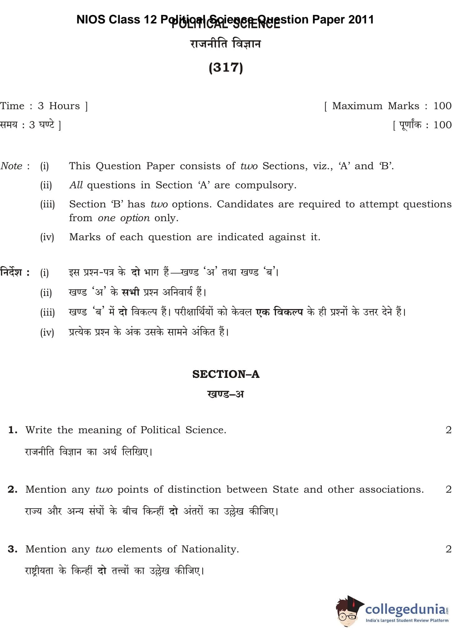 NIOS Class 12 Political Science Question Paper 2011 with Answer Key pdf is available for download here. The exam was conducted by National Institute of Open Schooling. The question paper comprised a total of 23 questions divided among 2 sections.