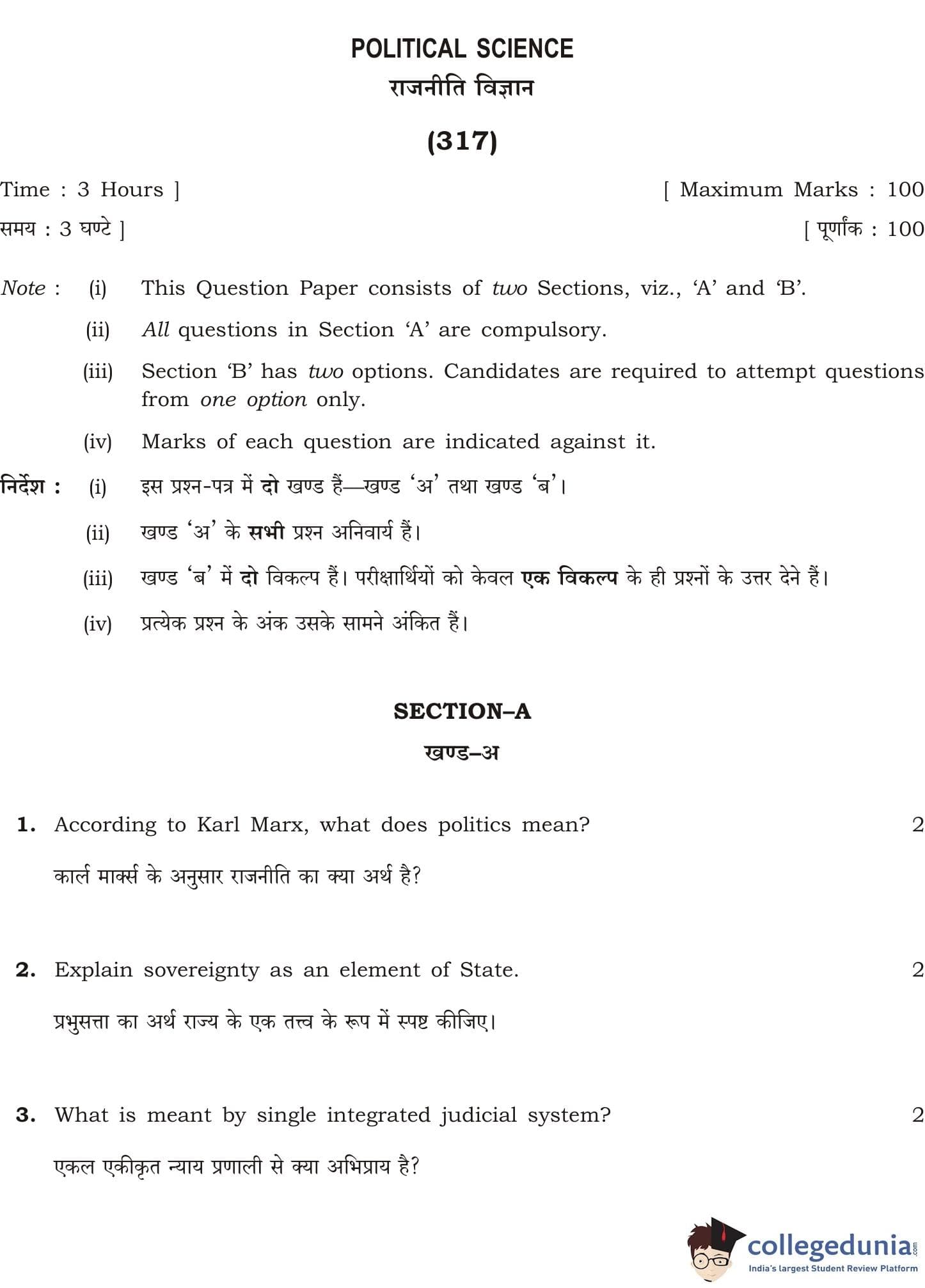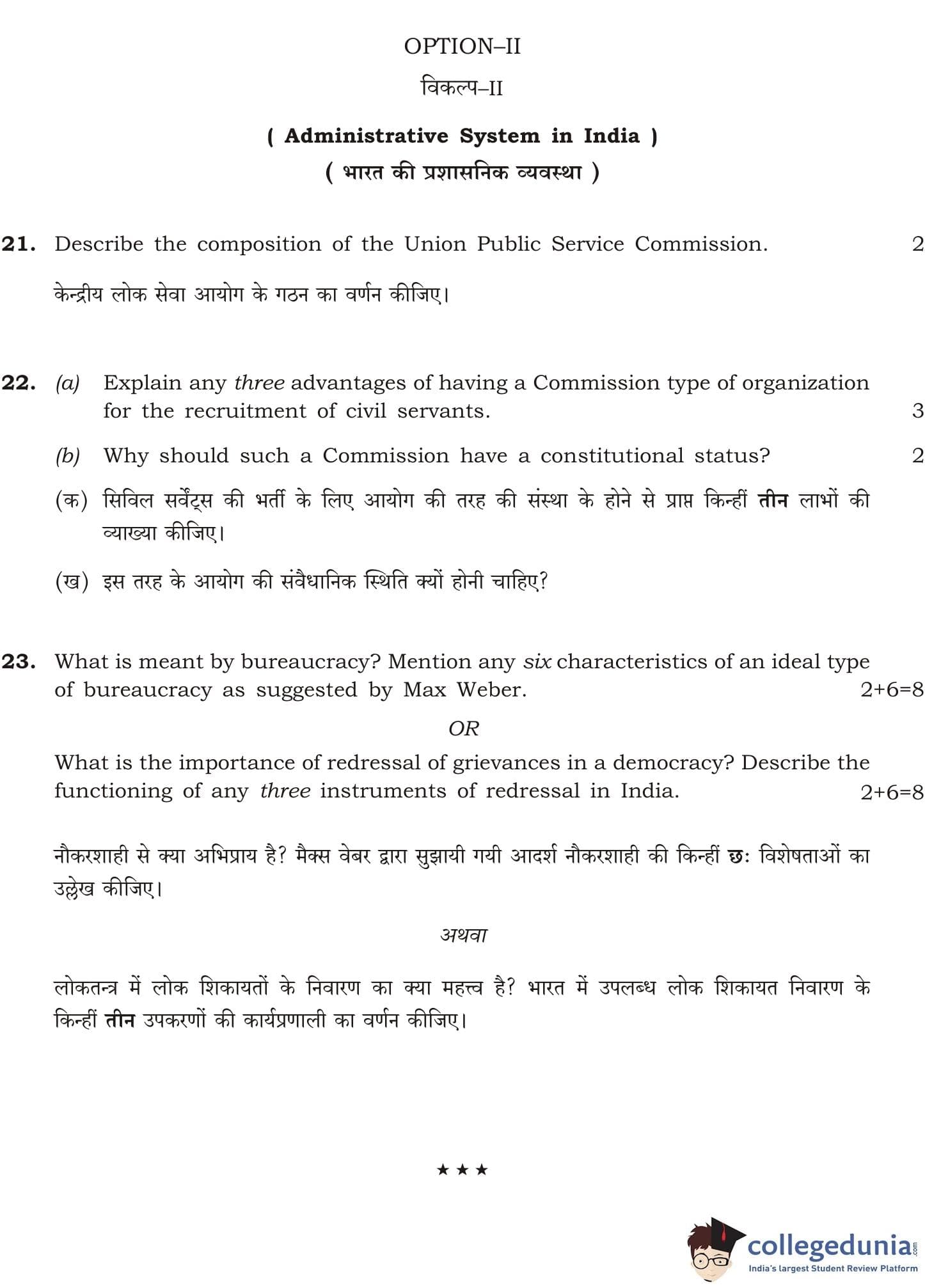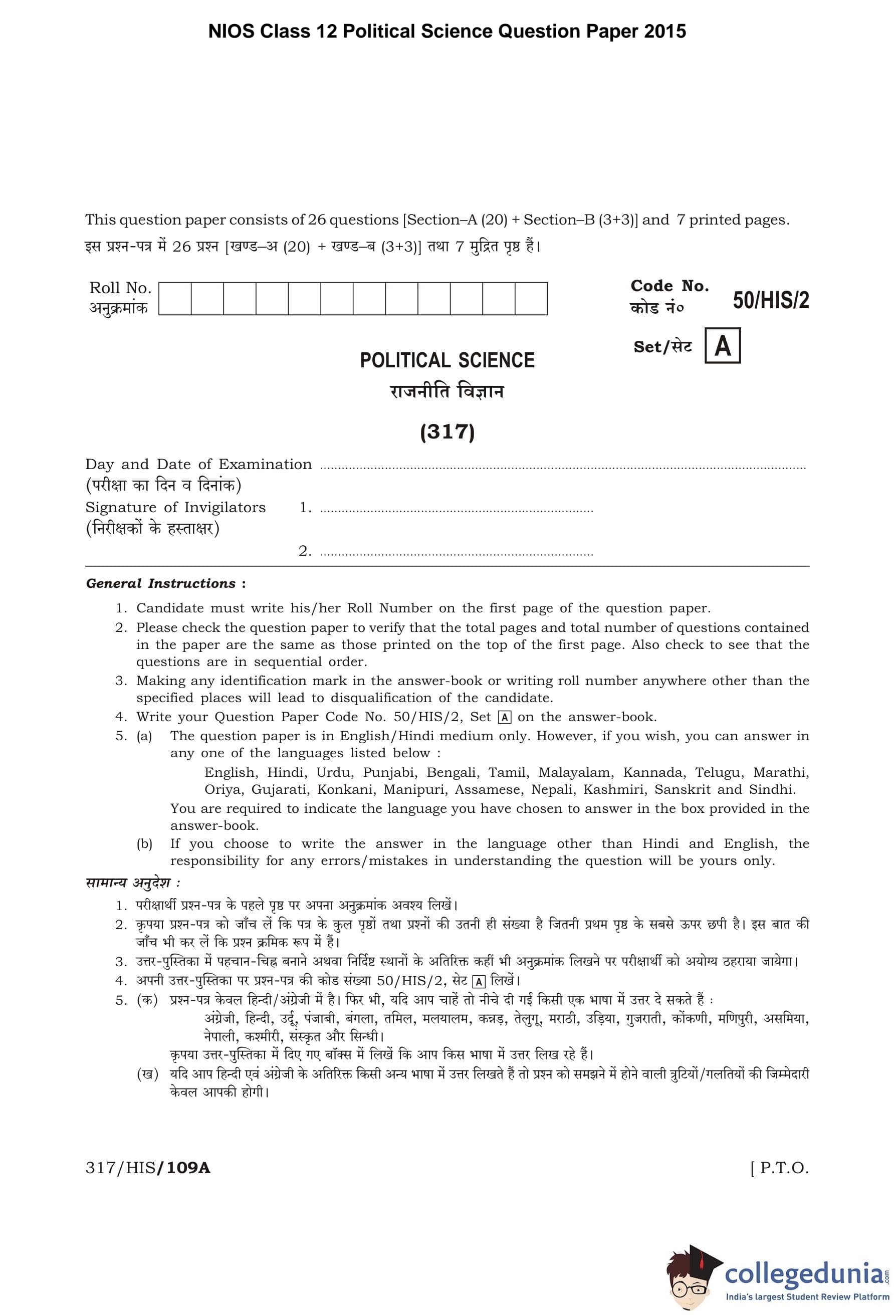 NIOS Class 12 Political Science Question Paper 2015 with Answer Key pdf is available for download here. The exam was conducted by National Institute of Open Schooling on April 24, 2015 in the Afternoon Session 2:30 PM to 5:30 PM. The question paper comprised a total of 23 questions divided among 2 sections.
