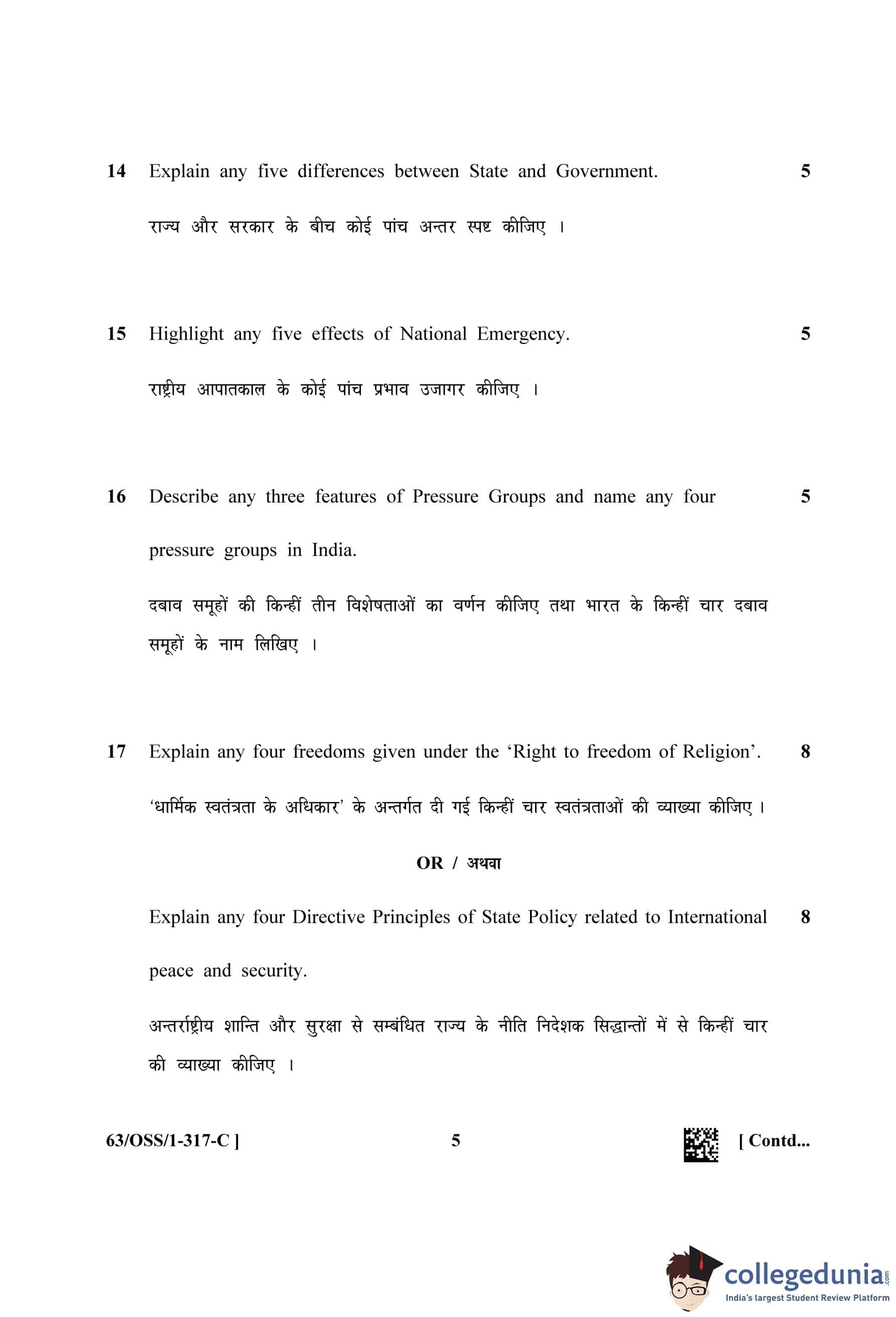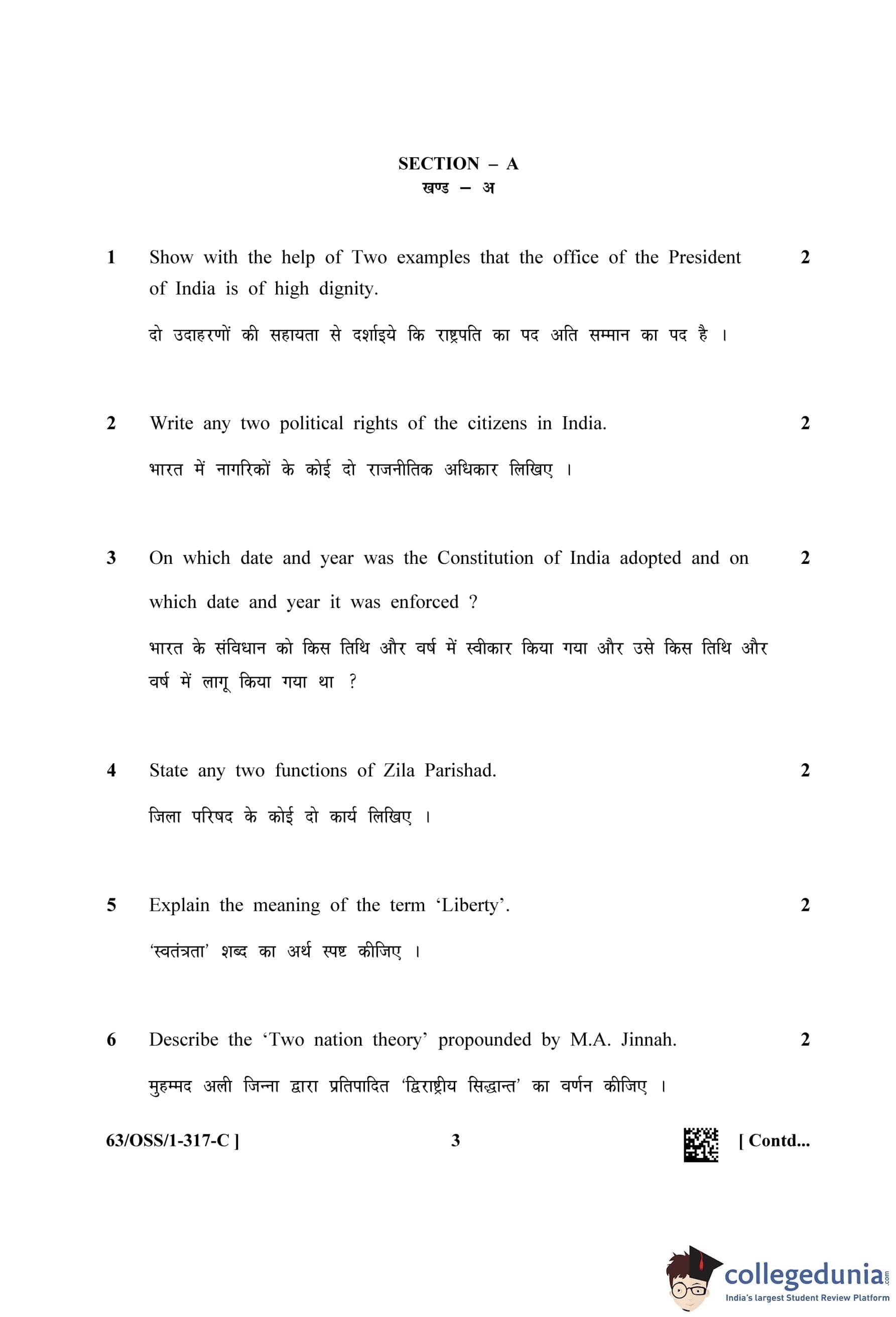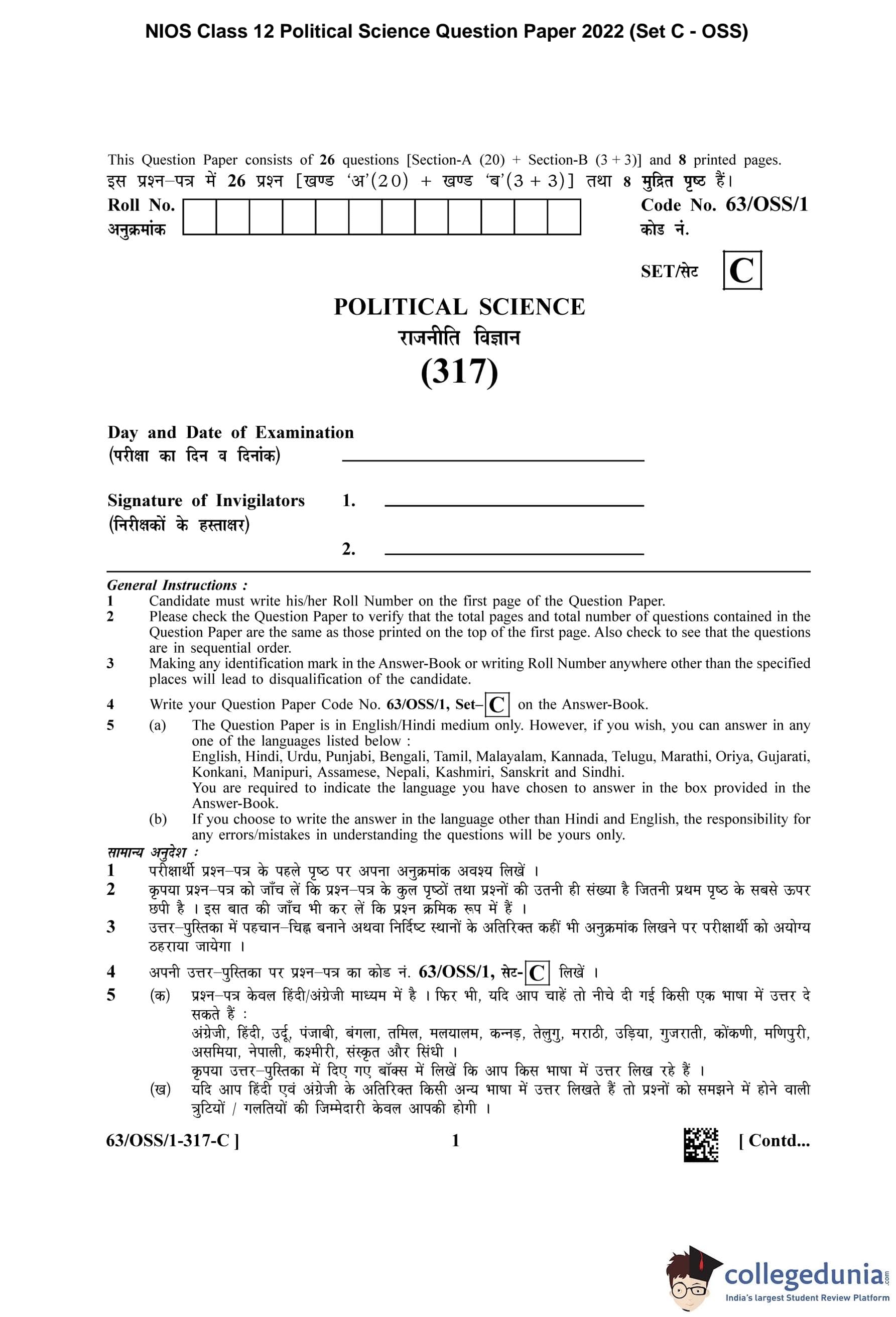 NIOS Class 12 Political Science (Set C - OSS) Question Paper 2022 with Answer Key