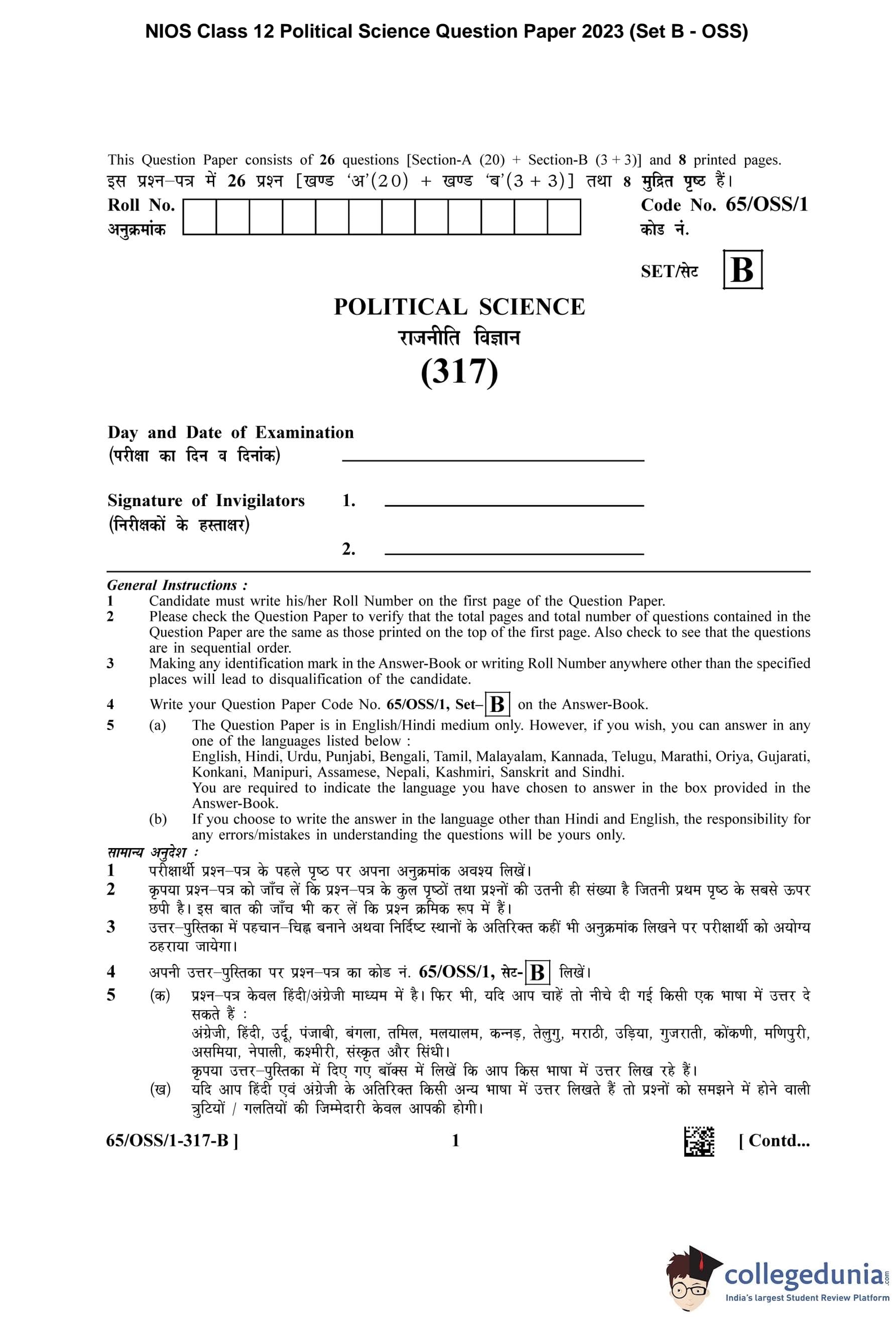 NIOS Class 12 Political Science Question Paper 2023 with Answer Key pdf (Set B - OSS) is available for download here. The exam was conducted by National Institute of Open Schooling on April 19, 2023 in the Afternoon Session 2.30 PM to 5.30 PM. The question paper comprised a total of 26 questions divided among 2 sections.
