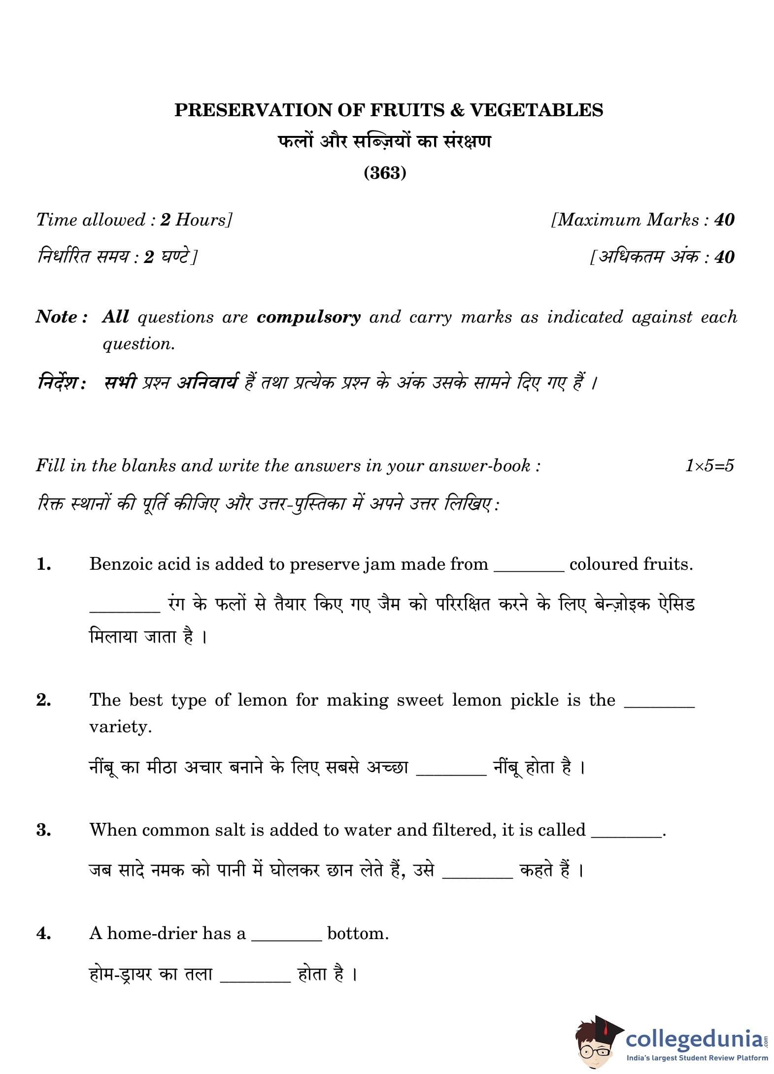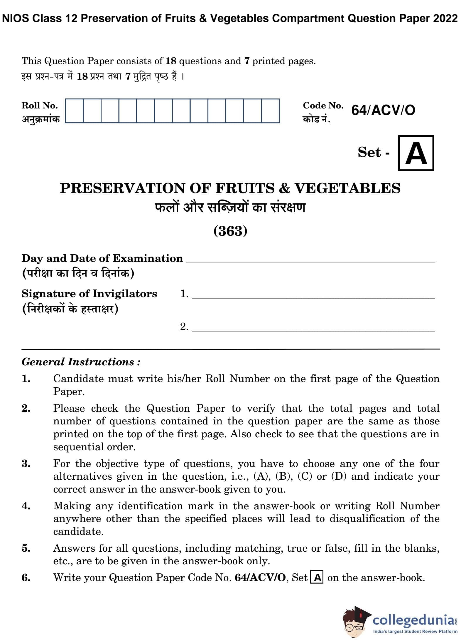 NIOS Class 12 Preservation of Fruits & Vegetables Compartment Question Paper 2022 with Answer Key pdf is available for download here. The exam was conducted by National Institute of Open Schooling on November 23, 2022 in the Afternoon Session 2:30 PM to 4:30 PM. The question paper comprised a total of 18 questions.