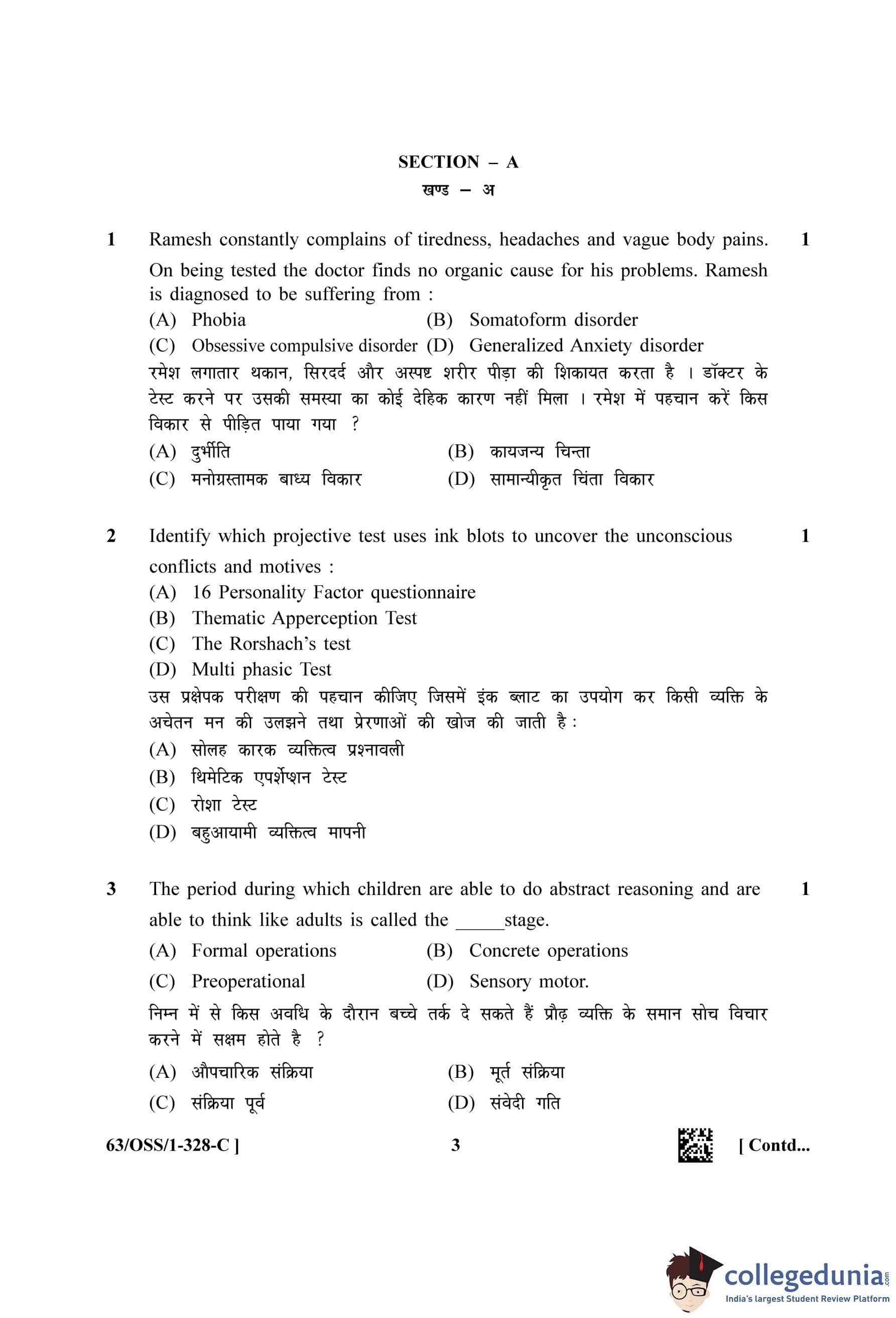 NIOS Class 12 Psychology Question Paper 2022 with Answer Key pdf (Set C - OSS) is available for download here. The exam was conducted by National Institute of Open Schooling on April 11, 2022 in the Afternoon Session 2:30 PM to 5:30 PM. The question paper comprised a total of 30 questions divided among 2 sections.