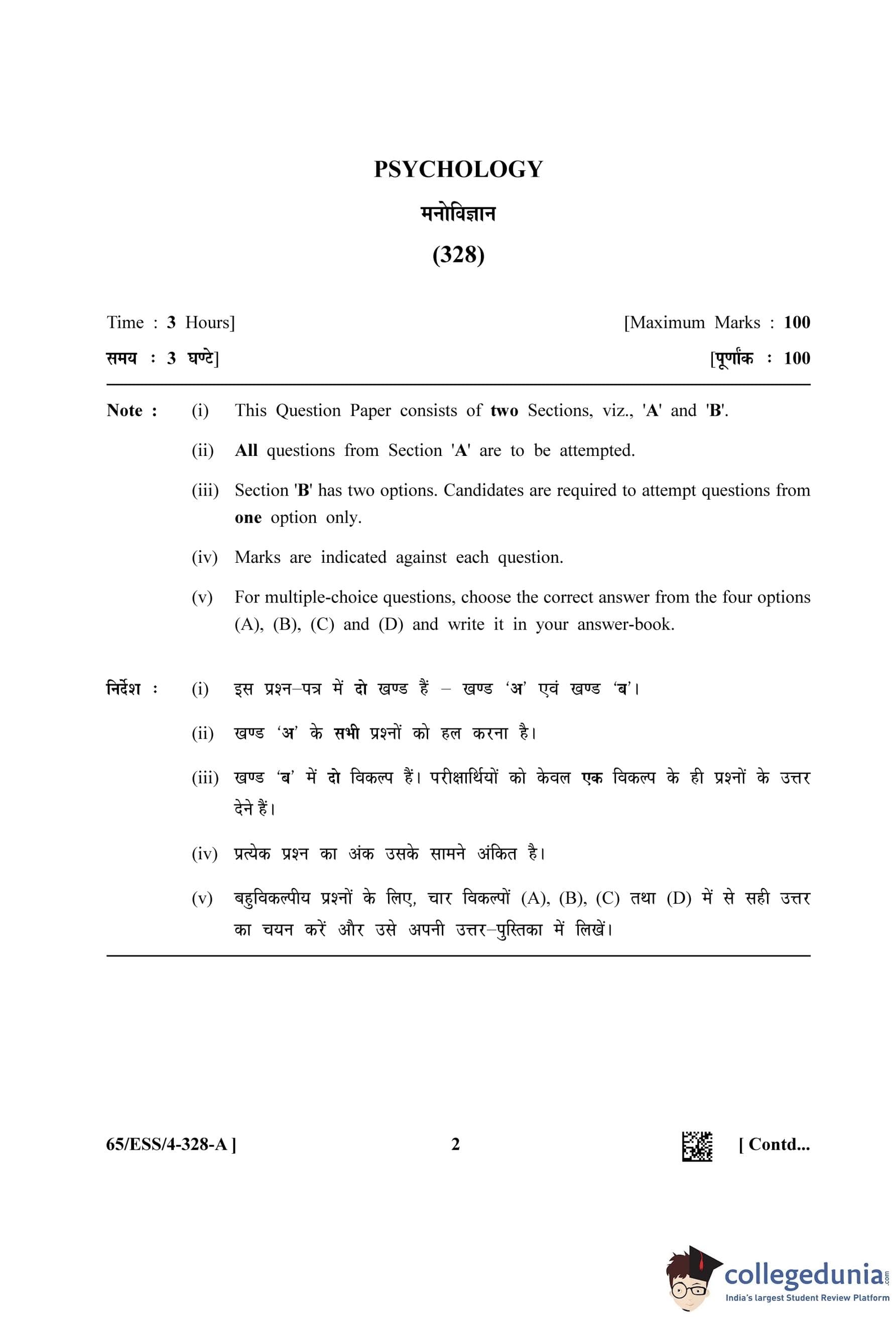 NIOS Class 12 Psychology Question Paper 2023 with Answer Key pdf (Set A - ESS) is available for download here. The exam was conducted by National Institute of Open Schooling on April 27, 2023 in the Afternoon Session 2.30 PM to 5.30 PM. The question paper comprised a total of 35 questions divided among 2 sections.