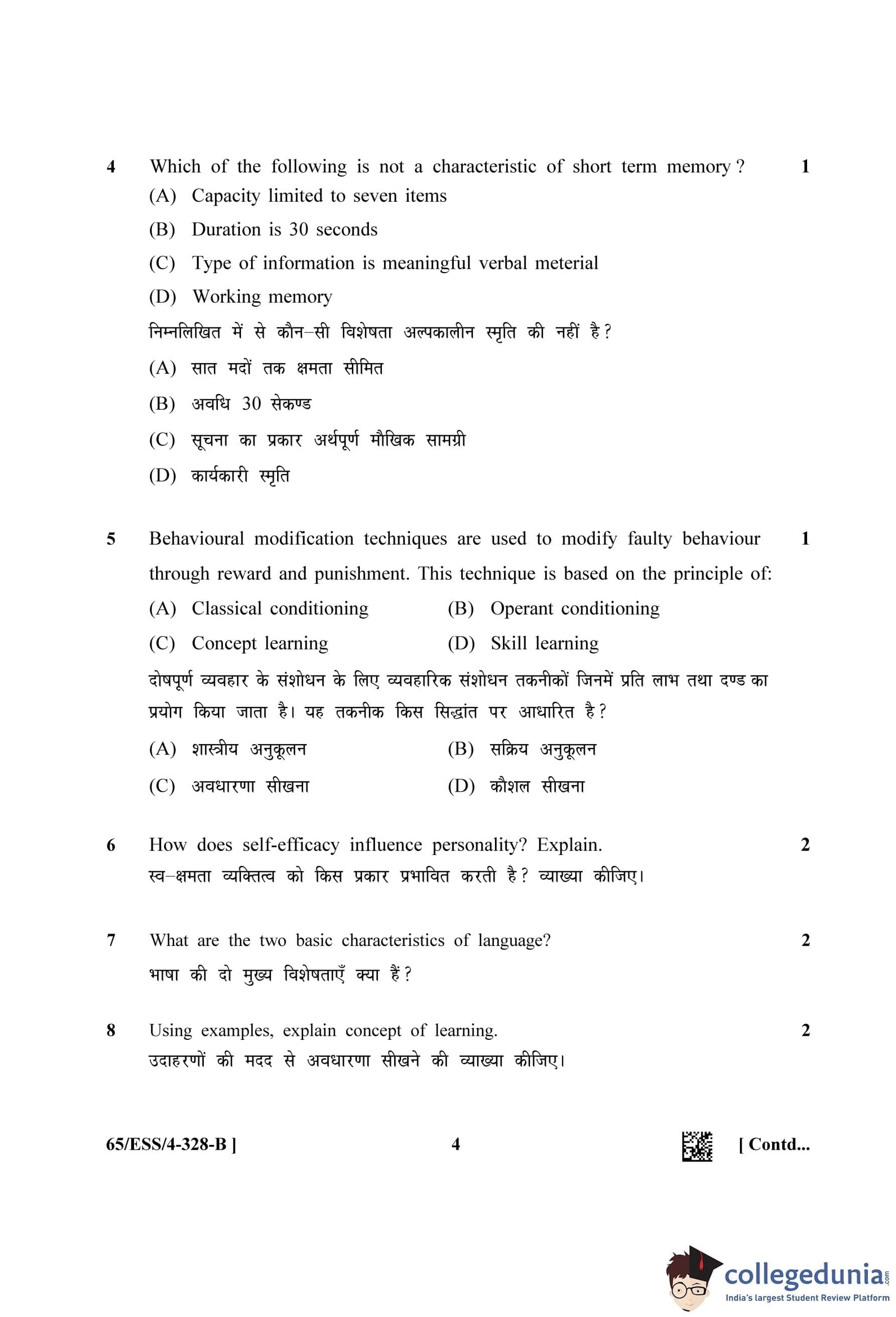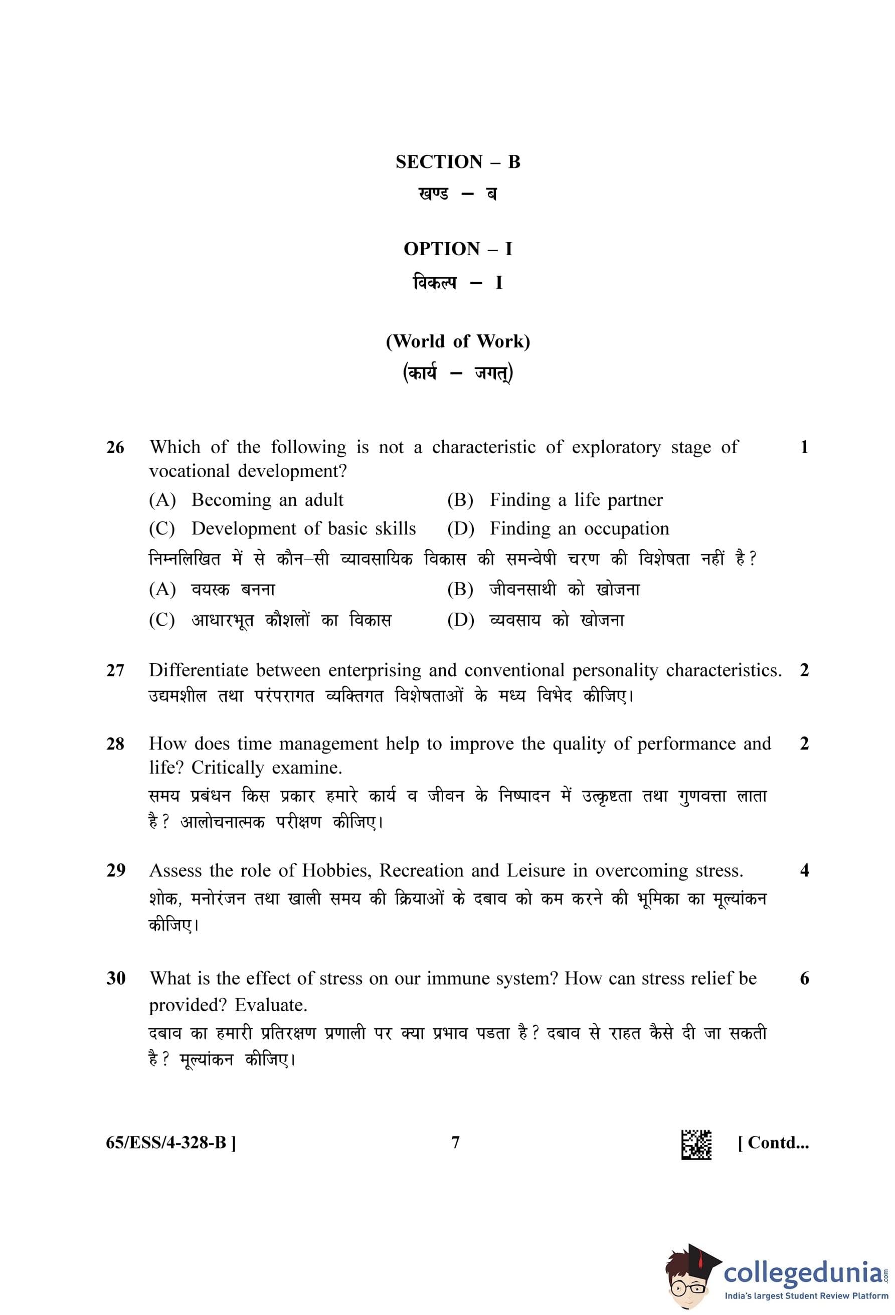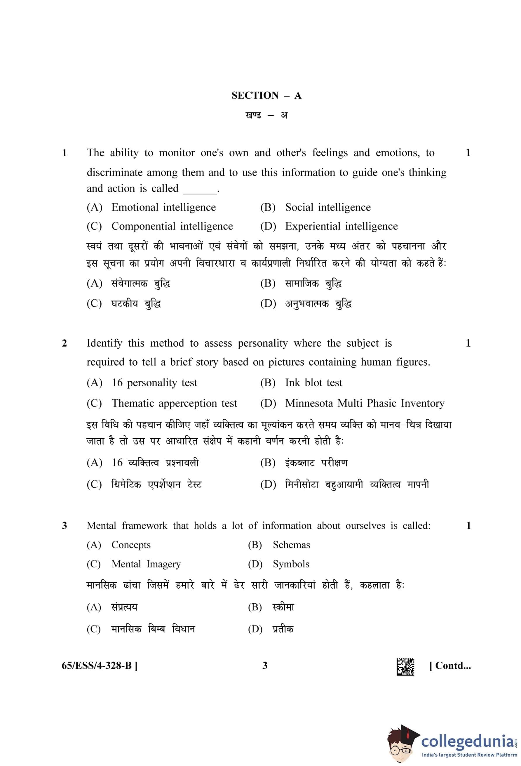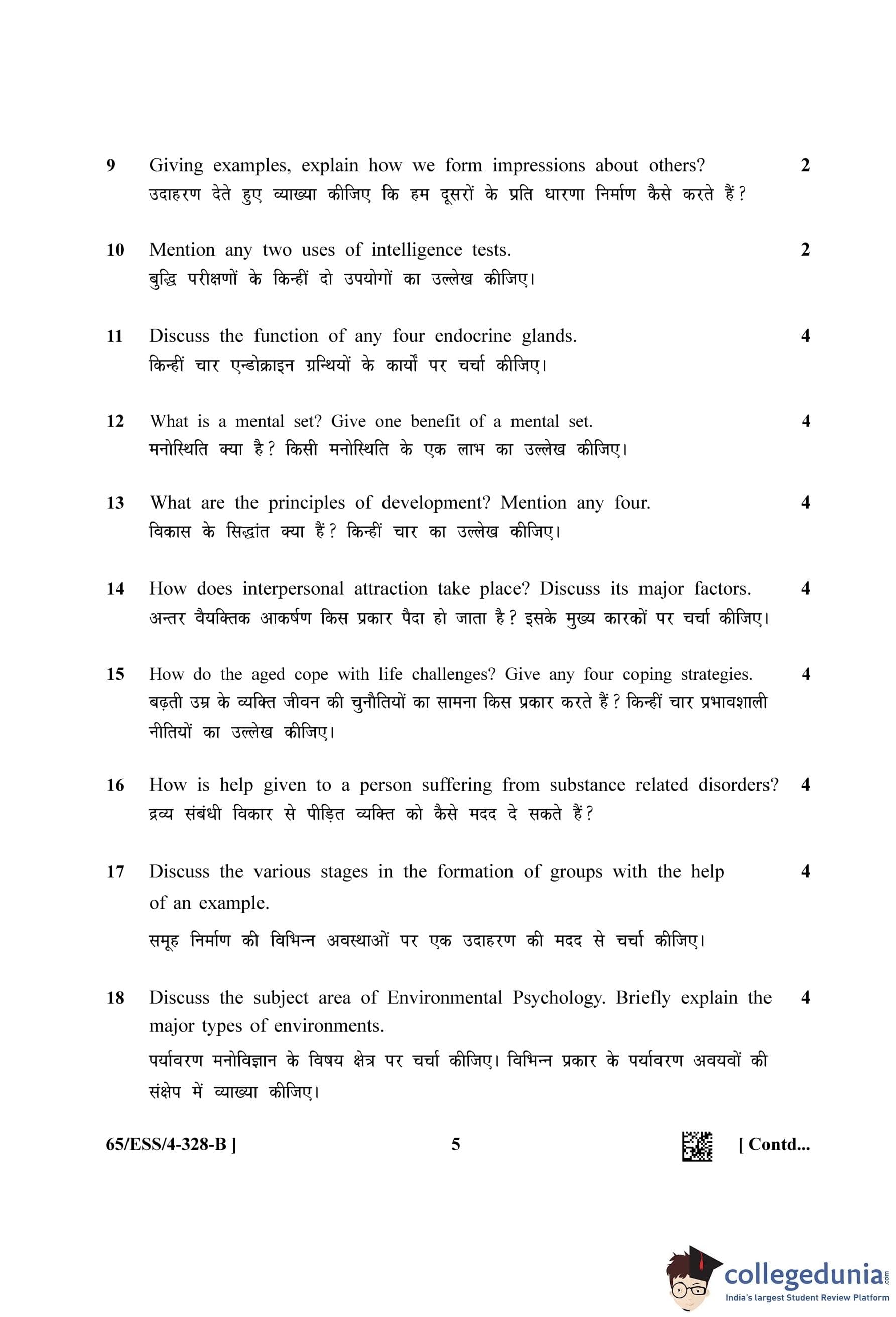 NIOS Class 12 Psychology (Set B - ESS) Question Paper 2023 with Answer Key