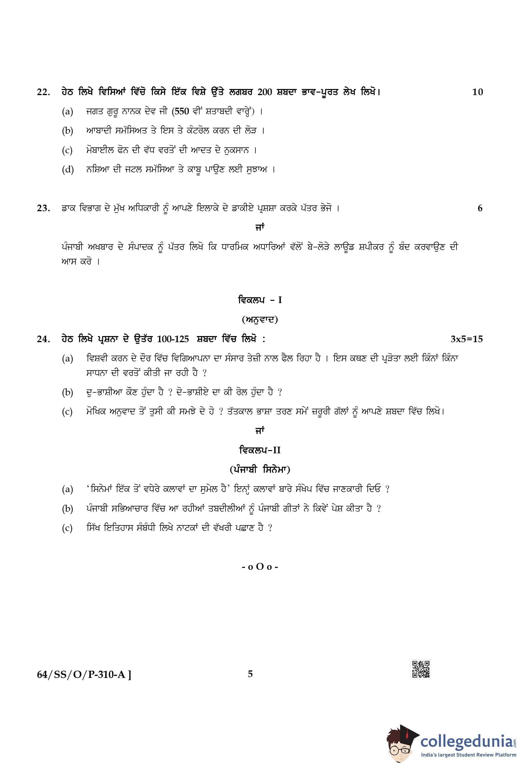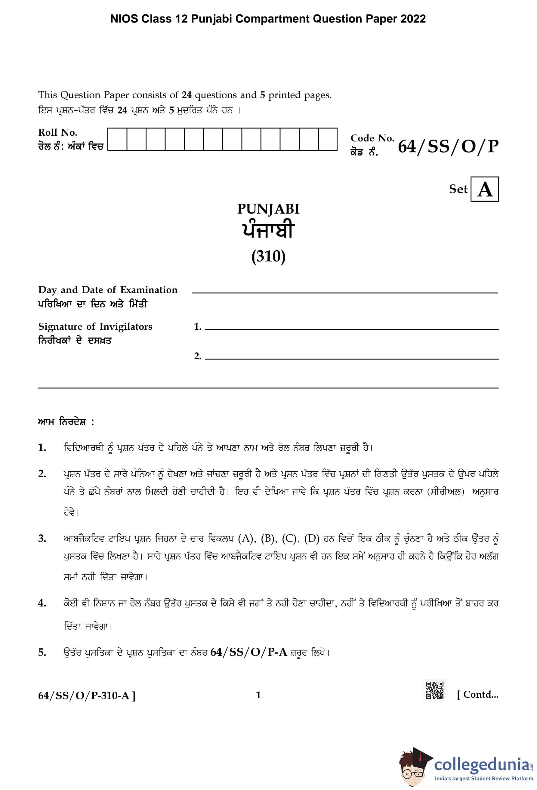 NIOS Class 12 Punjabi Compartment Question Paper 2022 with Answer Key pdf is available for download here. The exam was conducted by National Institute of Open Schooling on October 29, 2022 in the Afternoon Session 2:30 PM to 5:30 PM. The question paper comprised a total of 24 questions.