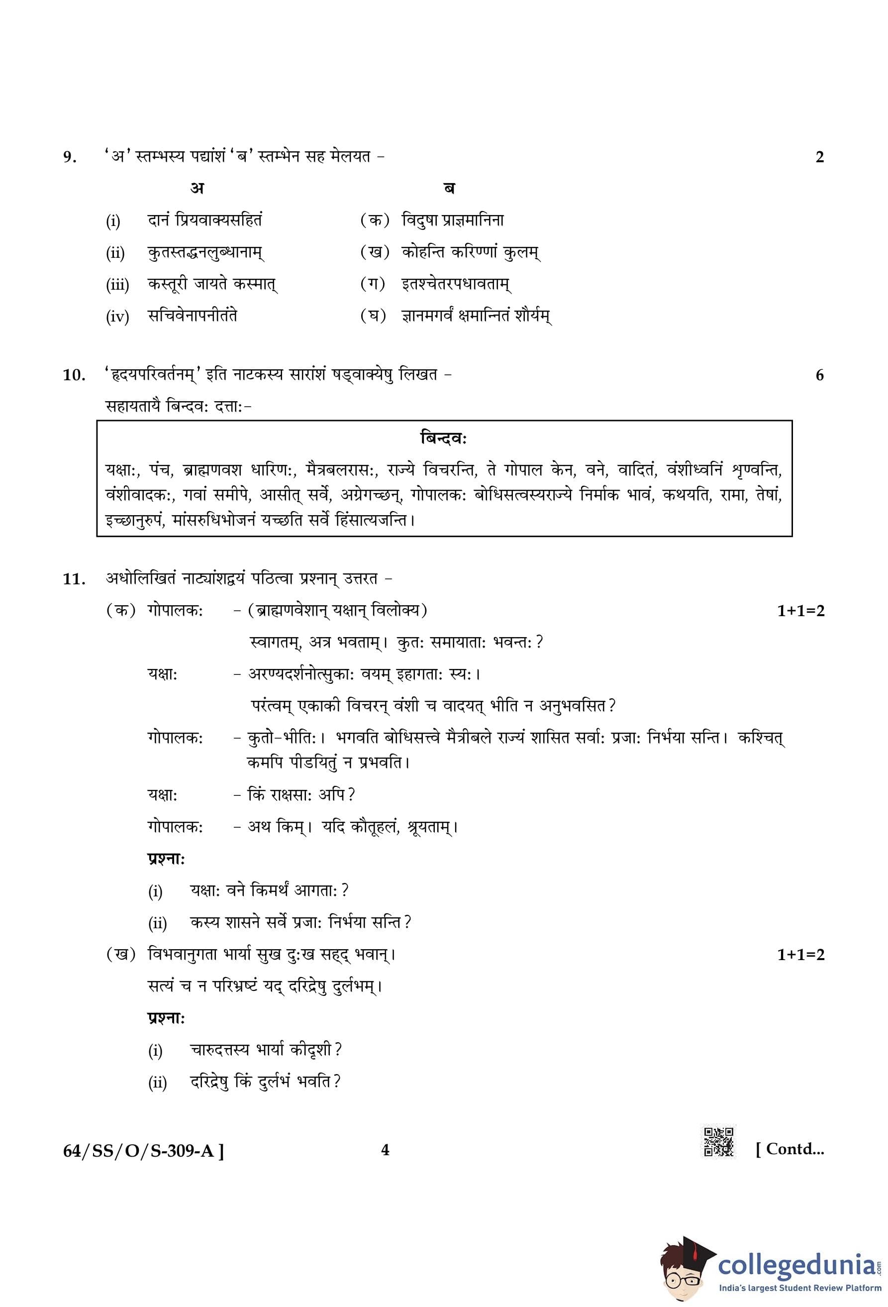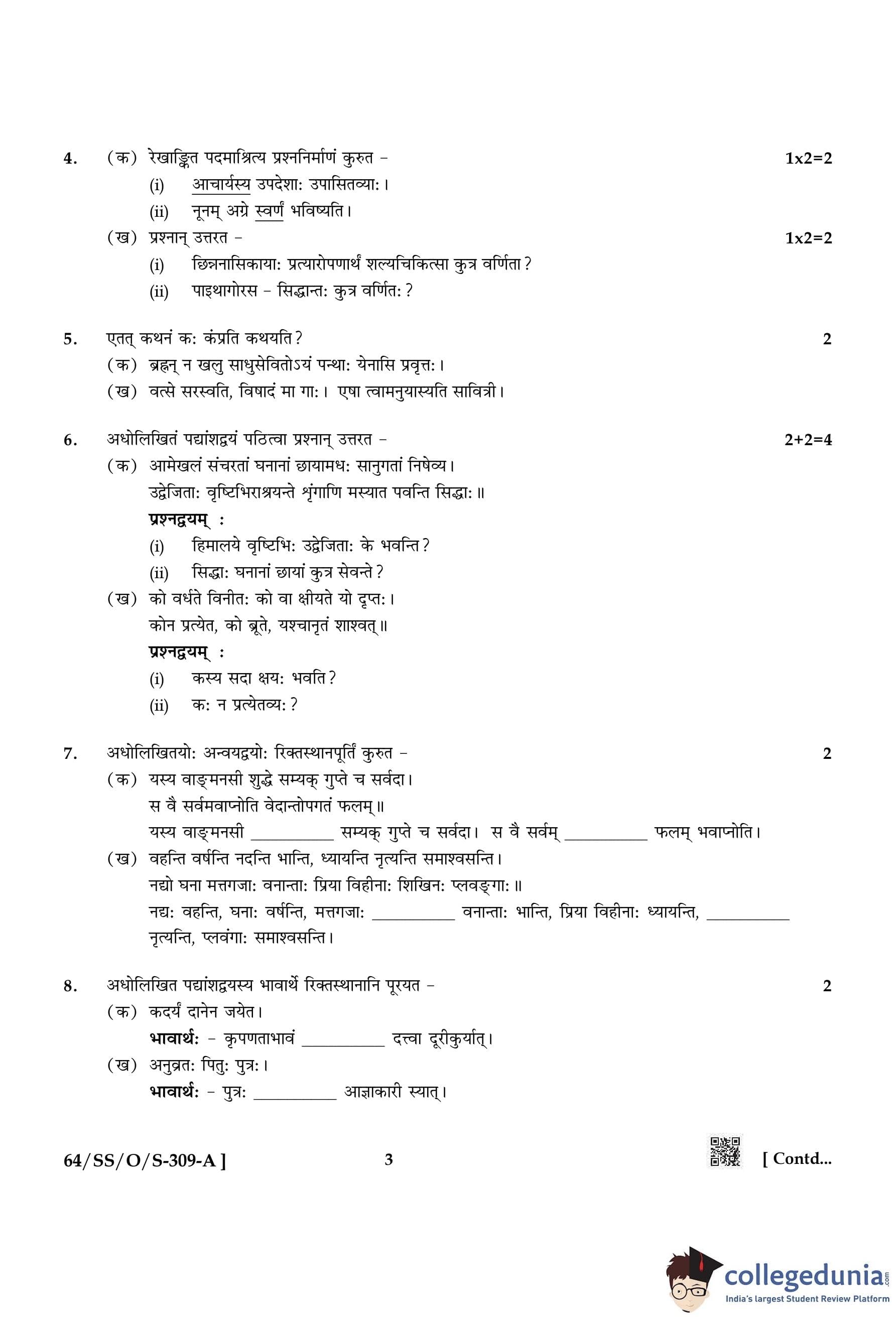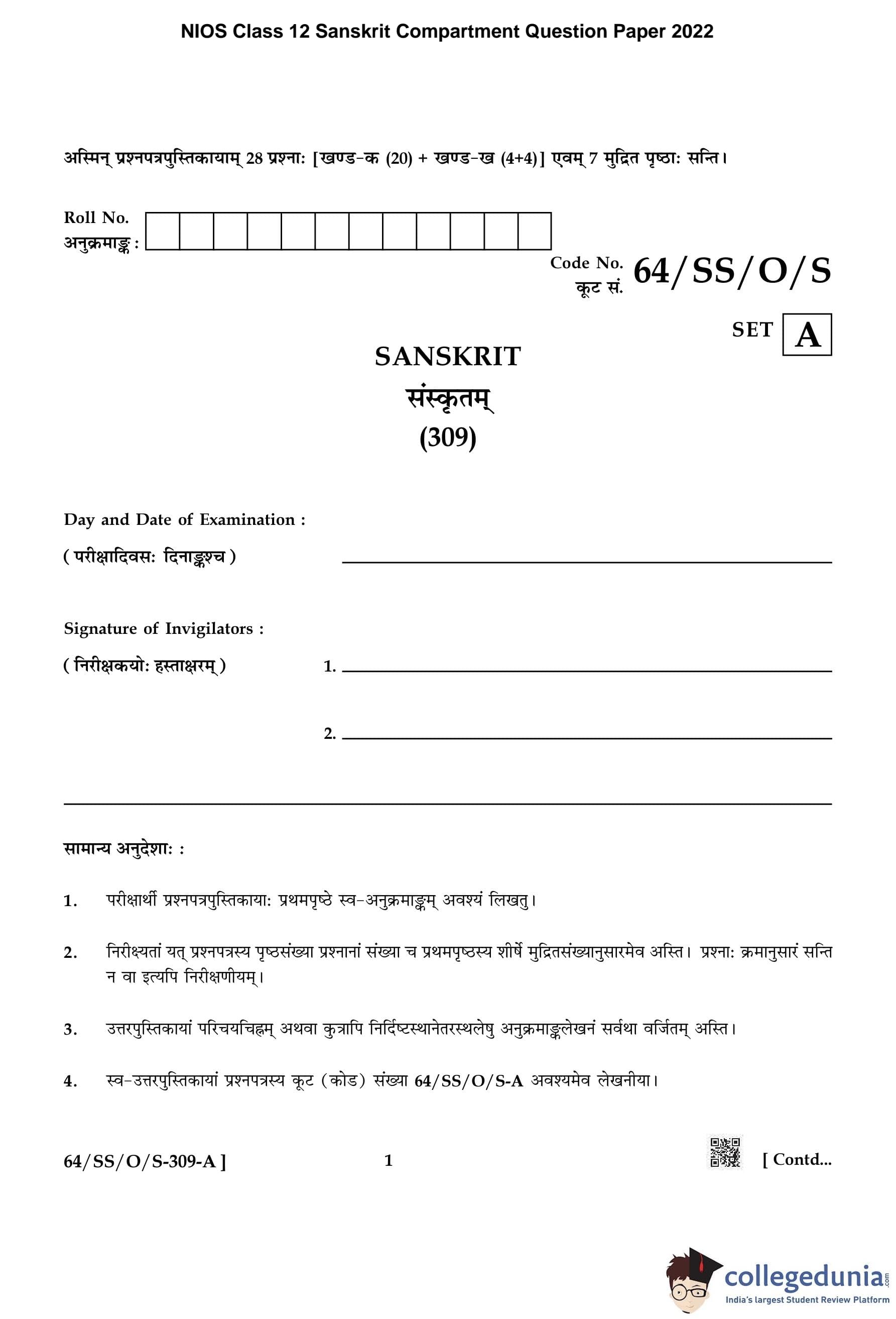 NIOS Class 12 Sanskrit Compartment Question Paper 2022 with Answer Key
