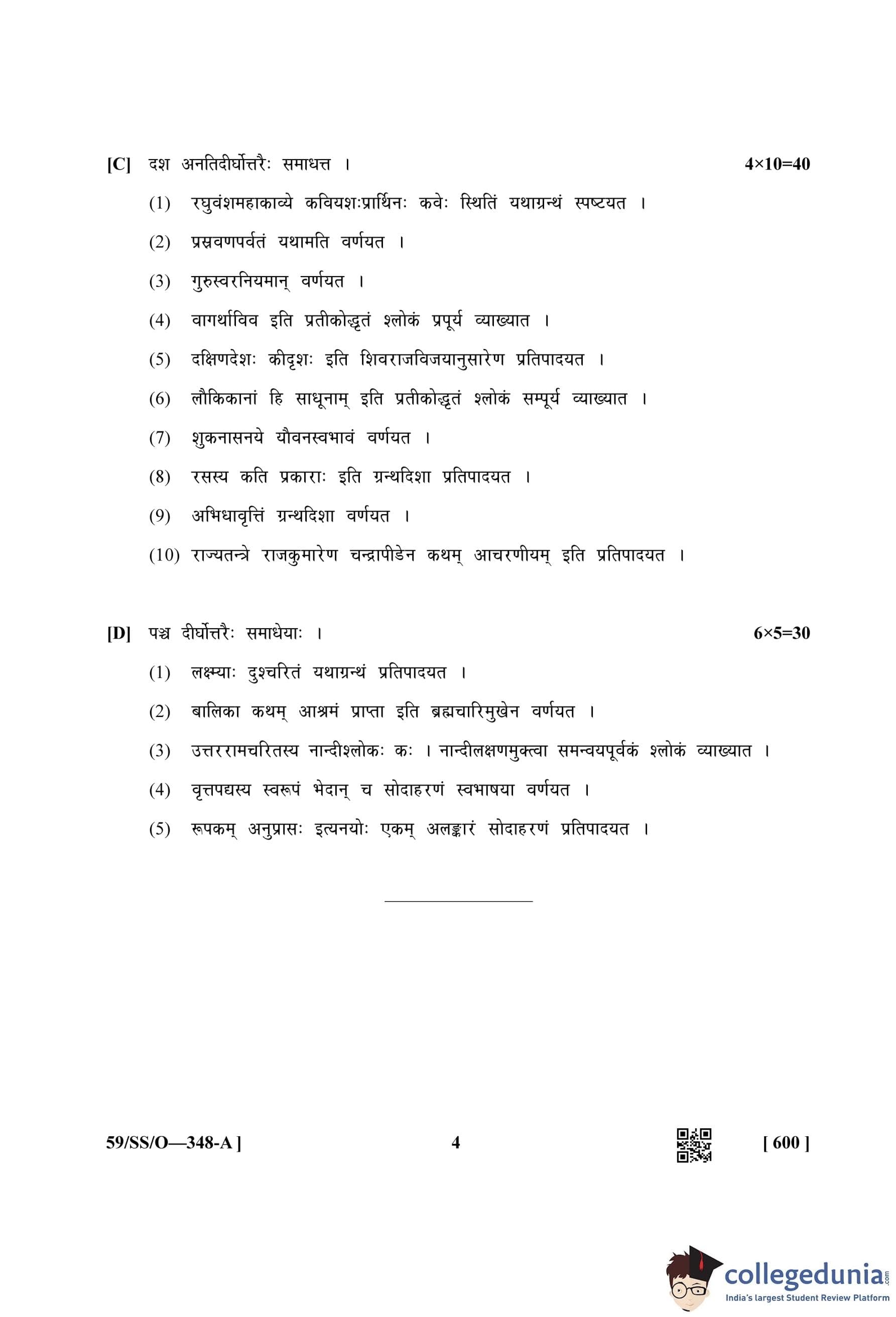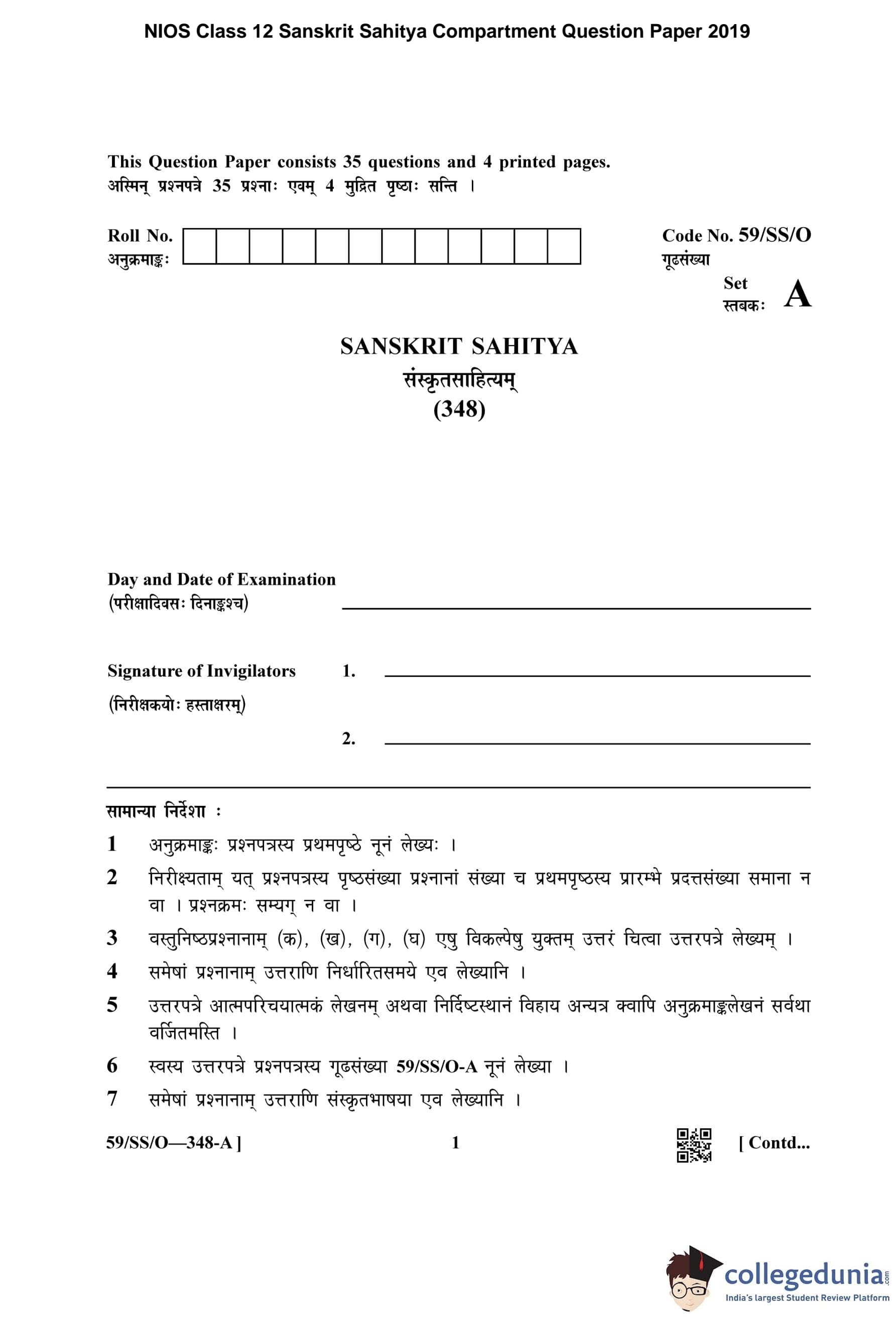 NIOS Class 12 Sanskrit Sahitya Compartment Question Paper 2019 with Answer Key
