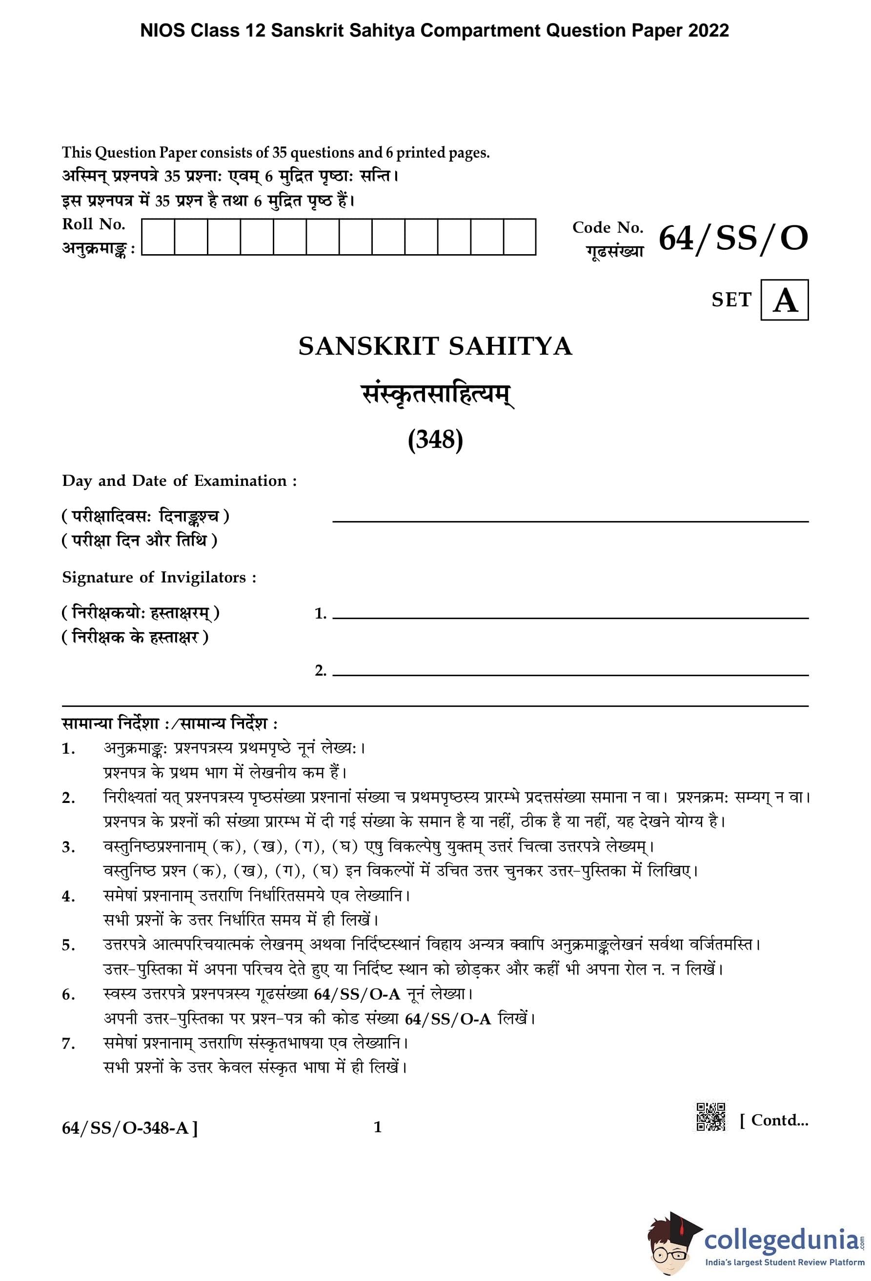 | NIOS Class 12 Sanskrit Sahitya Question Paper 2022 PDF | NIOS Class 12 Sanskrit Sahitya Answer Key 2022 PDF |
