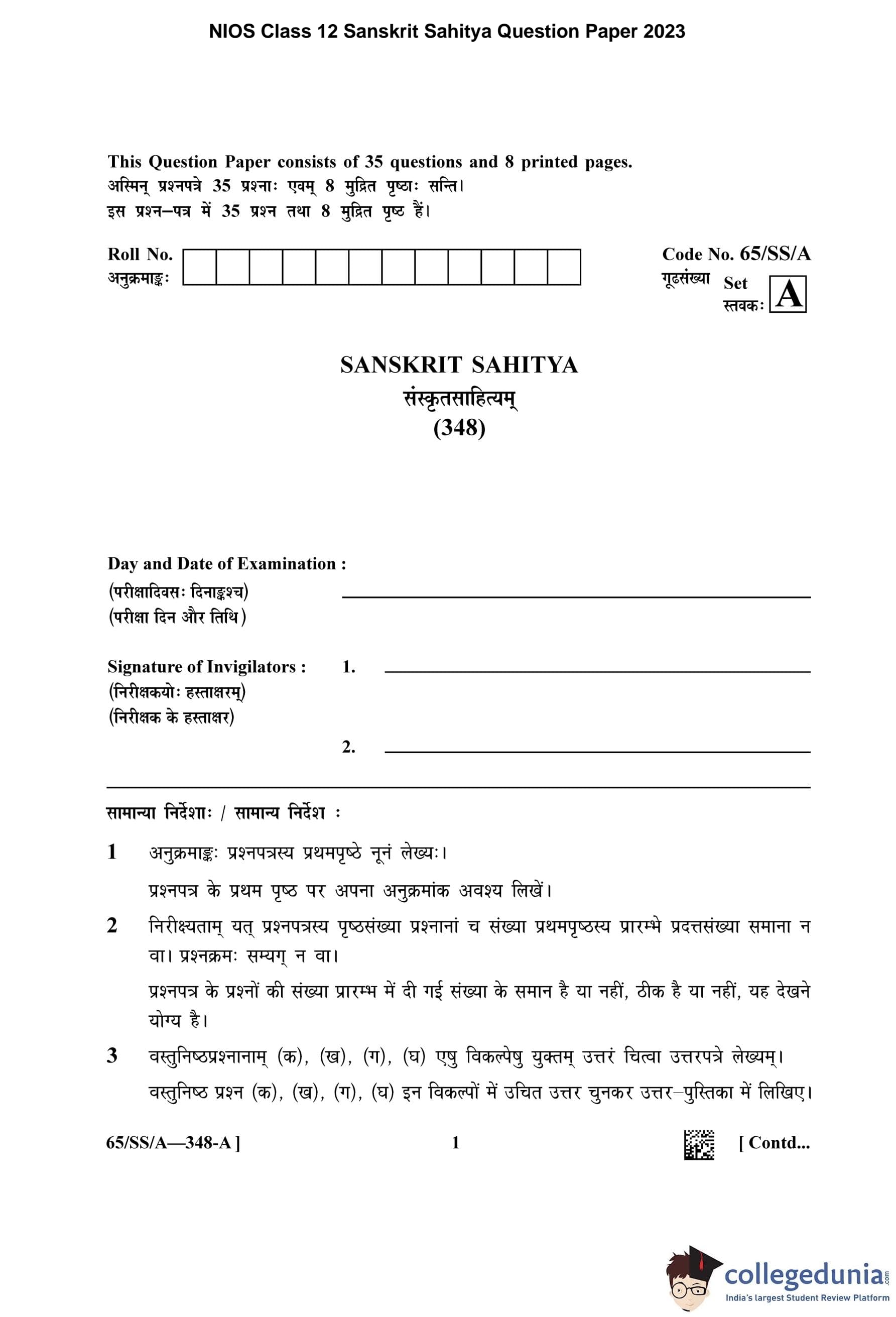 NIOS Class 12 Sanskrit Sahitya Question Paper 2023 with Answer Key pdf (Set A) is available for download here. The exam was conducted by National Institute of Open Schooling on April 19, 2023 in the Afternoon Session 2.30 PM to 5.30 PM. The question paper comprised a total of 35 questions.