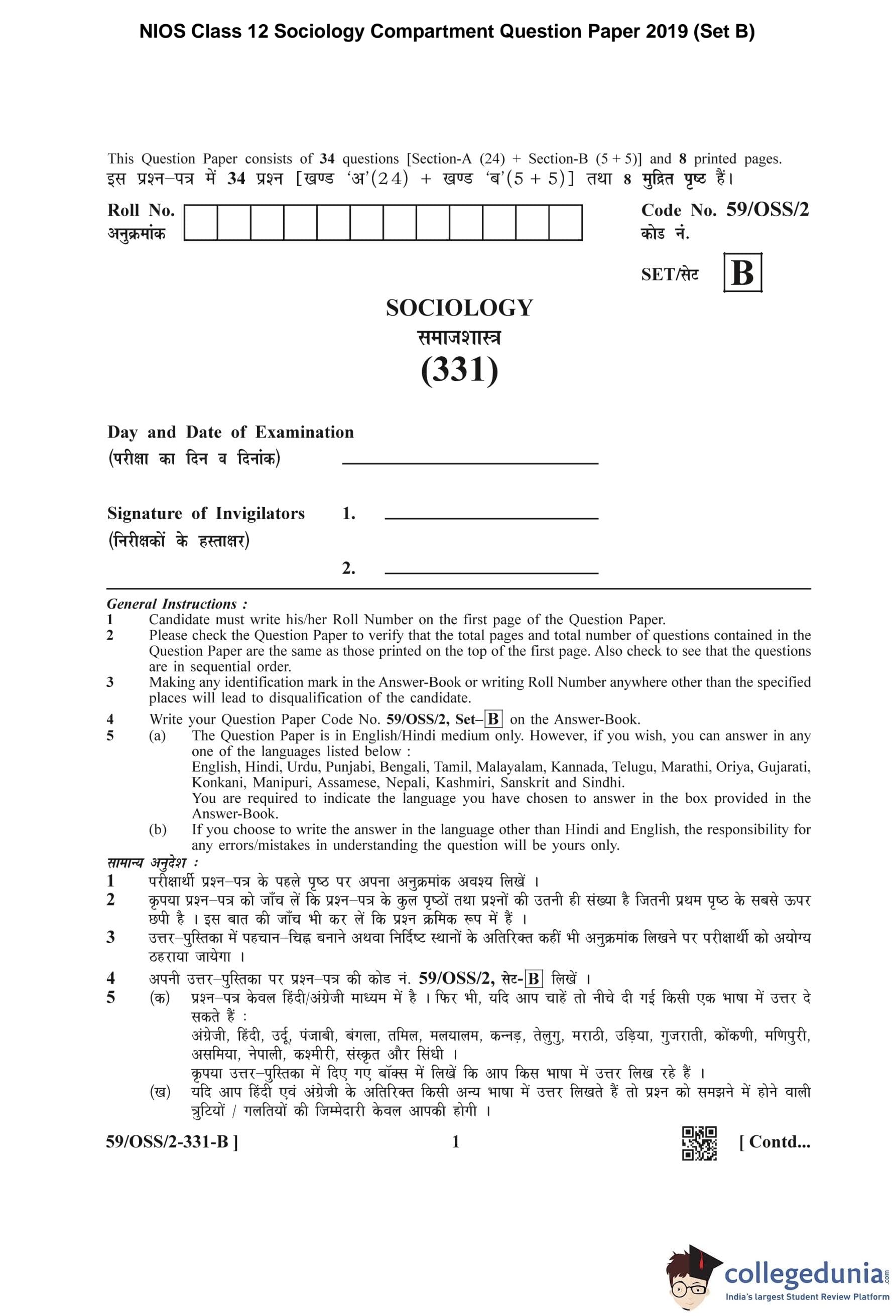 NIOS Class 12 Sociology Compartment Question Paper 2019 with Answer Key pdf (Set B) is available for download here. The exam was conducted by National Institute of Open Schooling on October 30, 2019 in the Afternoon Session 2:30 PM to 5:30 PM. The question paper comprised a total of 29 questions divided among 2 sections.