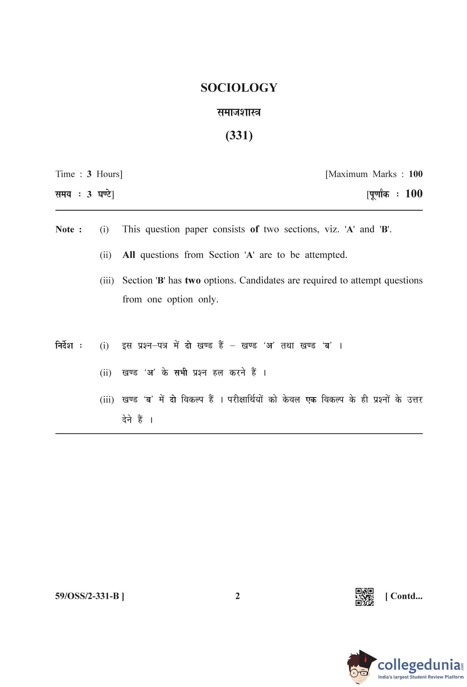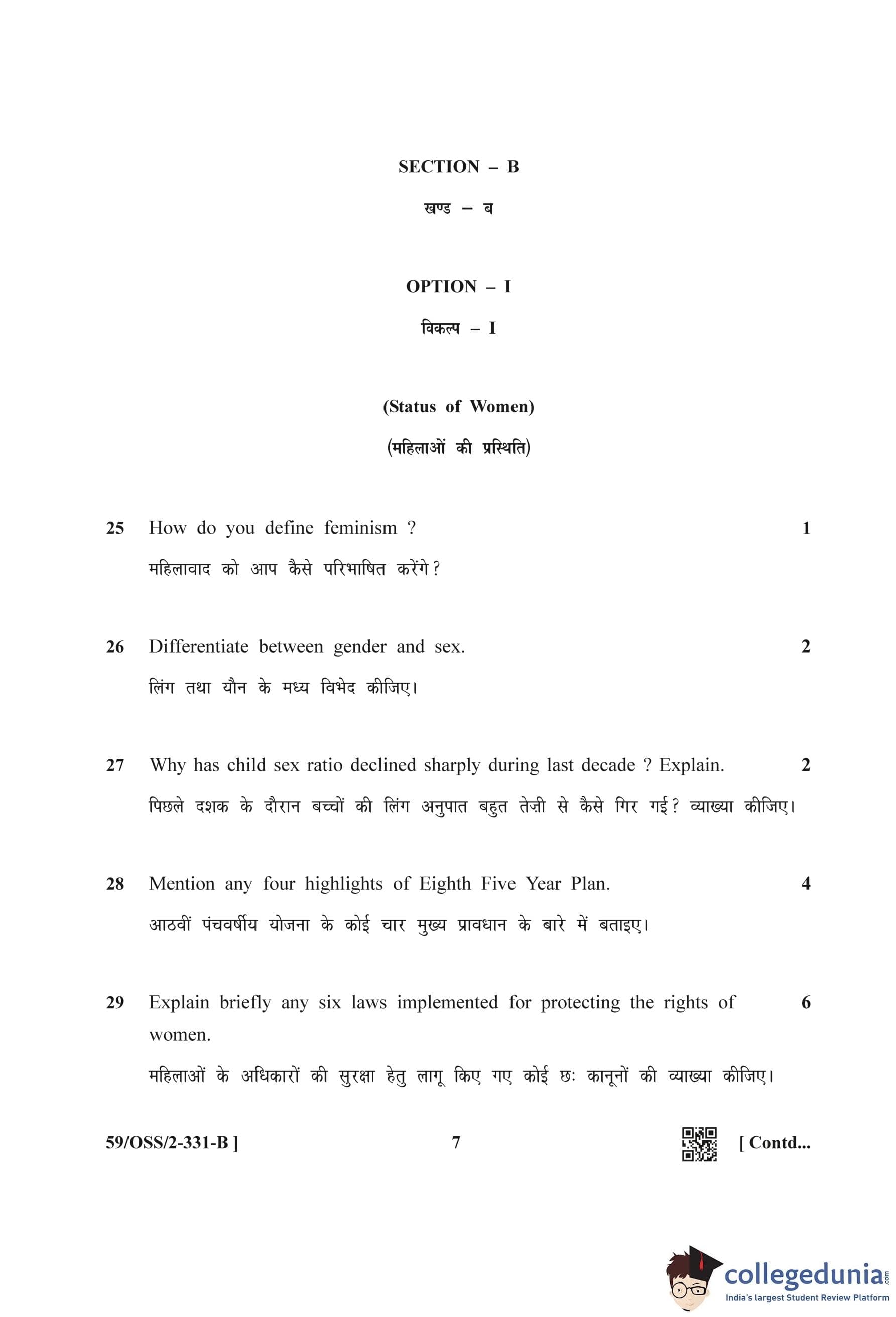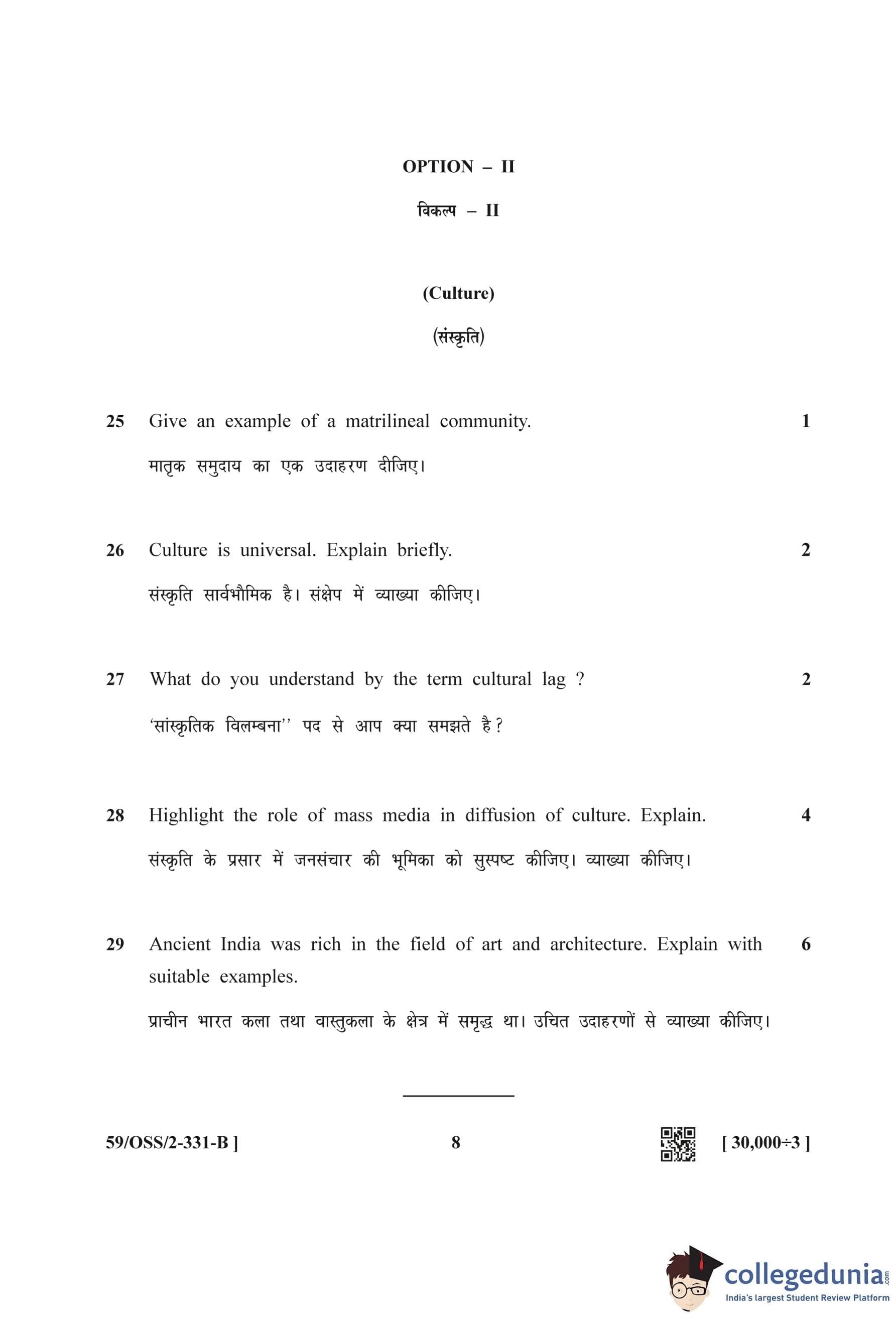 NIOS Class 12 Sociology (Set B) Compartment Question Paper 2019 with Answer Key