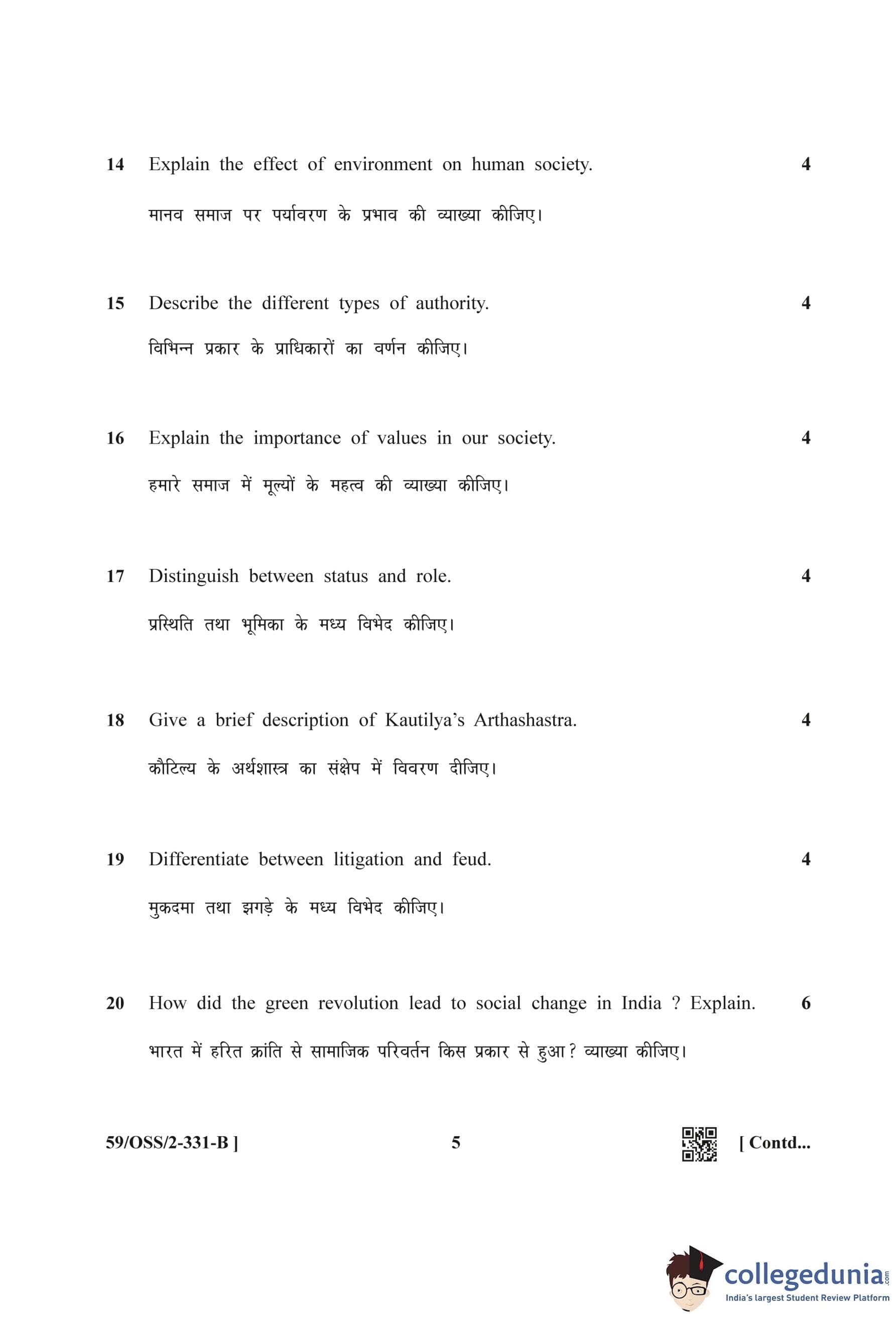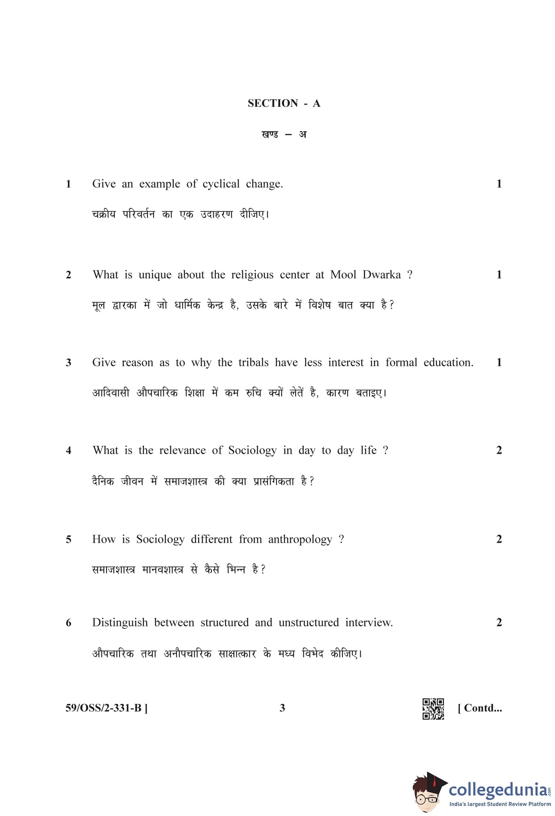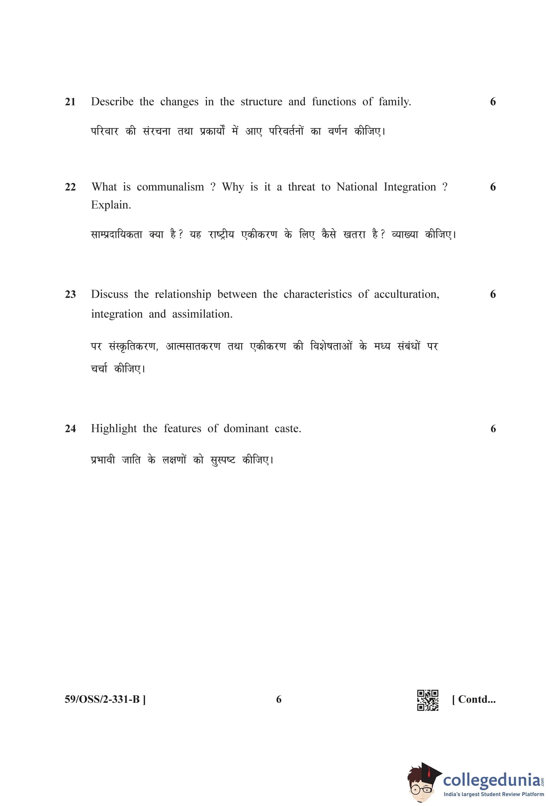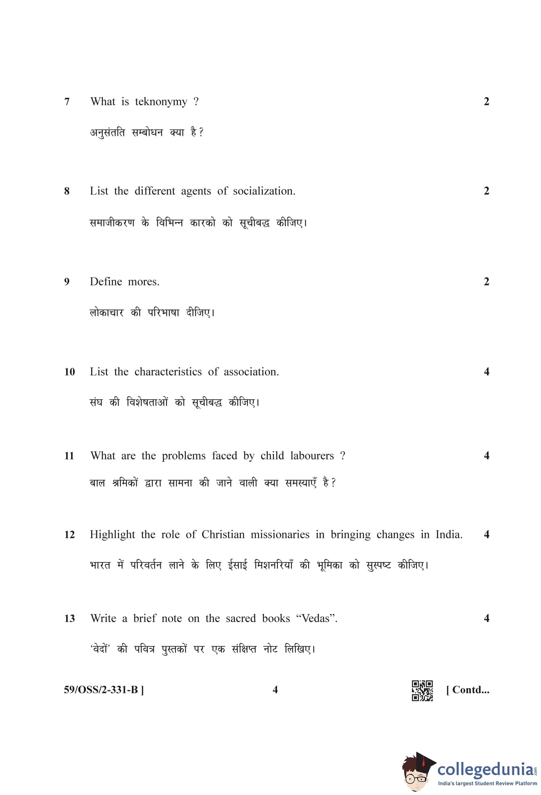NIOS Class 12 Sociology (Set B) Compartment Question Paper 2019 with Answer Key