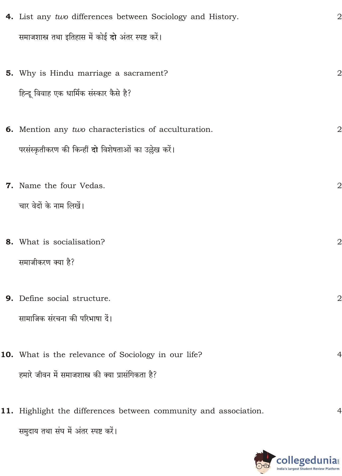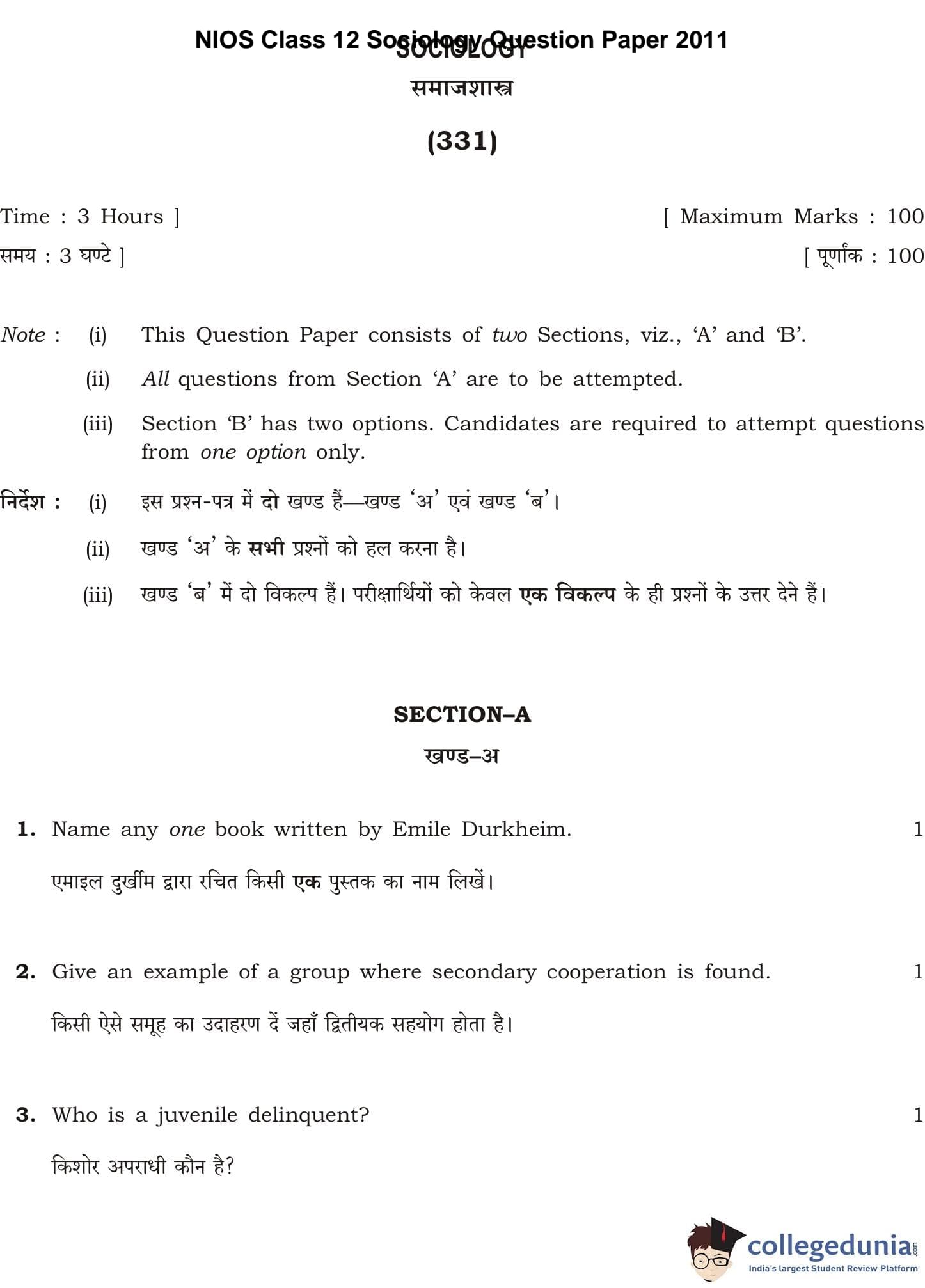 NIOS Class 12 Sociology Question Paper 2011 with Answer Key pdf is available for download here. The exam was conducted by National Institute of Open Schooling. The question paper comprised a total of 29 questions divided among 2 sections.