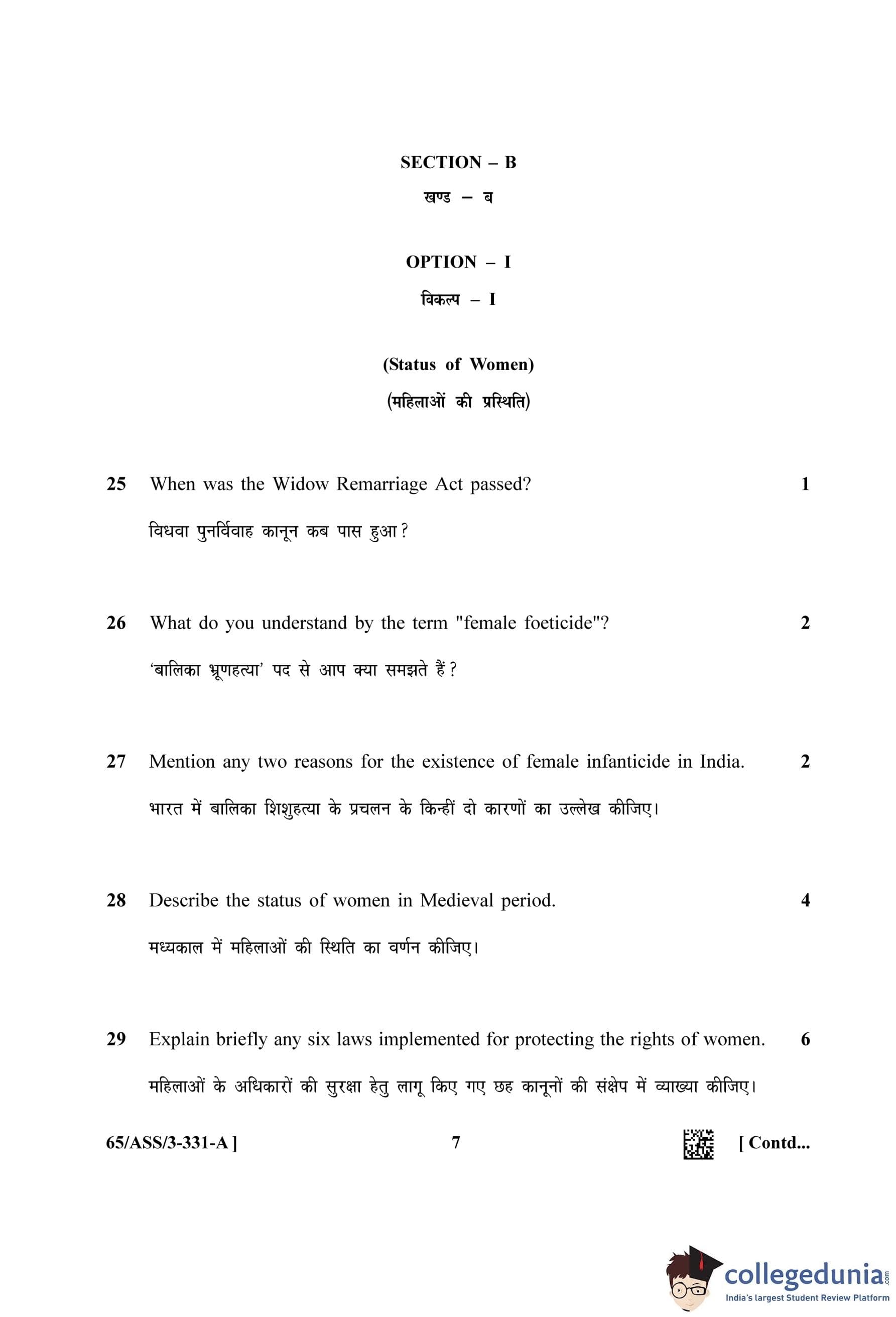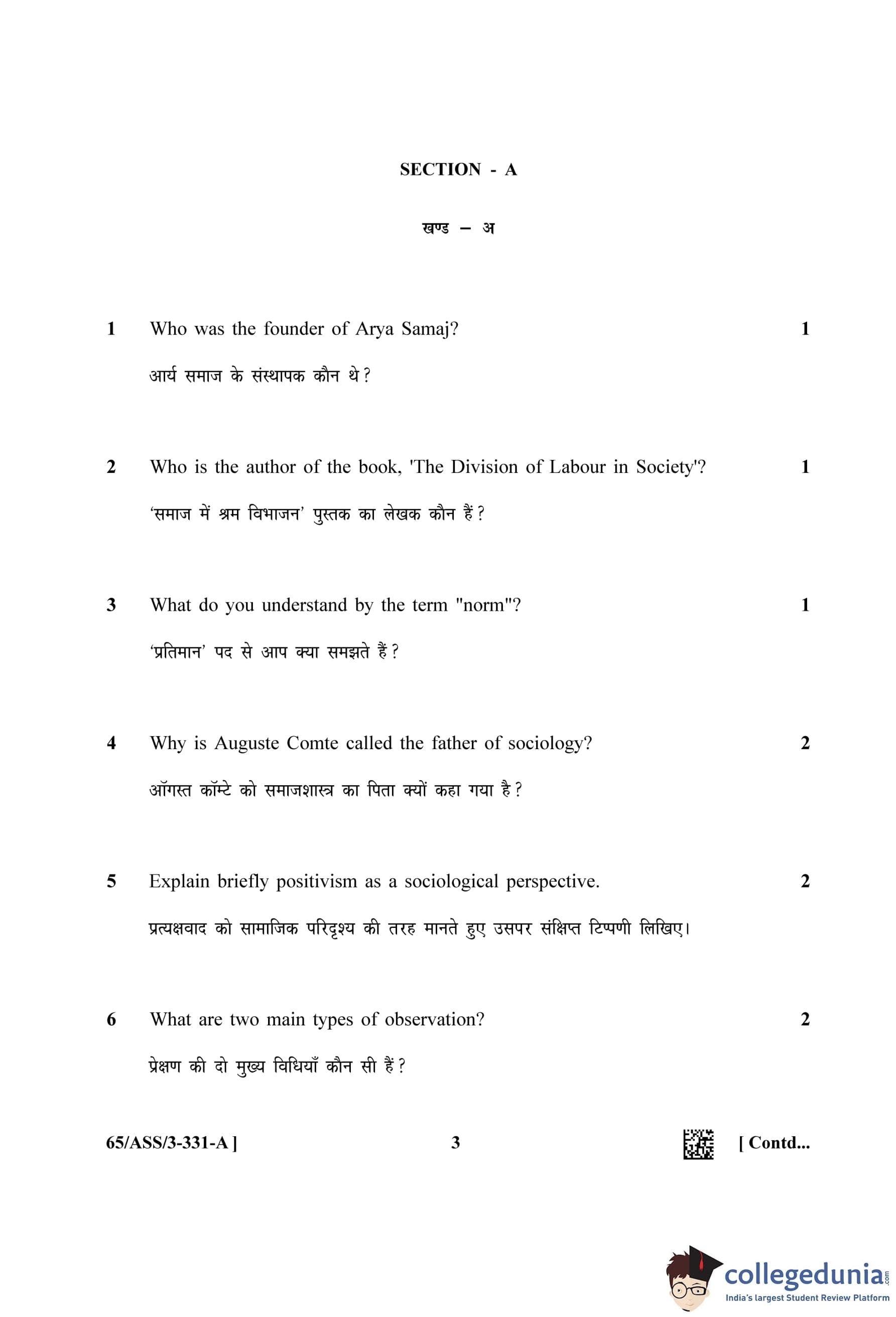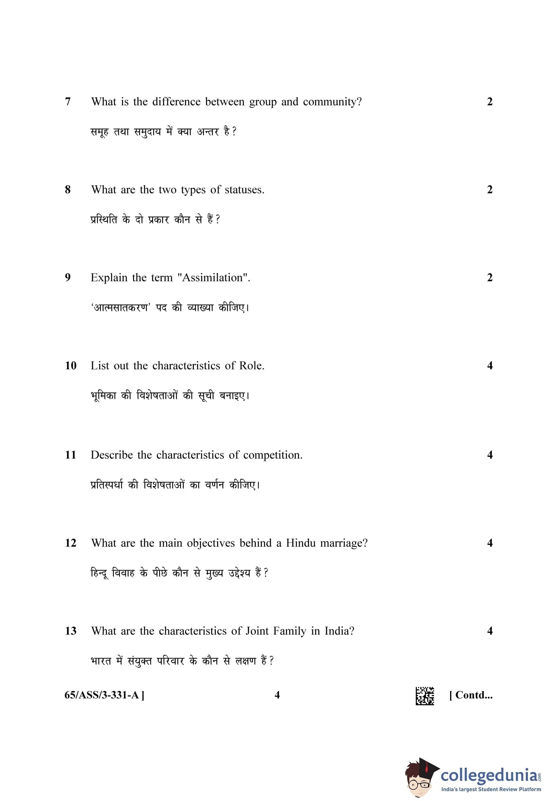 NIOS Class 12 Sociology Question Paper 2023 with Answer Key (Set A - ASS)