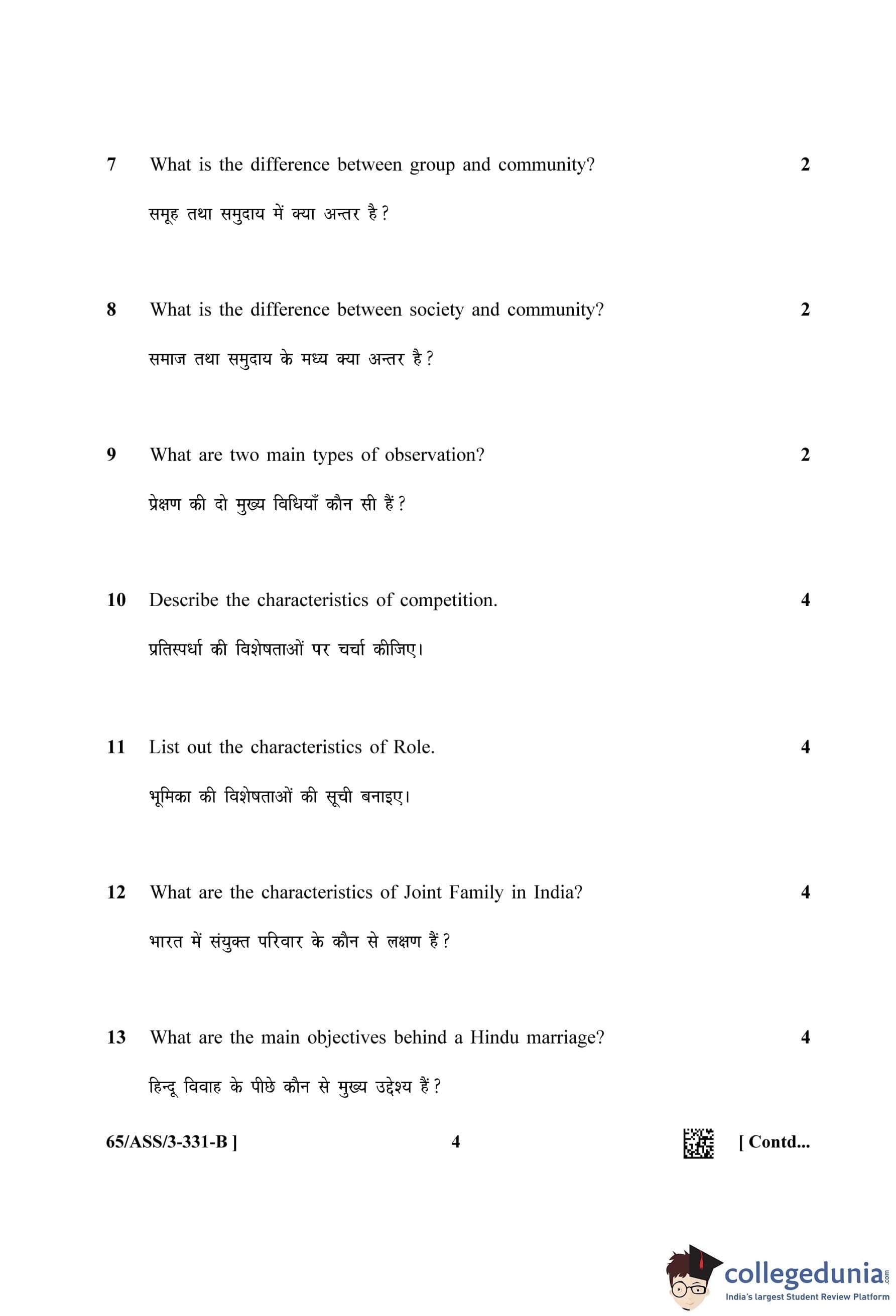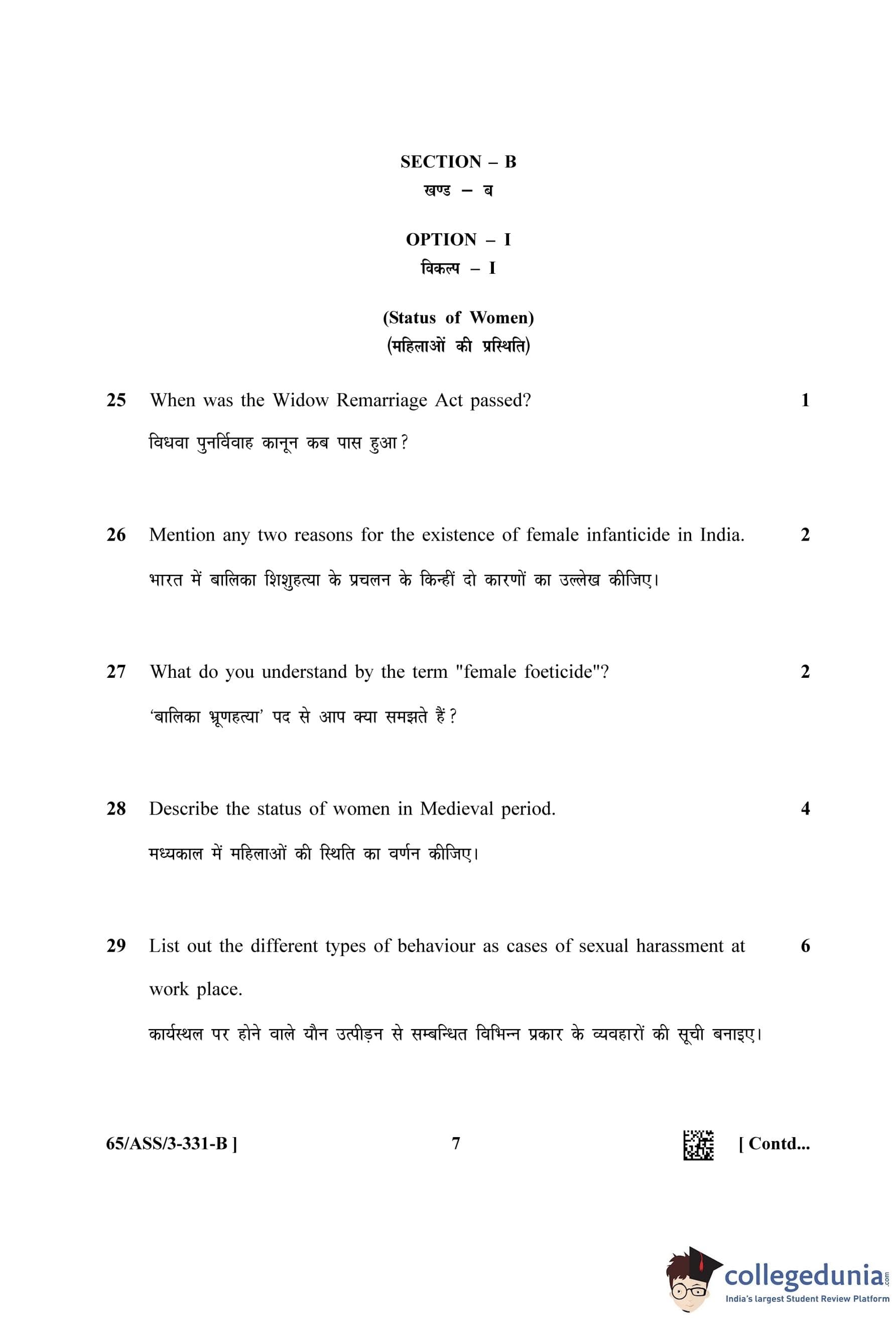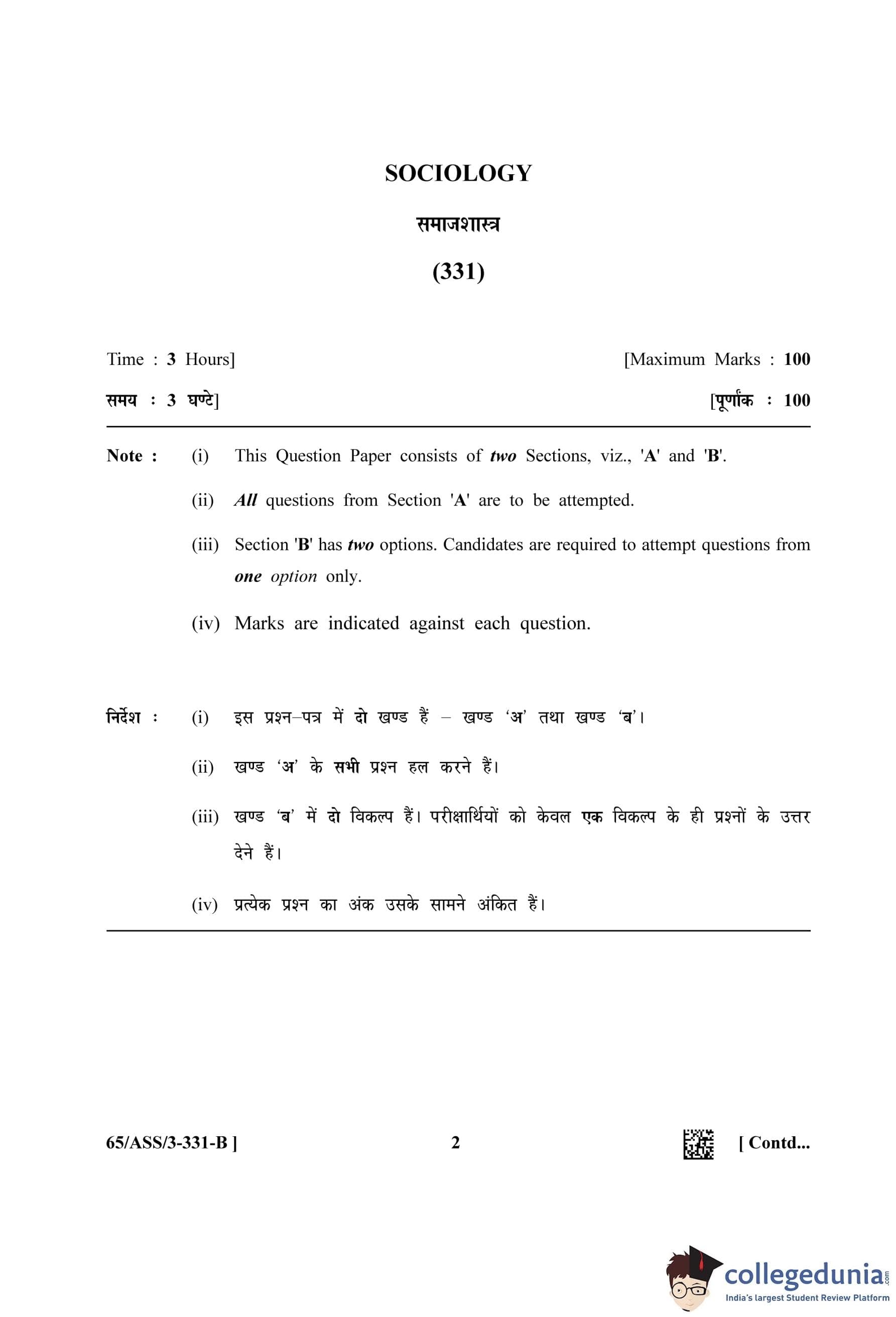 NIOS Class 12 Sociology Question Paper 2023 with Answer Key (Set B - ASS)