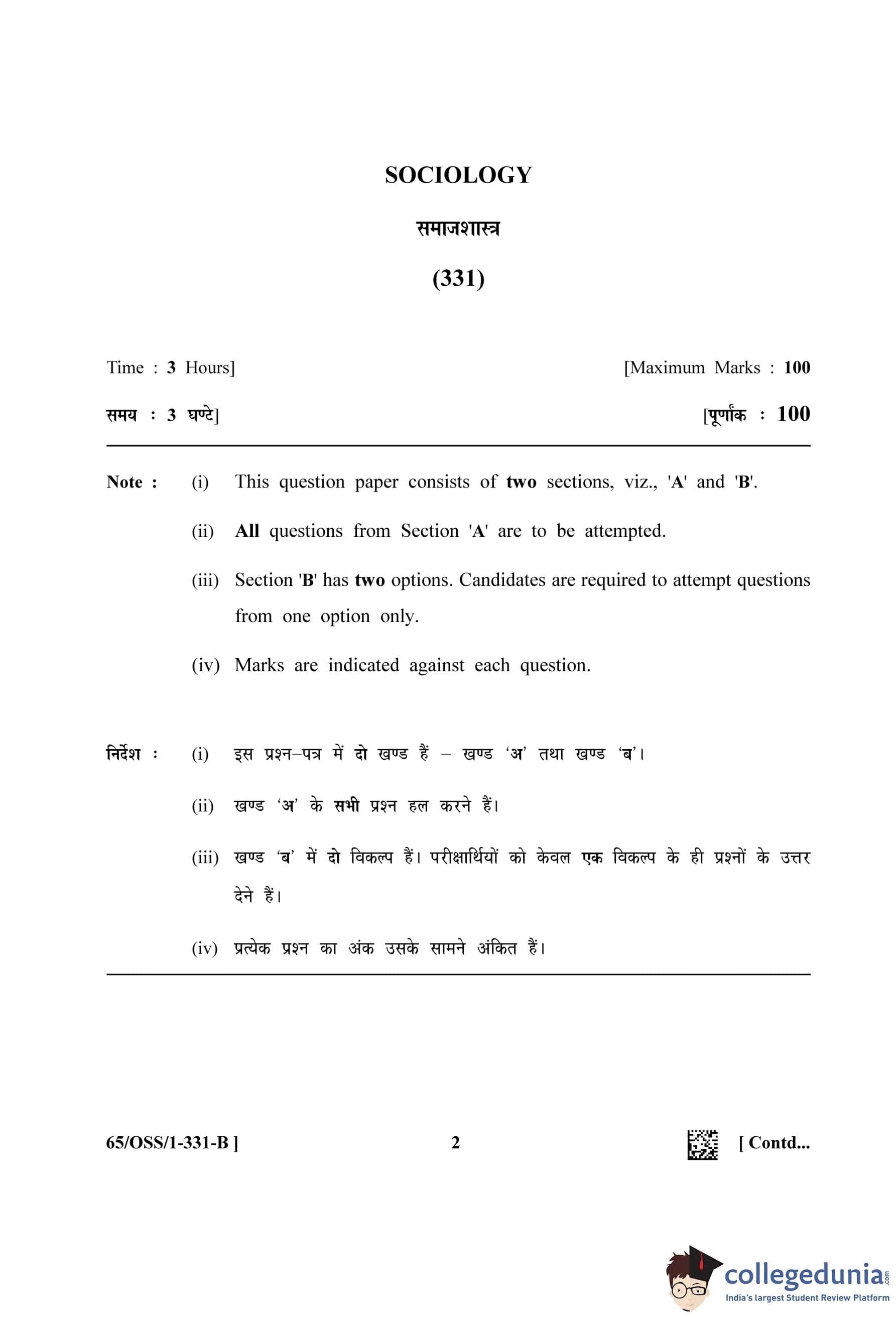 NIOS Class 12 Sociology Question Paper 2023 with Answer Key pdf (Set B - OSS) is available for download here. The exam was conducted by National Institute of Open Schooling on April 18, 2023 in the Afternoon Session 2.30 PM to 5.30 PM. The question paper comprised a total of 34 questions divided among 2 sections.