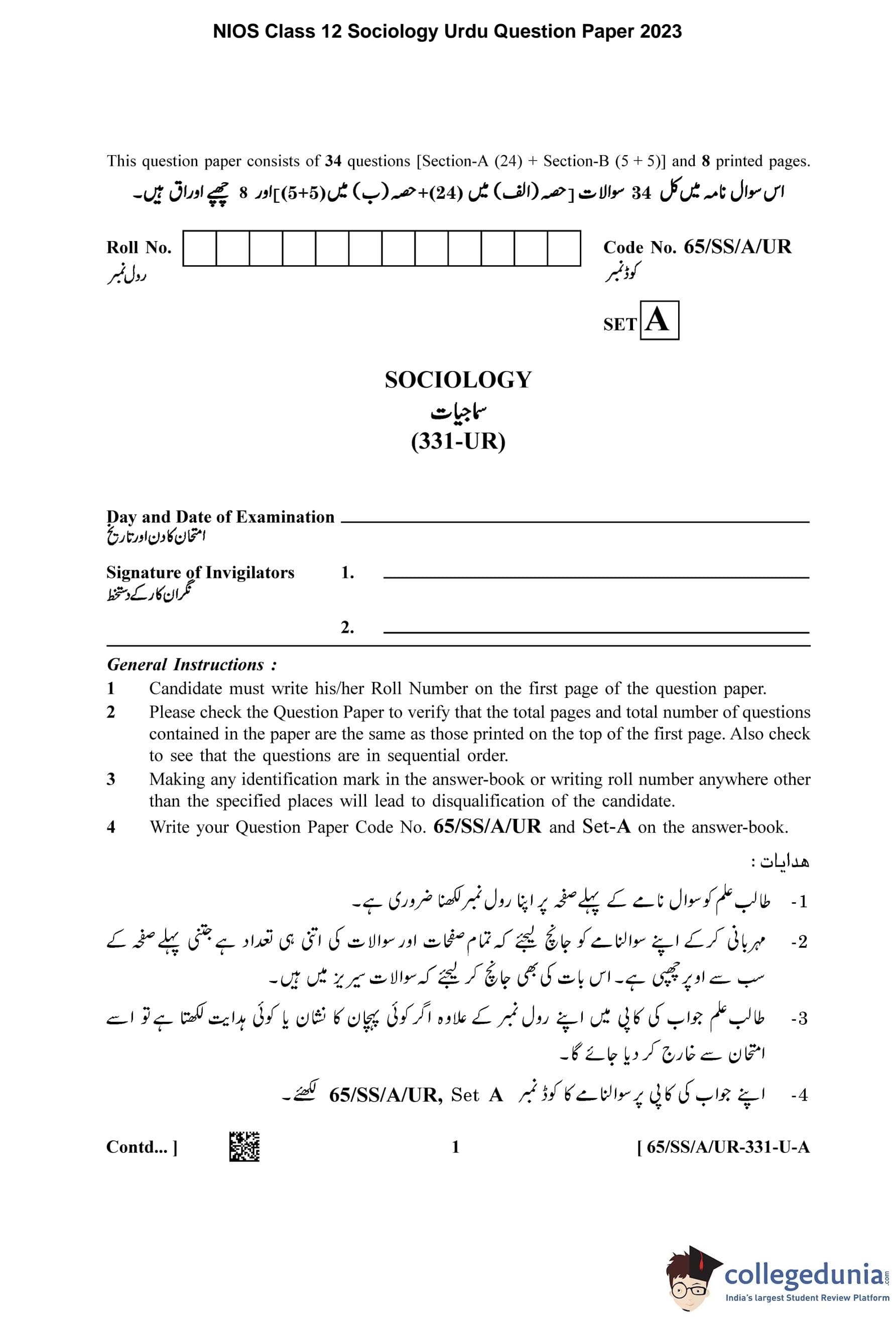 NIOS Class 12 Sociology Urdu Question Paper 2023 with Answer Key pdf (Set A) is available for download here. The exam was conducted by National Institute of Open Schooling on April 18, 2023 in the Afternoon Session 2.30 PM to 5.30 PM. The question paper comprised a total of 34 questions divided among 2 sections.