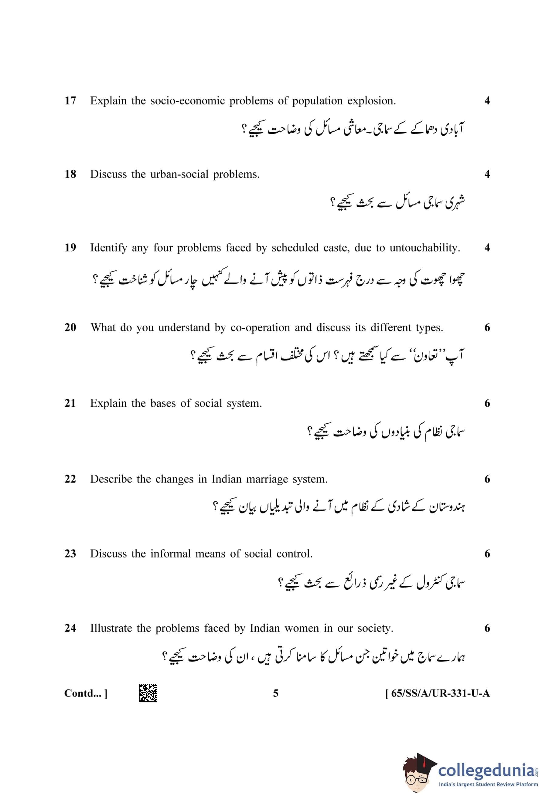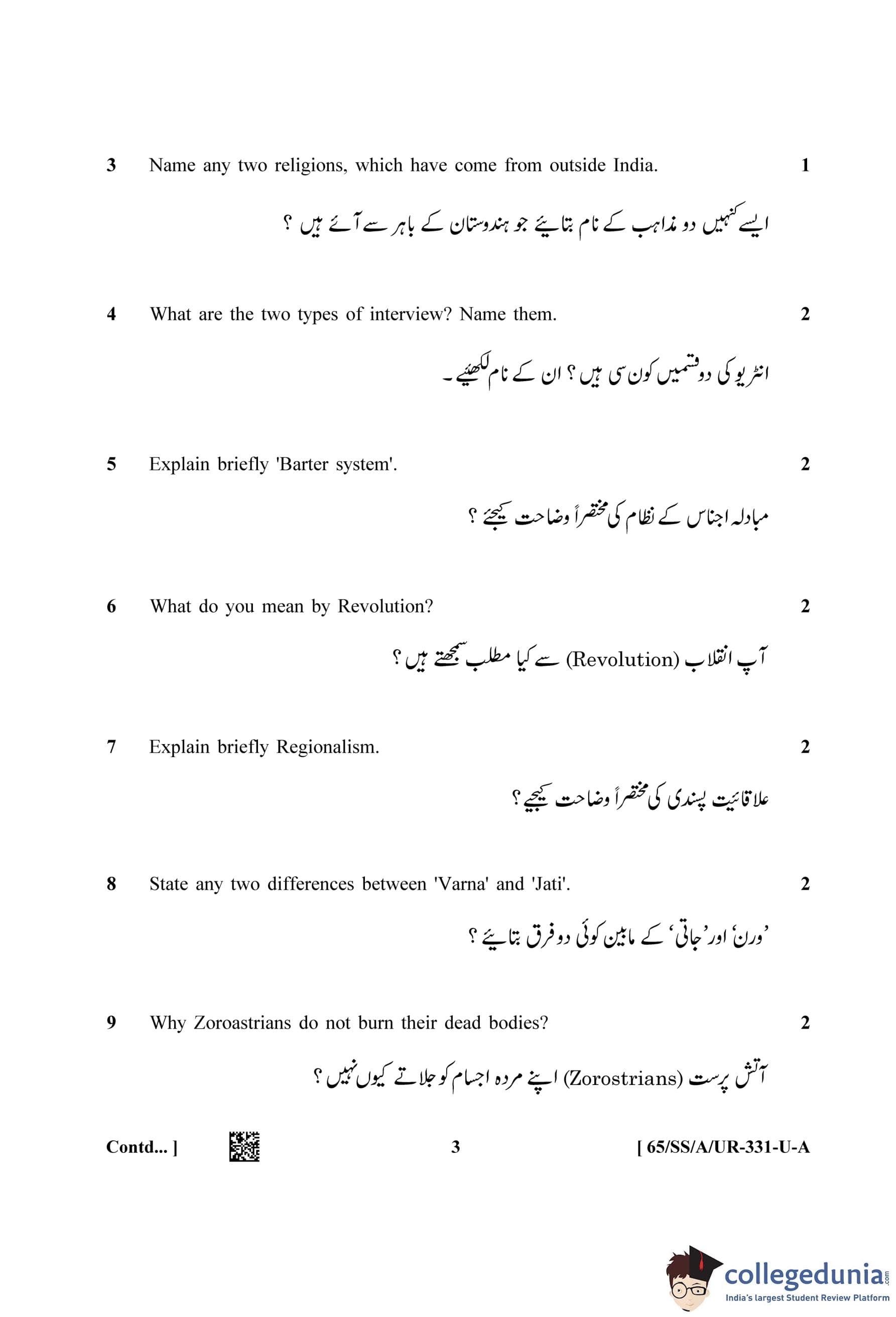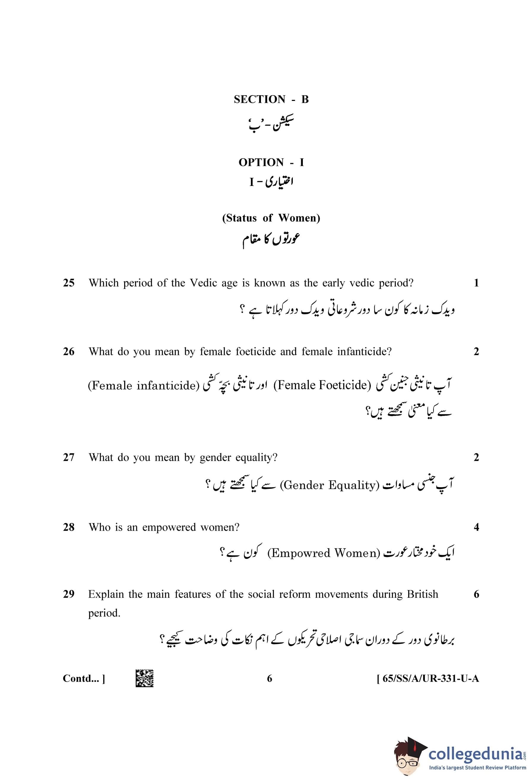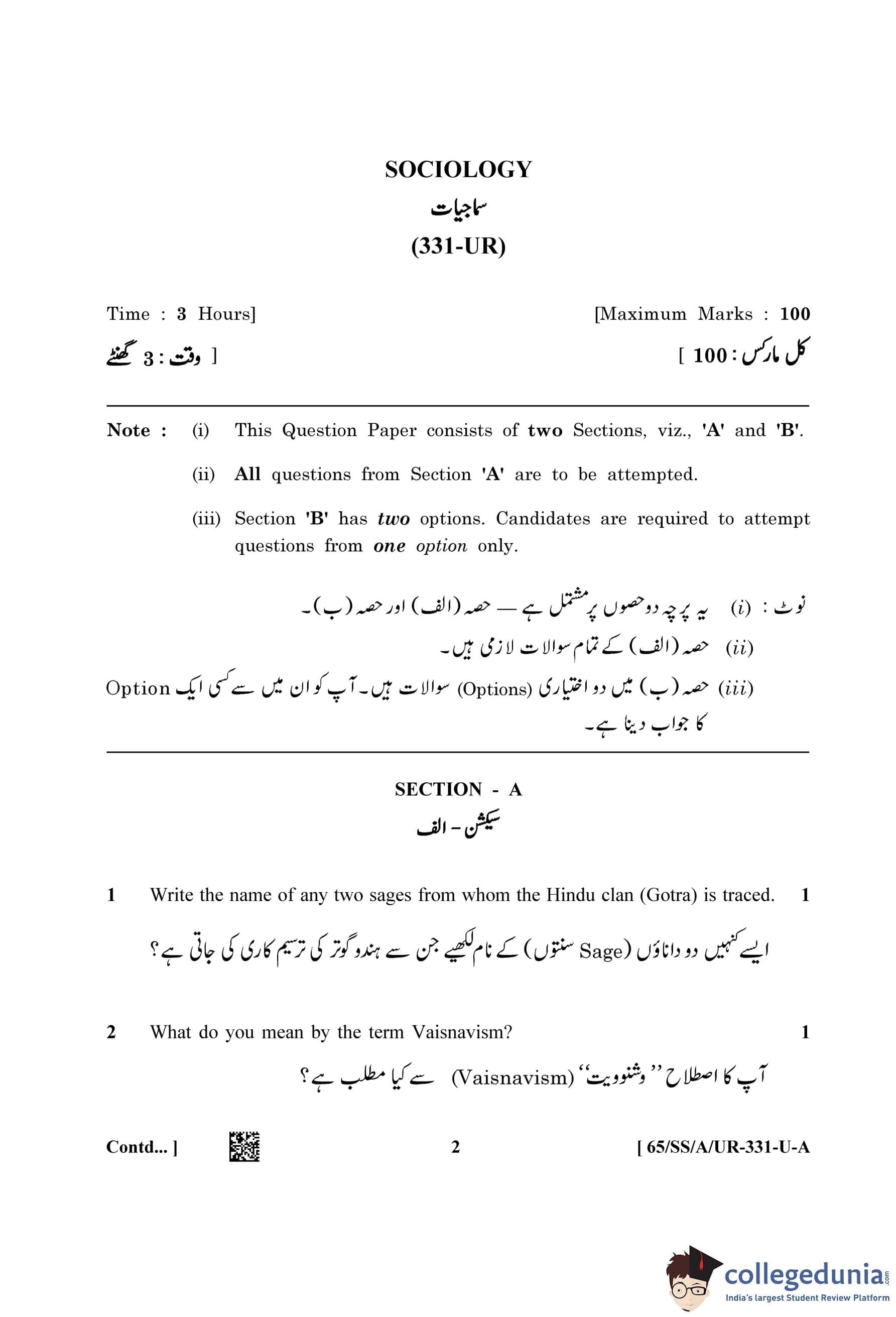NIOS Class 12 Sociology Urdu (Set A) Question Paper 2023 with Answer Key
