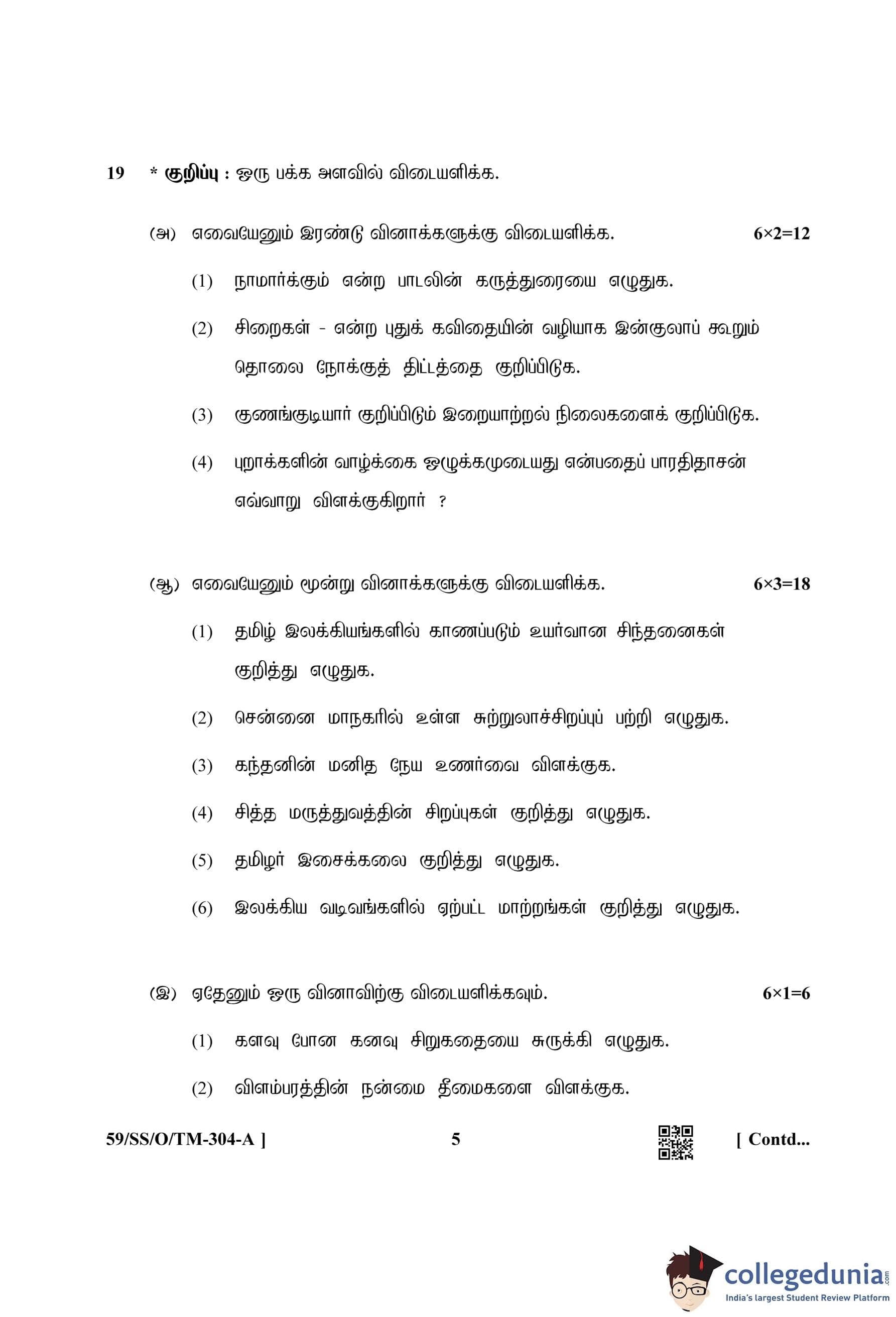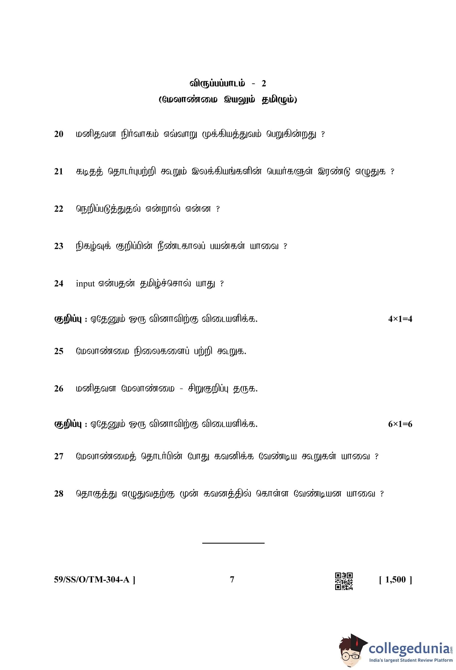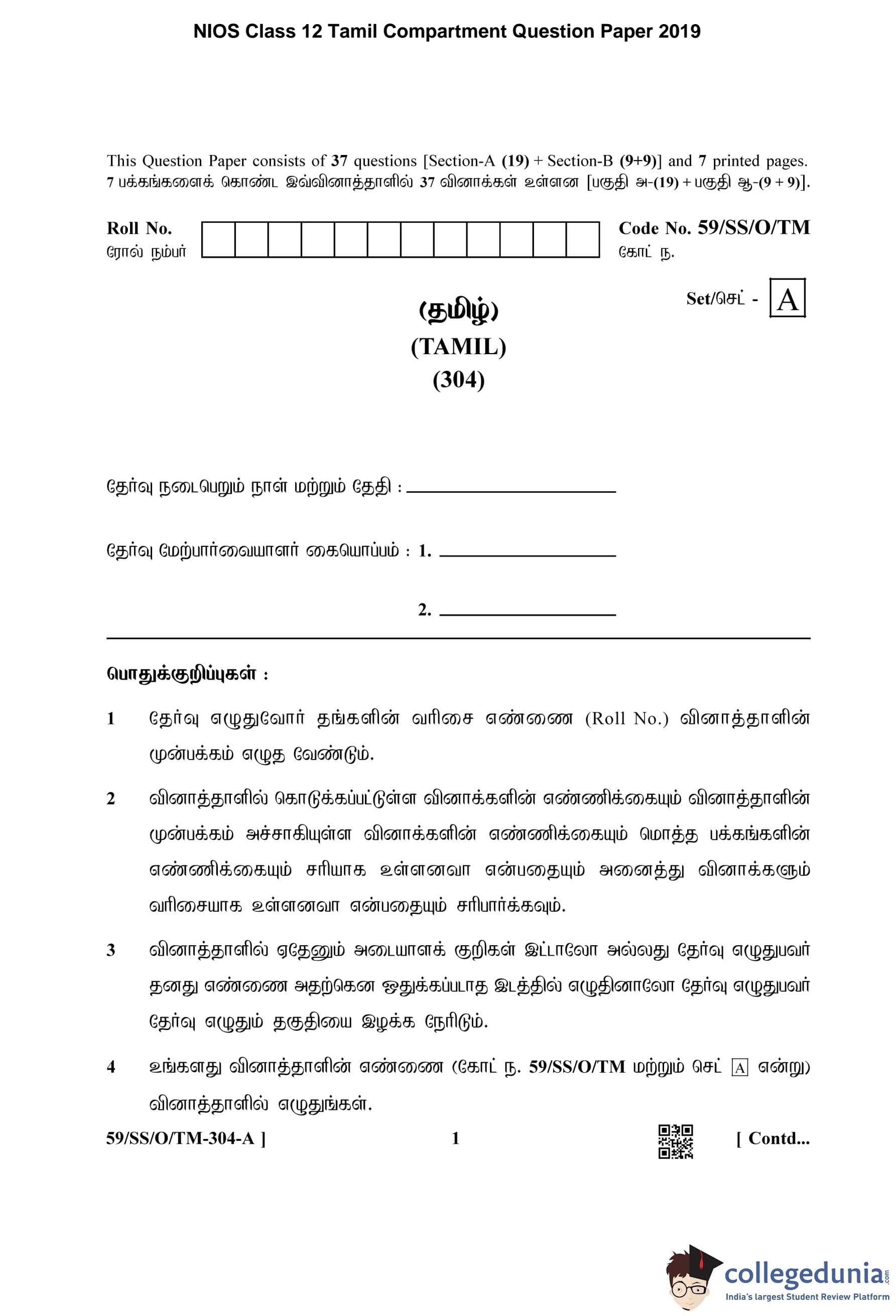 NIOS Class 12 Tamil Compartment Question Paper 2019 with Answer Key