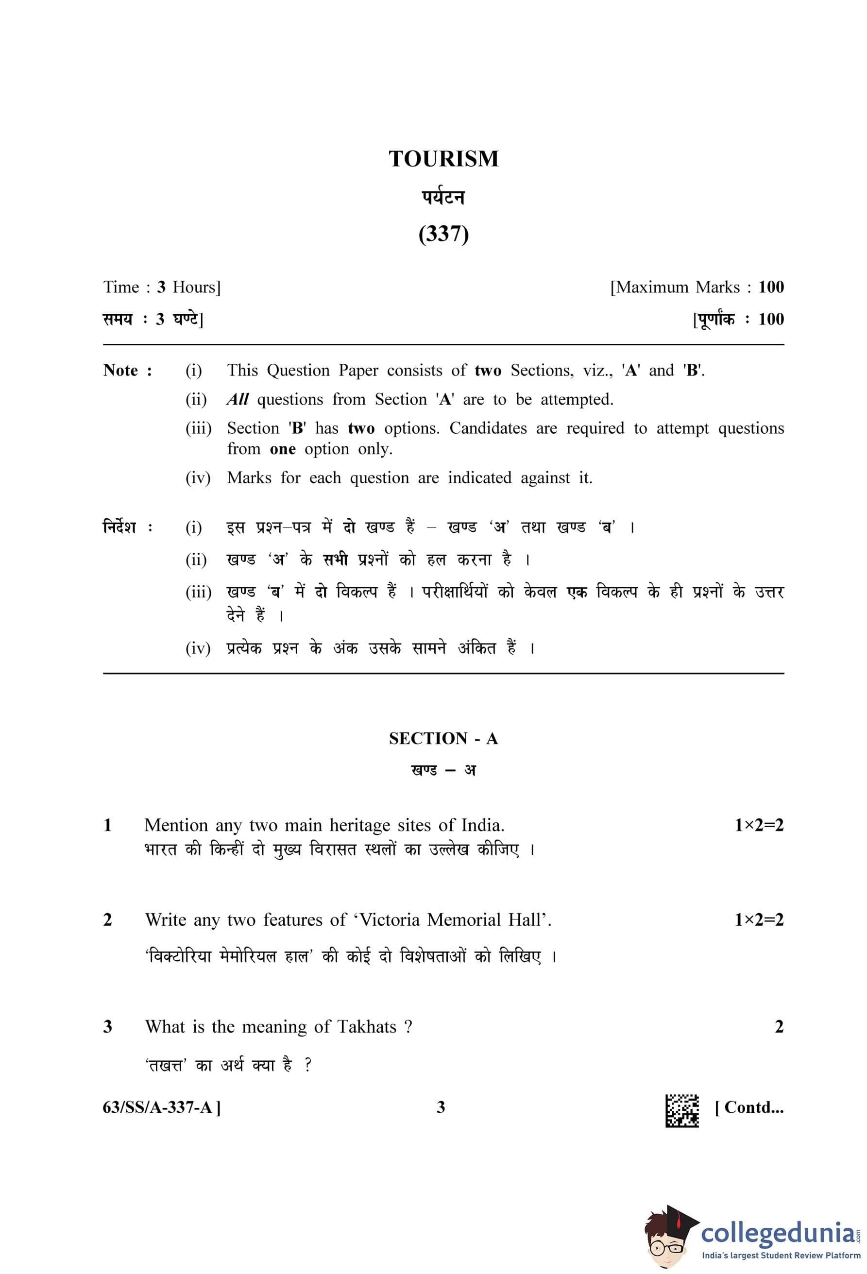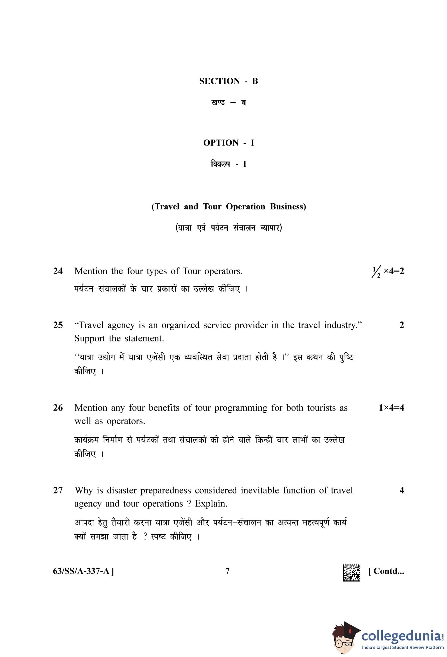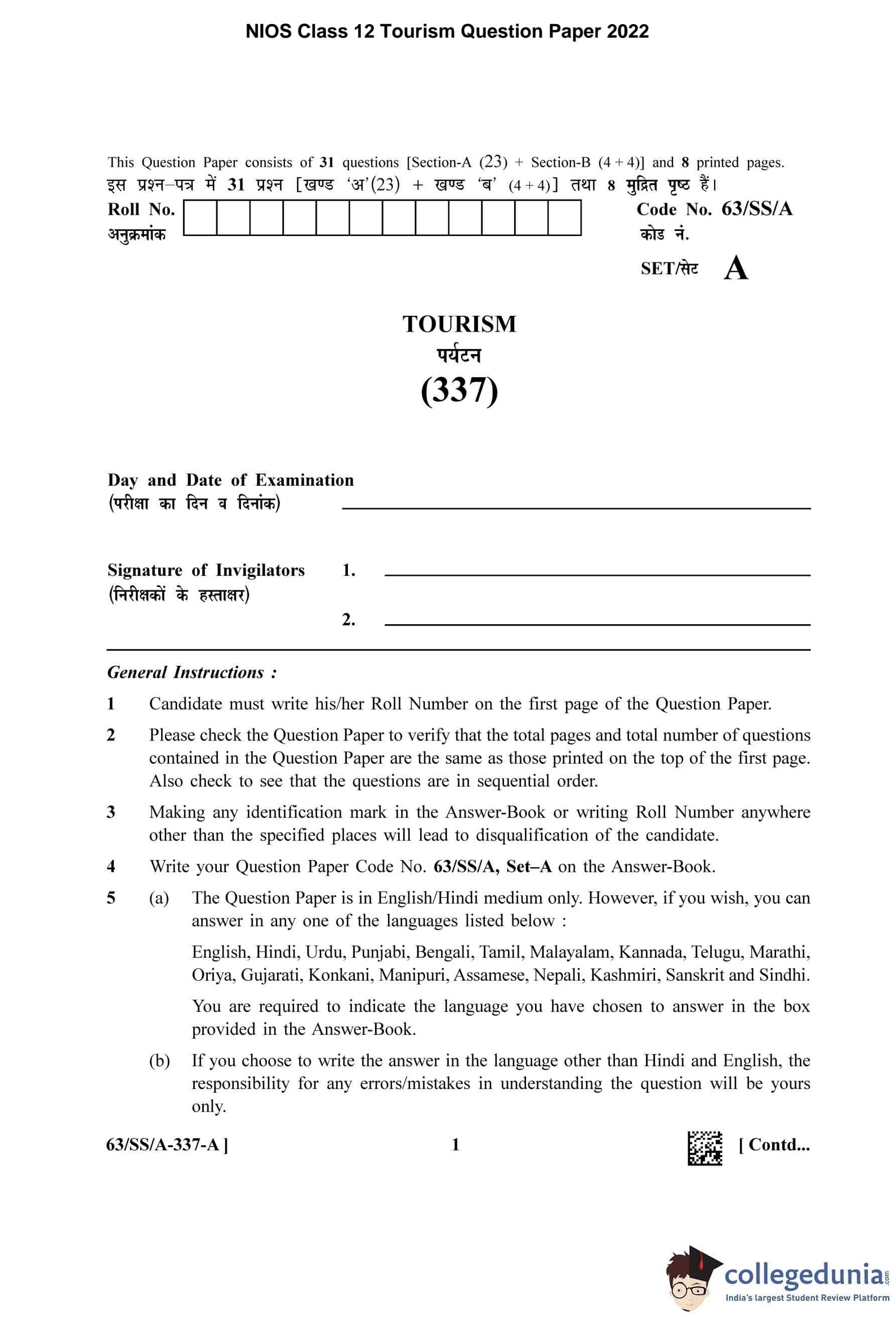 NIOS Class 12 Tourism Question Paper 2022 with Answer Key pdf is available for download here. The exam was conducted by National Institute of Open Schooling on April 27, 2022 in the Afternoon Session 2:30 PM to 5:30 PM. The question paper comprised a total of 27 questions divided among 2 sections.