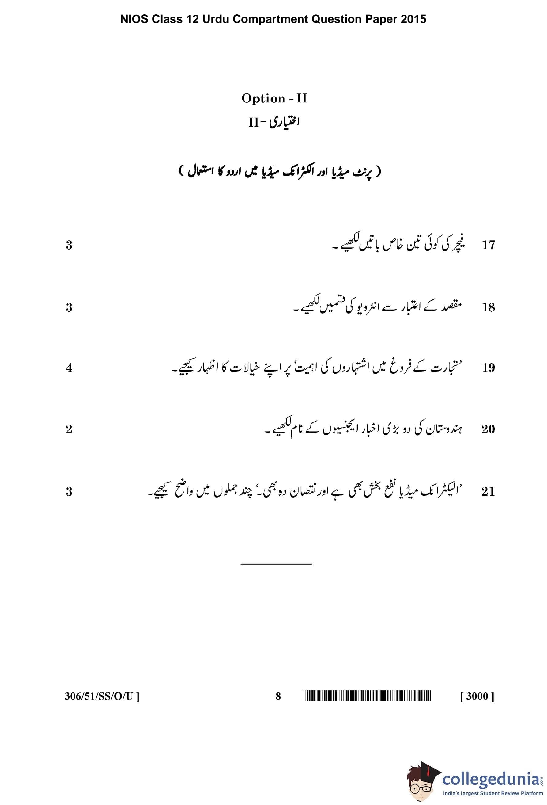 | NIOS Class 12 Urdu Question Paper 2015 PDF | NIOS Class 12 Urdu Answer Key 2015 PDF |