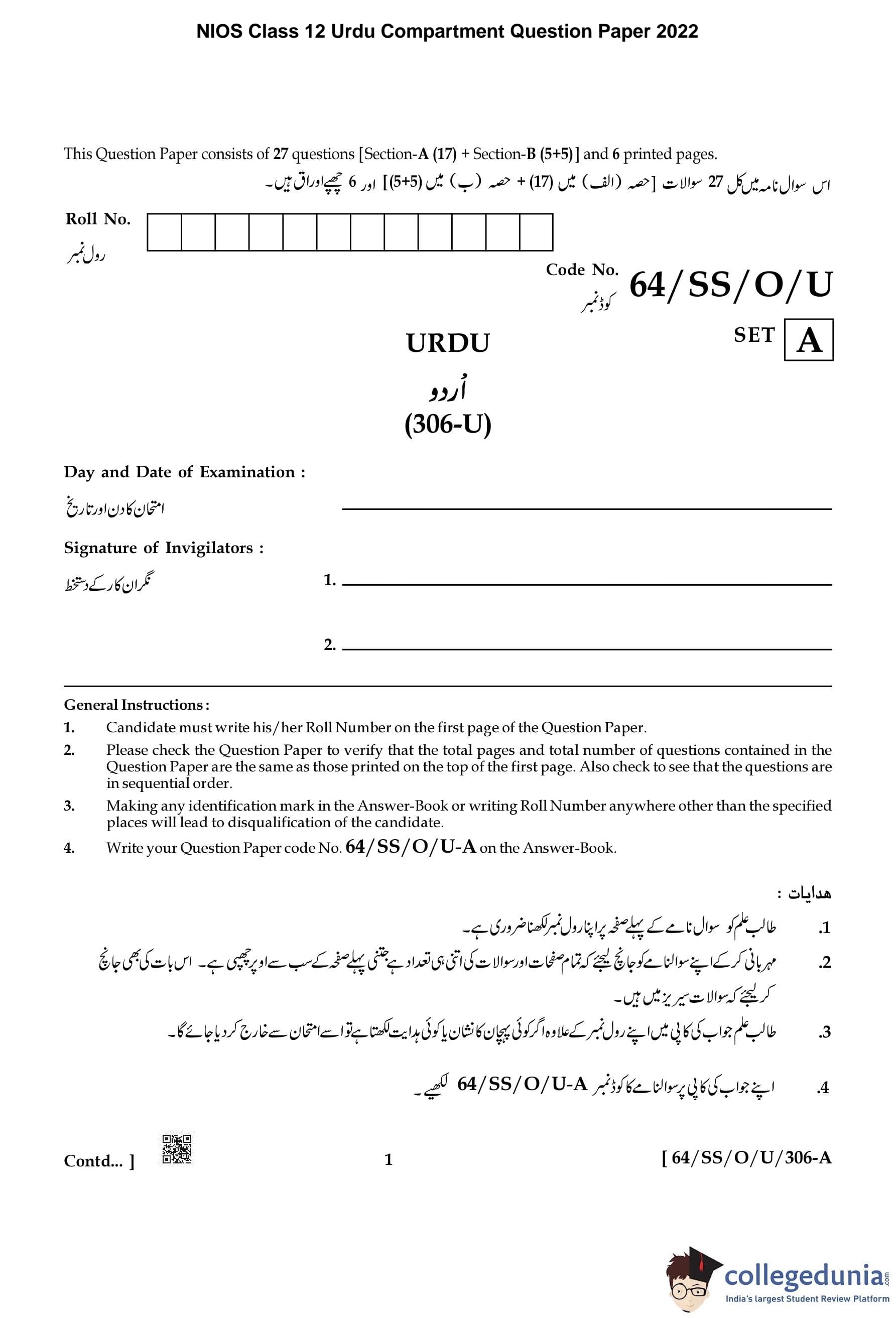 | NIOS Class 12 Urdu Question Paper 2022 PDF | NIOS Class 12 Urdu Answer Key 2022 PDF |