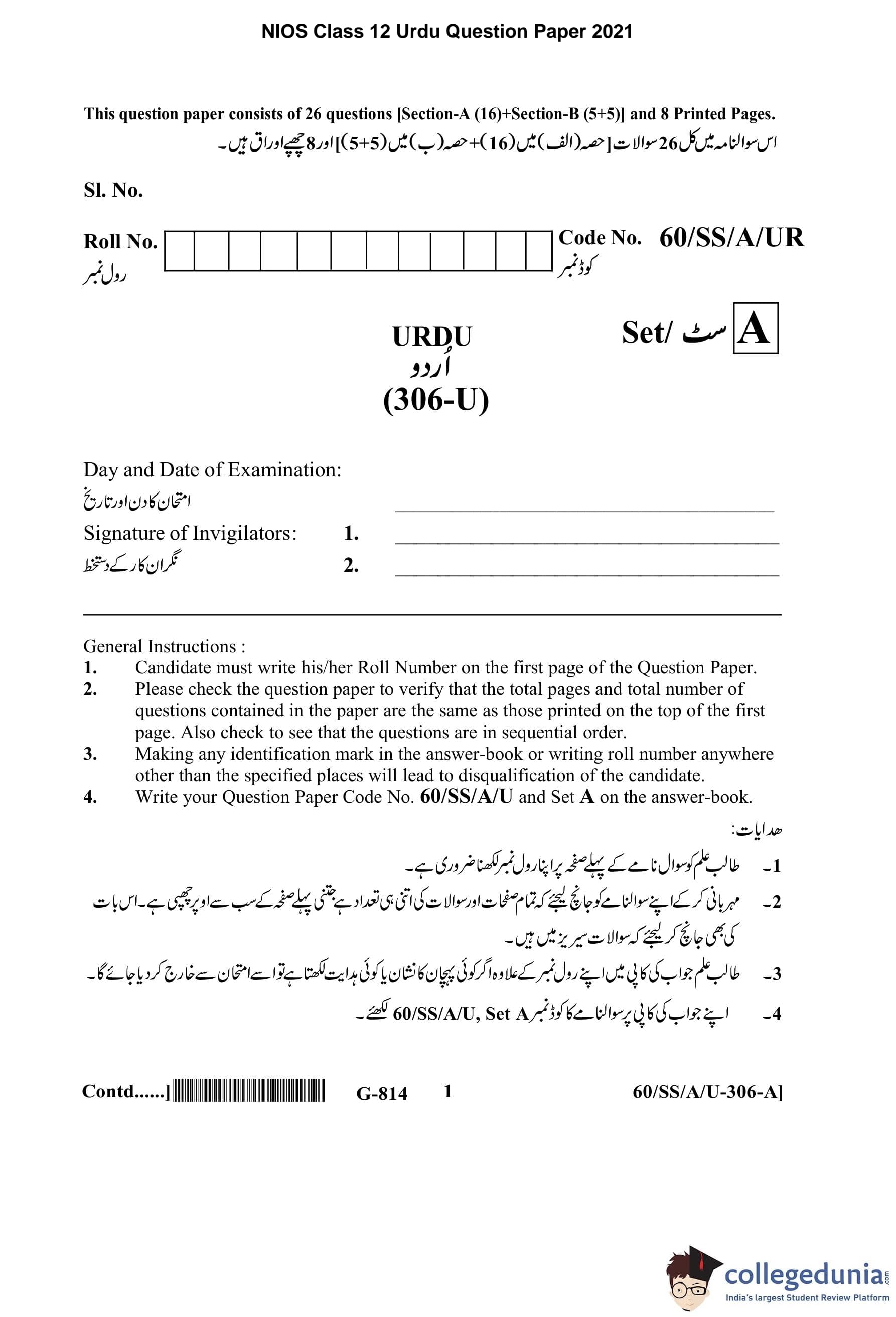 | NIOS Class 12 Urdu Question Paper 2021 PDF | NIOS Class 12 Urdu Answer Key 2021 PDF |