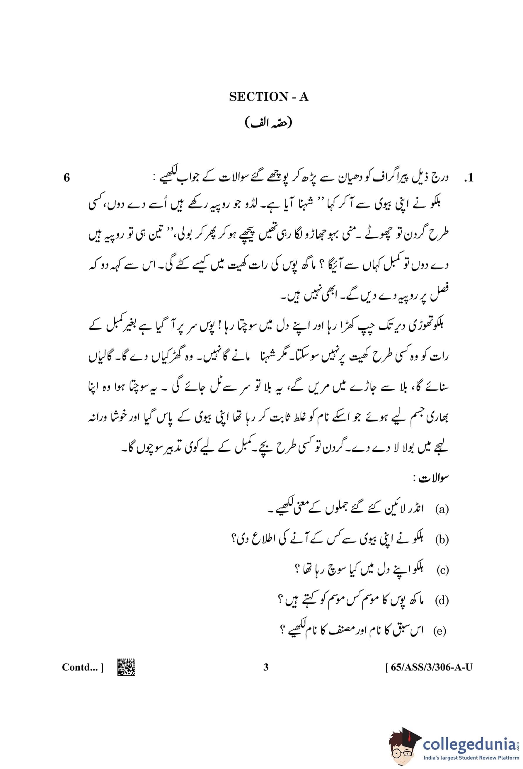 NIOS Class 12 Urdu (Set A - ASS) Question Paper 2023 with Answer Key