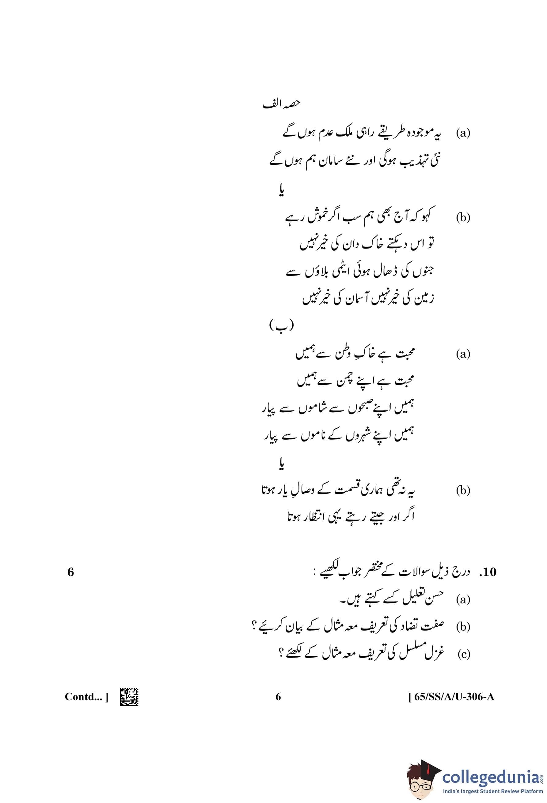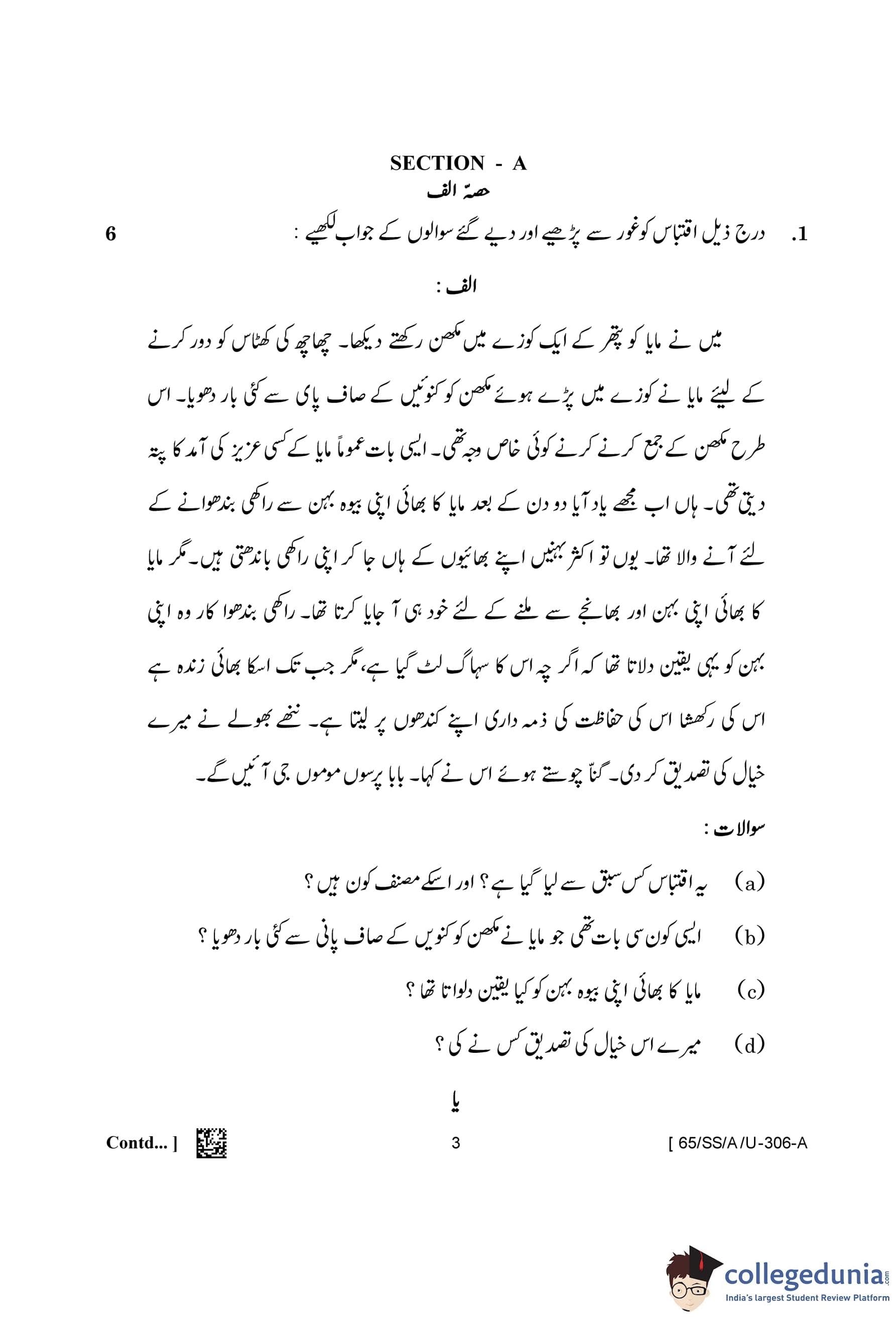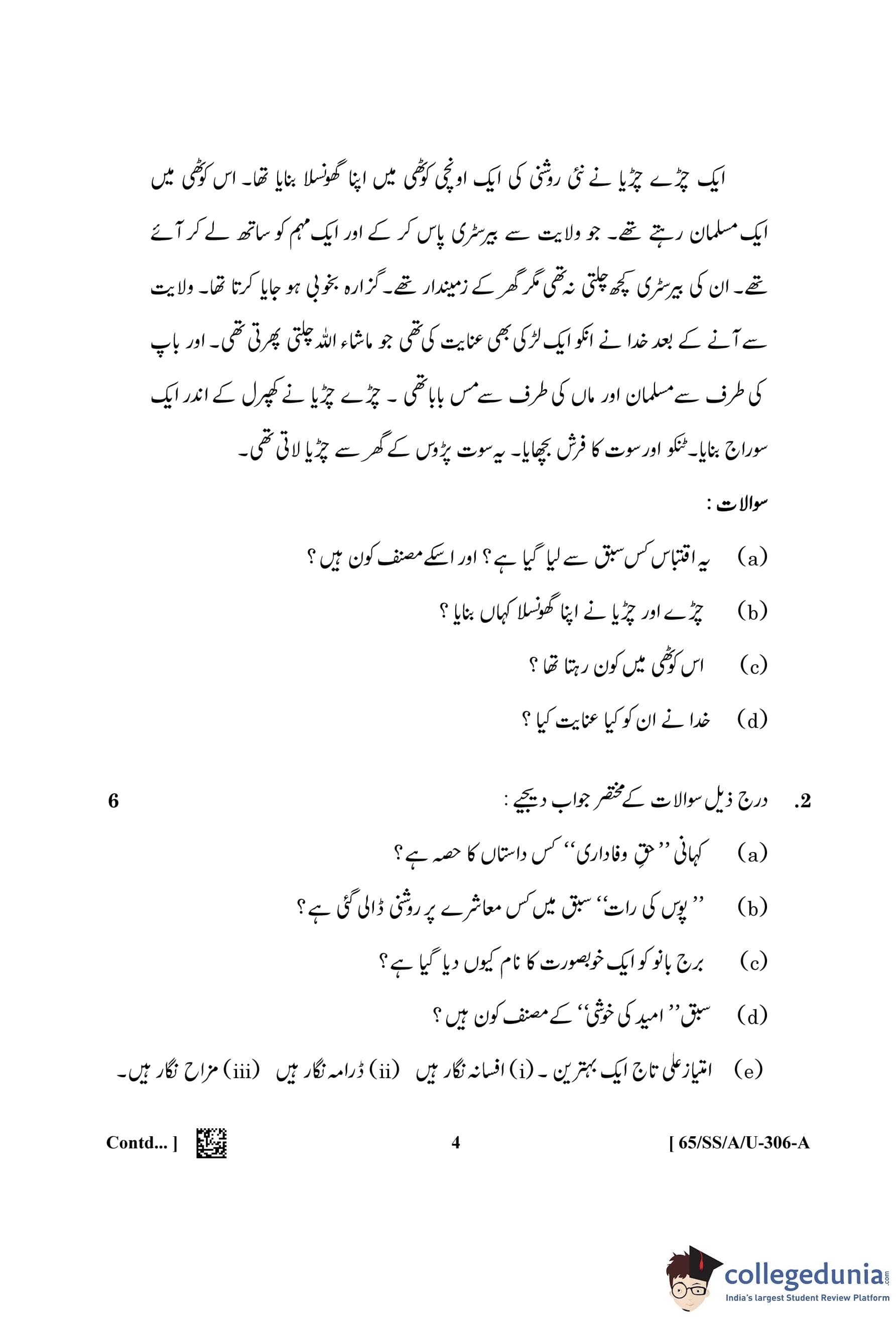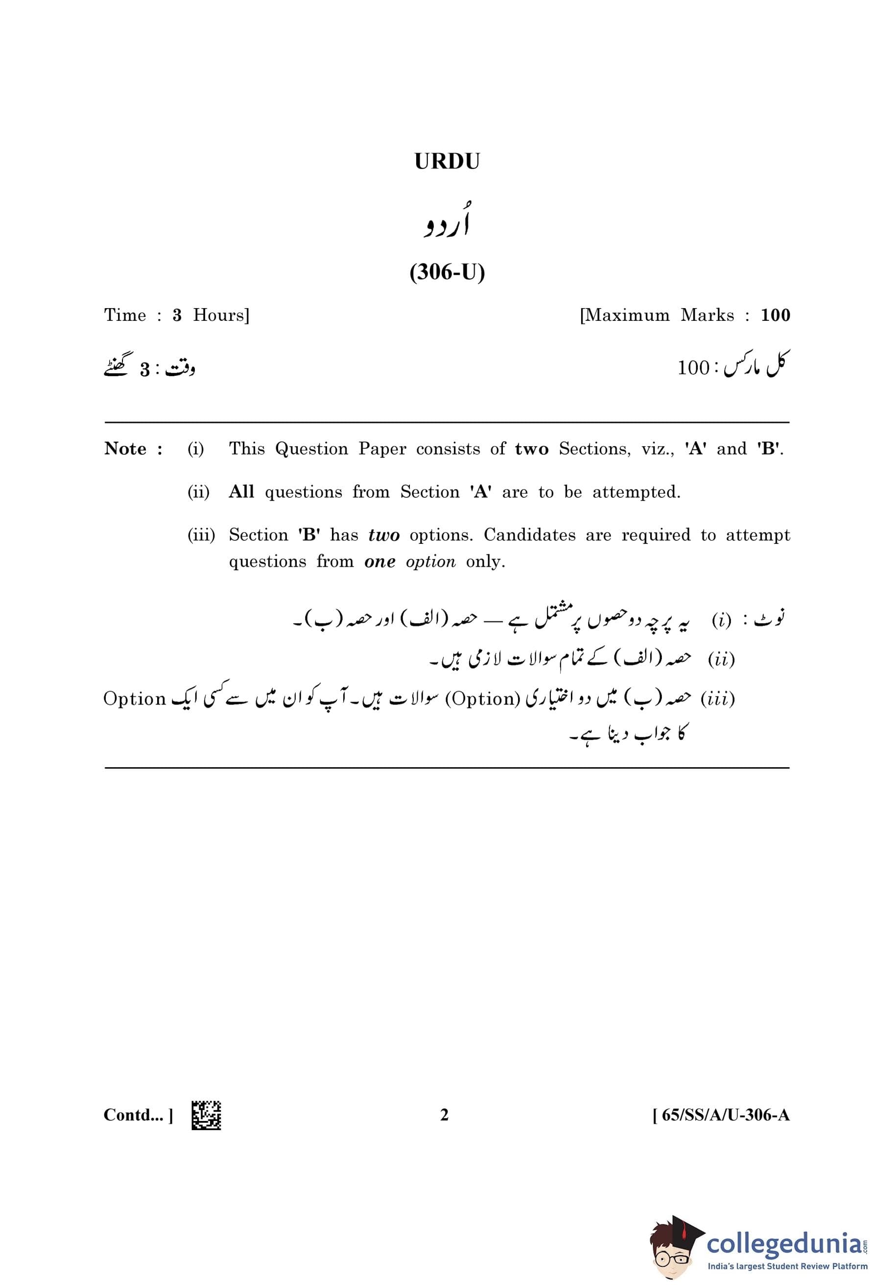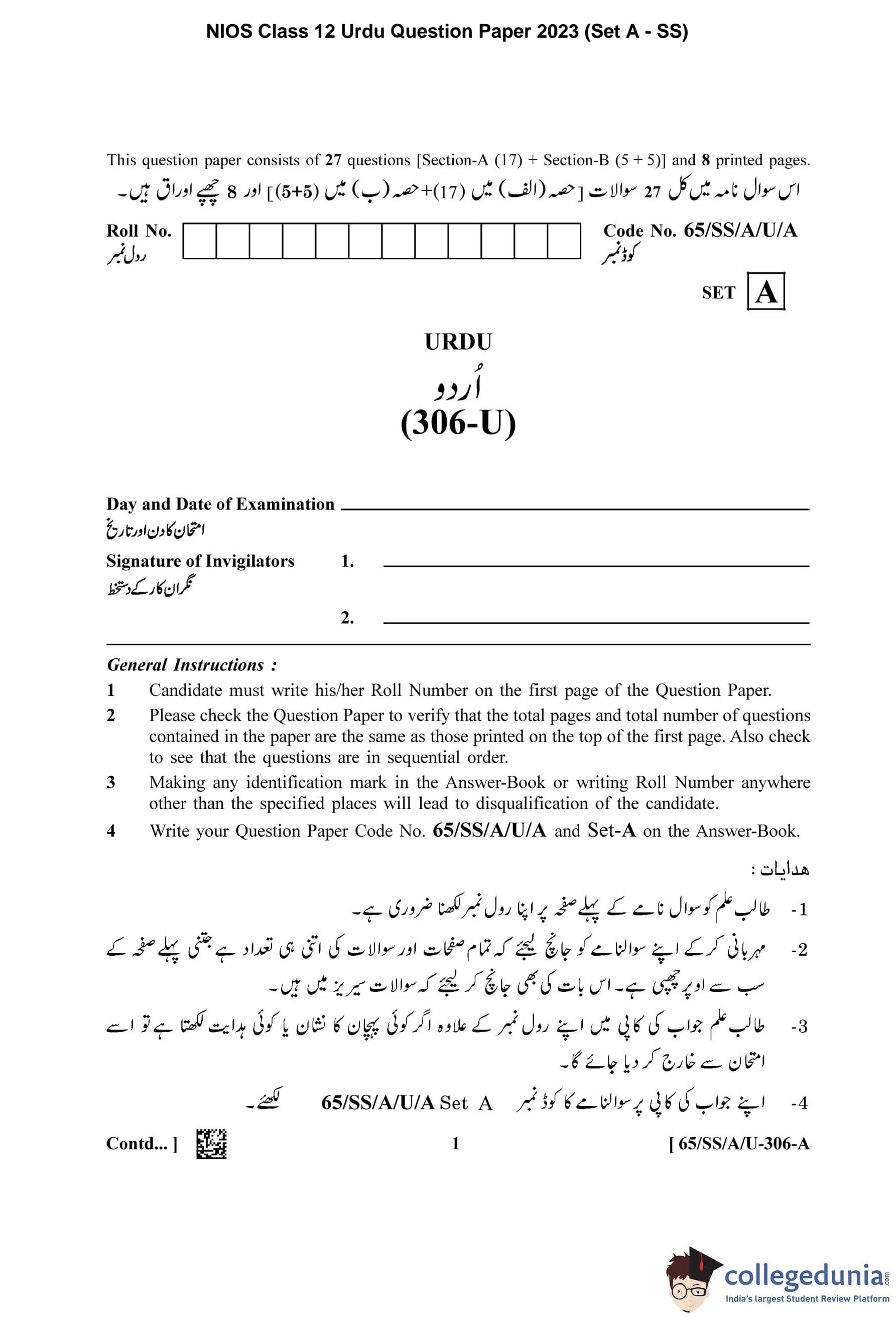 NIOS Class 12 Urdu (Set A - SS) Question Paper 2023 with Answer Key