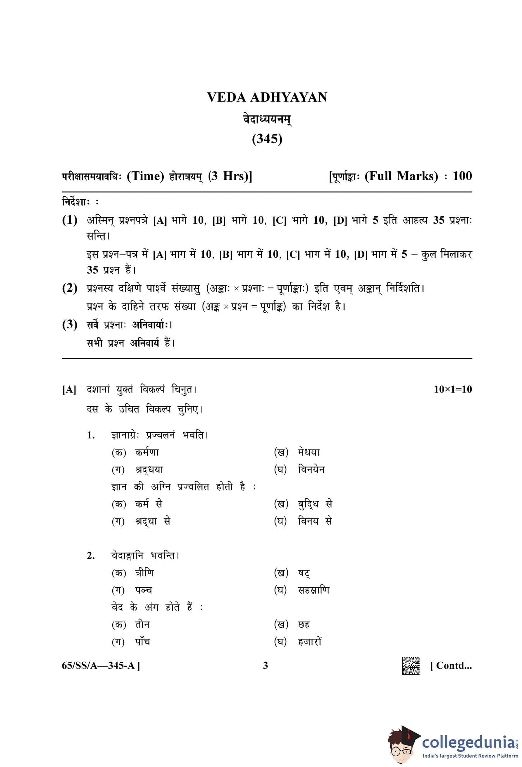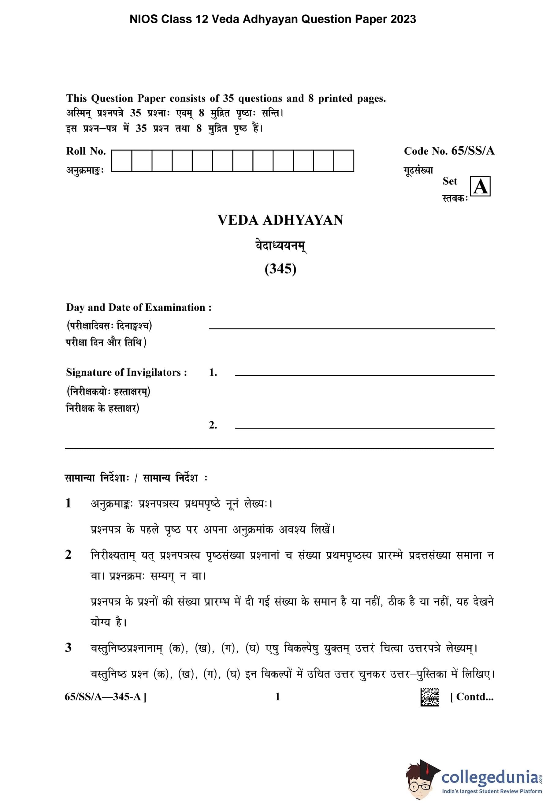 NIOS Class 12 Veda Adhyayan Question Paper 2023 with Answer Key pdf (Set A) is available for download here. The exam was conducted by National Institute of Open Schooling on April 26, 2023 in the Afternoon Session 2.30 PM to 5.30 PM. The question paper comprised a total of 35 questions.