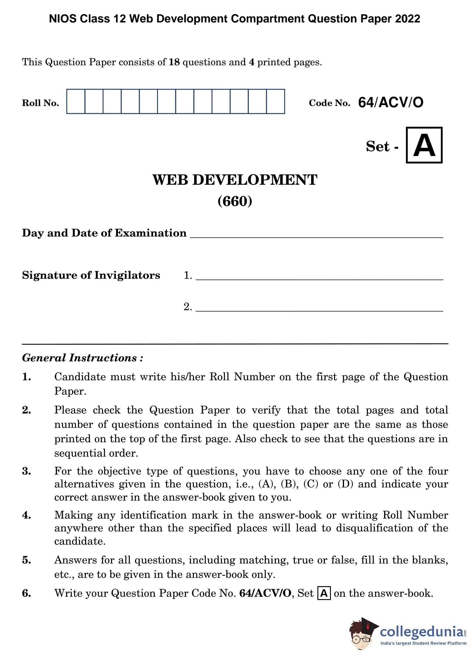 | NIOS Class 12 Web Development Question Paper 2022 PDF | NIOS Class 12 Web Development Answer Key 2022 PDF |