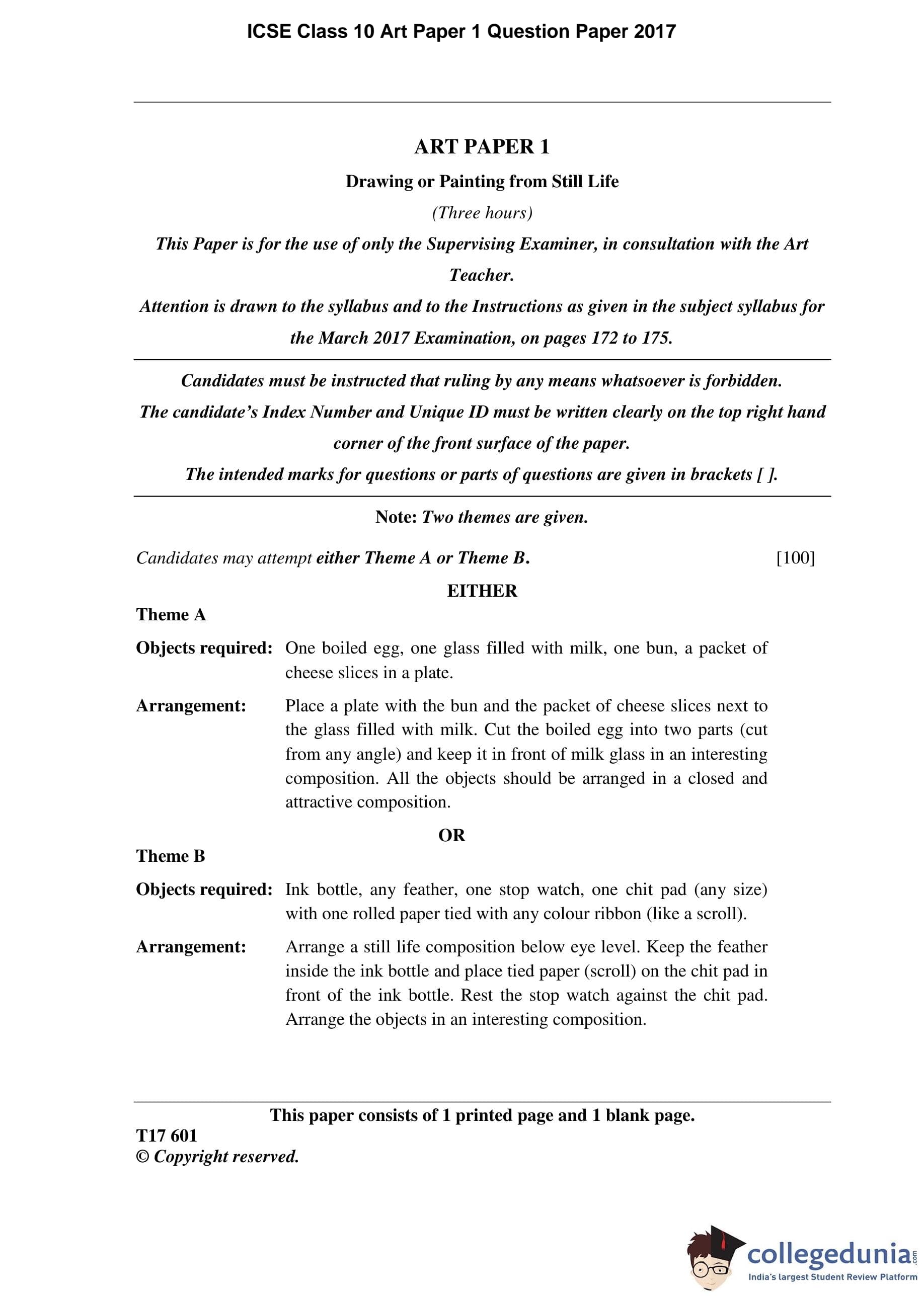 ICSE Class 10 Art Paper 1 Question Paper 2017 with Answer Key