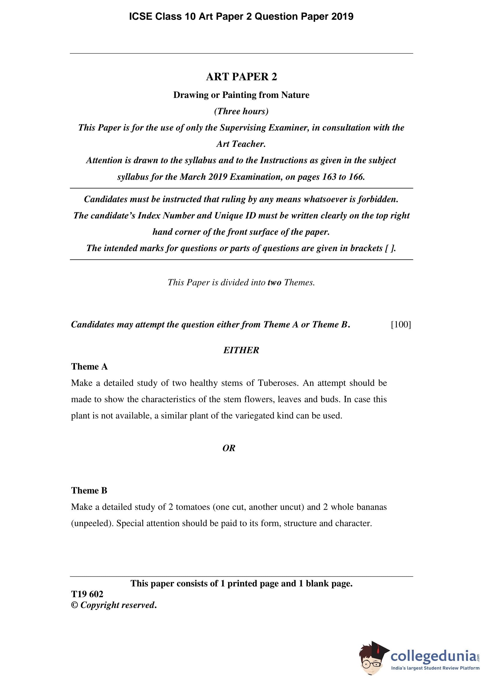 ICSE Class 10 Art Paper 2 Question Paper 2019 with Answer Key