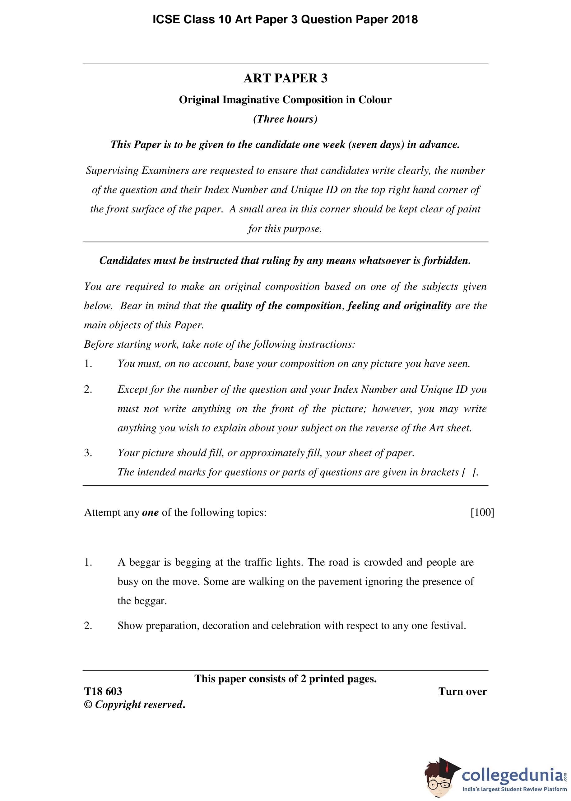ICSE Class 10 Art Paper 3 Question Paper 2018 with Answer Key