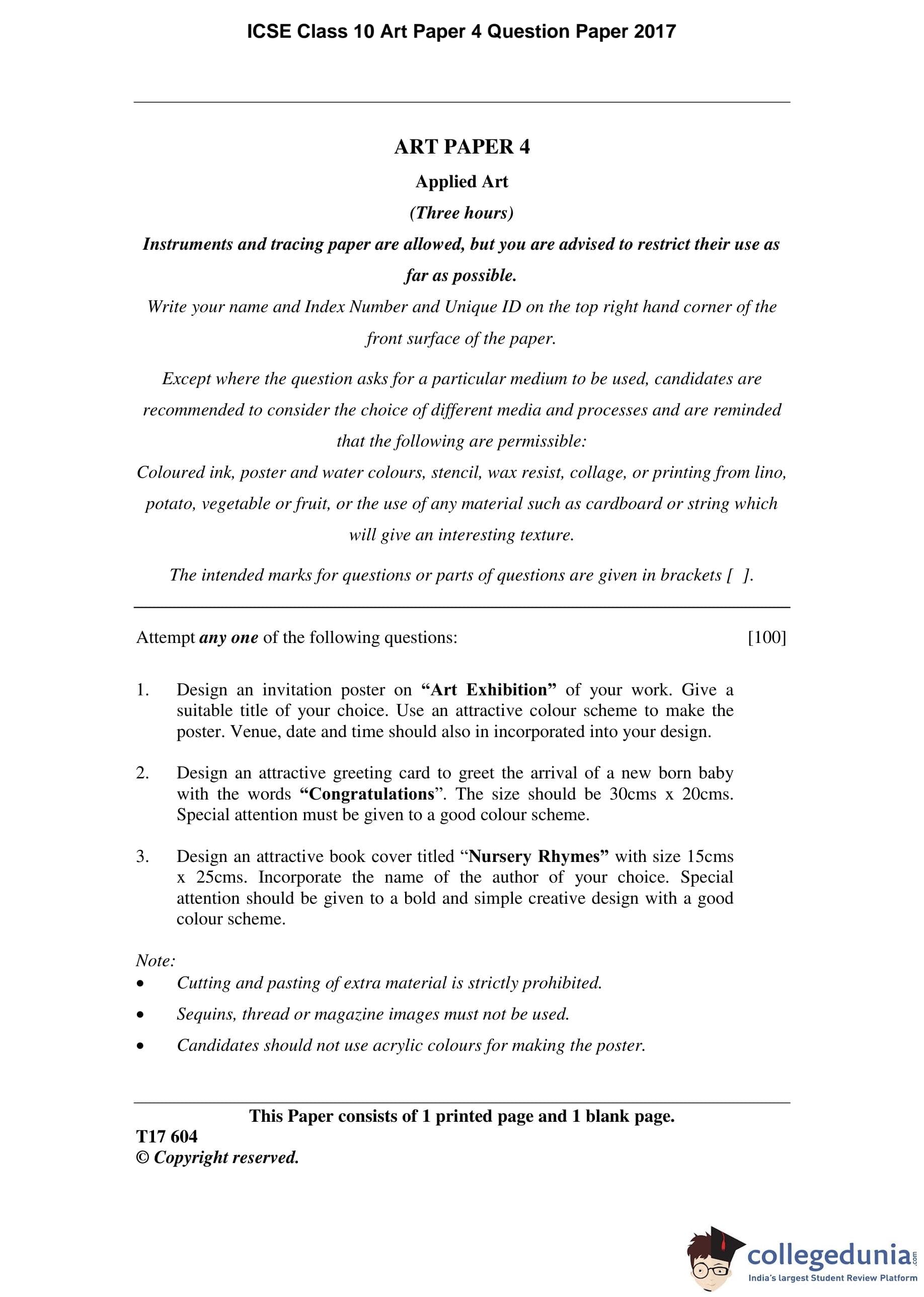 ICSE Class 10 Art Paper 4 Question Paper 2017 with Answer Key