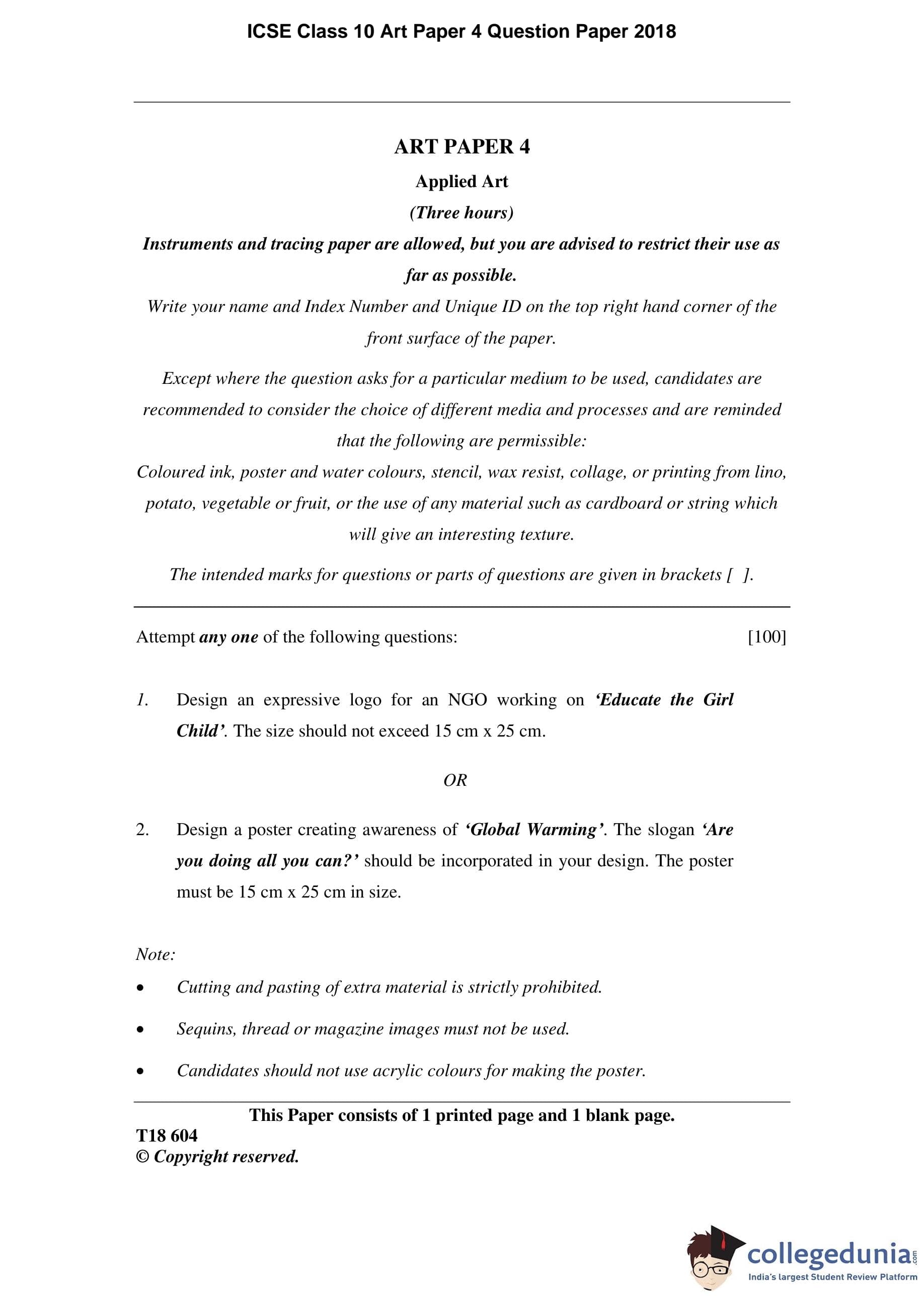ICSE Class 10 Art Paper 4 Question Paper 2018 with Answer Key