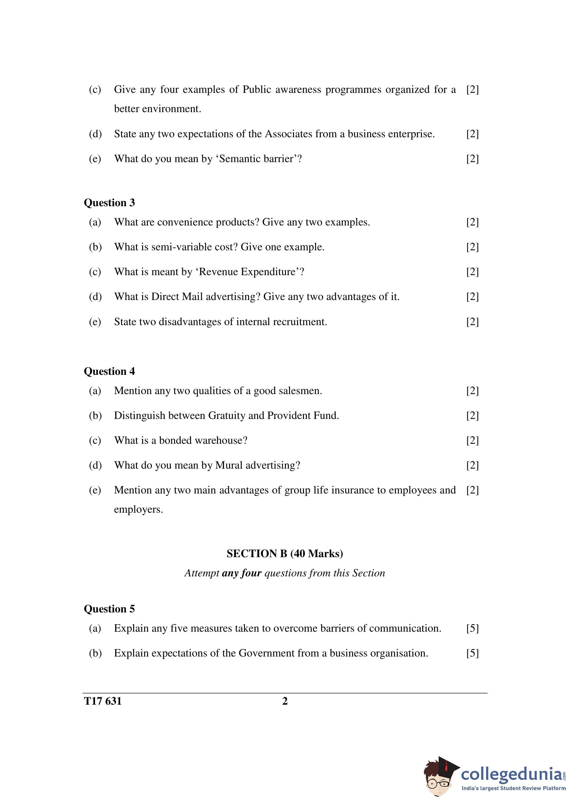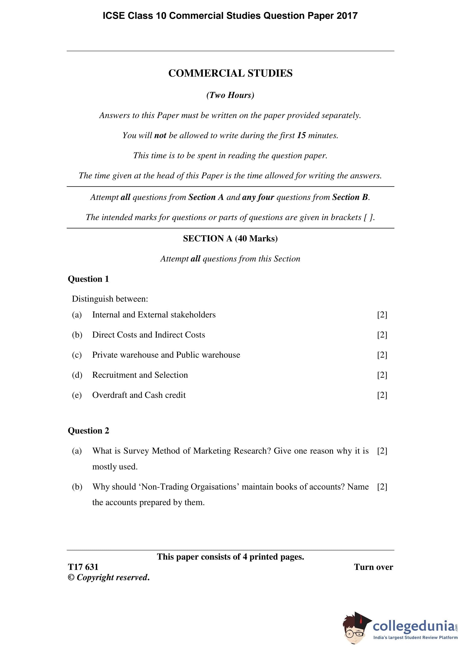 ICSE Class 10 Commercial Studies Question Paper 2017 with Answer Key pdf is available for download here. The exam was conducted by Council for the Indian School Certificate Examinations on April 19, 2017 in the Morning Session 11 AM to 1 PM. The question paper comprised a total of 10 questions divided among 2 sections.