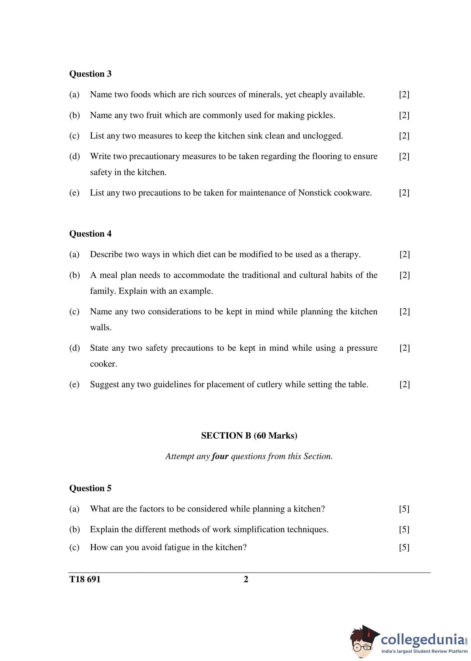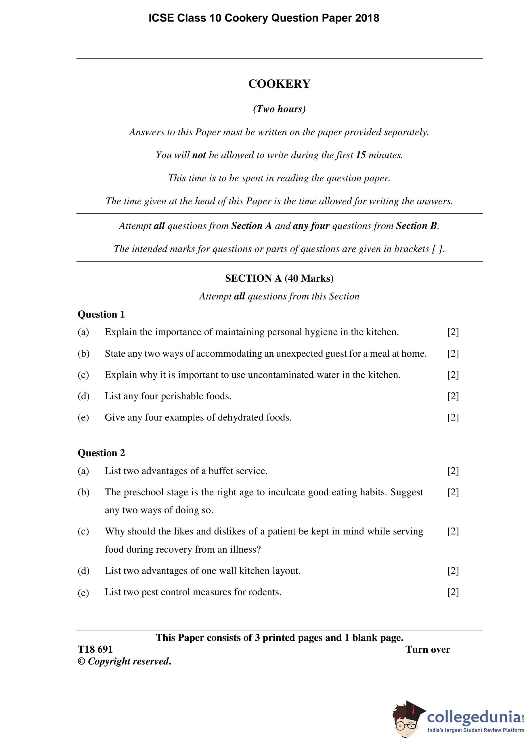 ICSE Class 10 Cookery Question Paper 2018 with Answer Key pdf is available for download here. The exam was conducted by Council for the Indian School Certificate Examinations on March 23, 2018 in the Morning Session 11 AM to 1 PM. The question paper comprised a total of 10 questions divided among 2 sections.