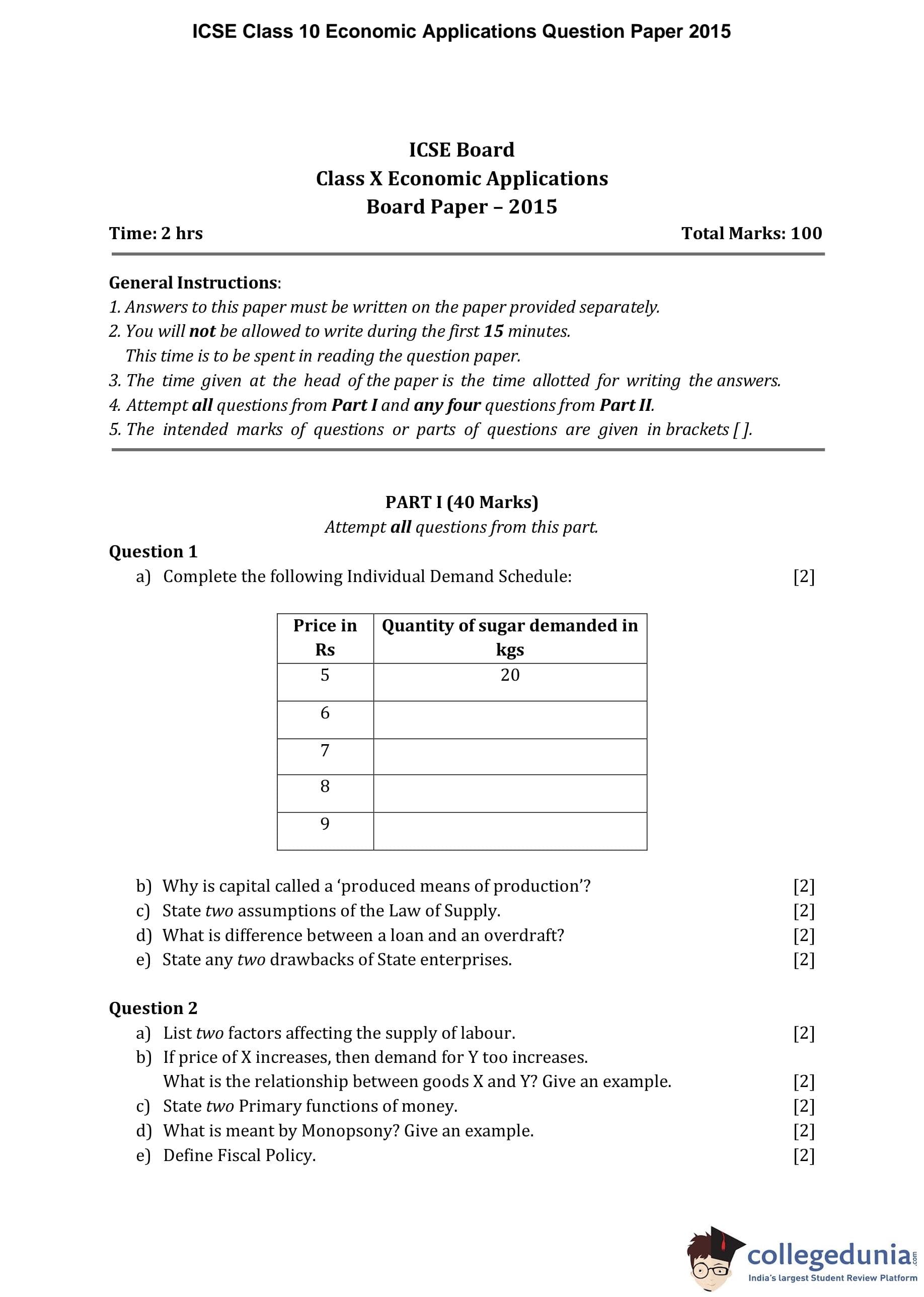 ICSE Class 10 Economic Applications Question Paper 2015 with Answer Key pdf is available for download here. The exam was conducted by Council for the Indian School Certificate Examinations on March 20, 2015 in the Morning Session 11 AM to 1 PM. The question paper comprised a total of 10 questions divided among 2 sections.