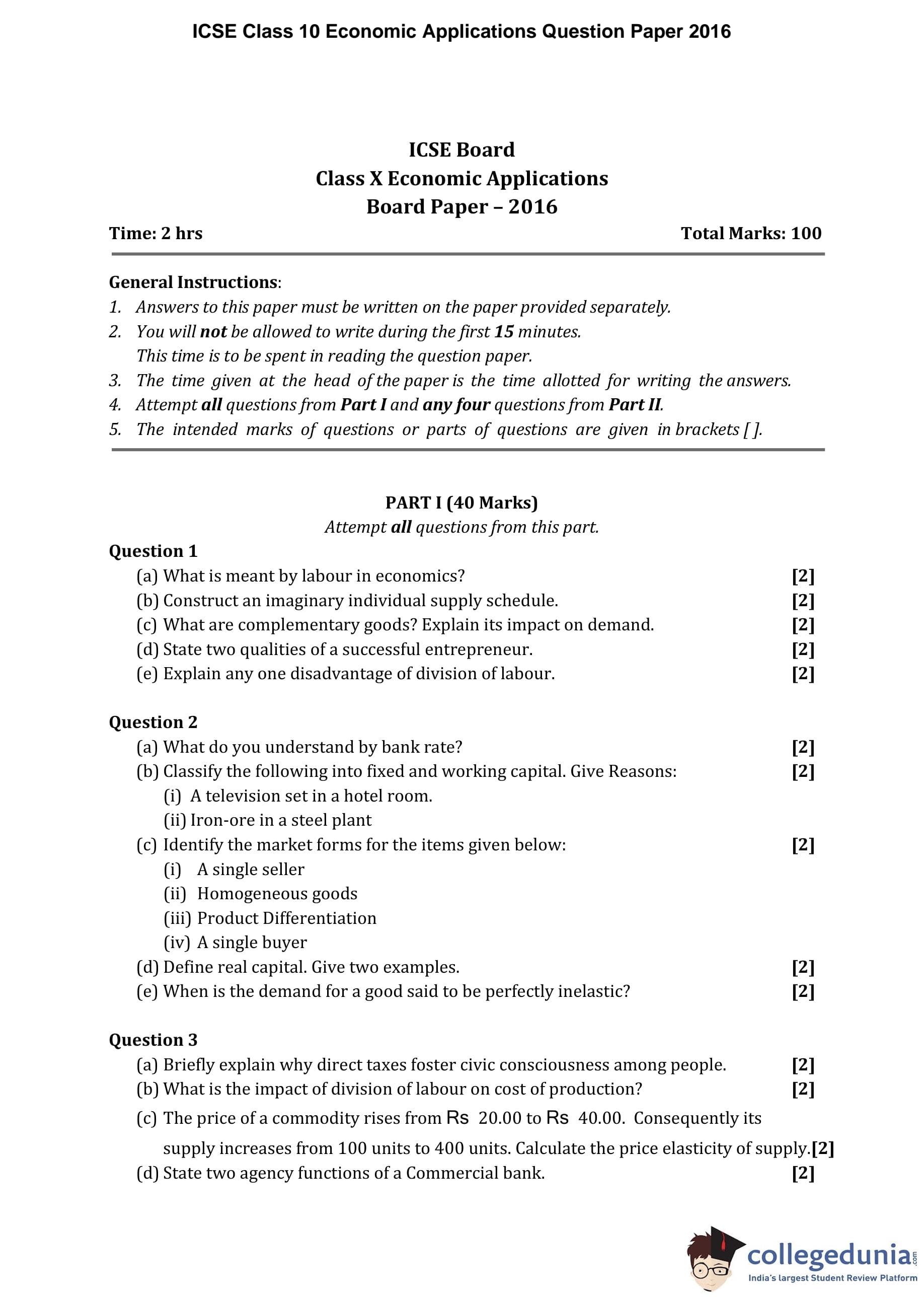 ICSE Class 10 Economic Applications Question Paper 2016 with Answer Key pdf is available for download here. The exam was conducted by Council for the Indian School Certificate Examinations on March 28, 2016 in the Morning Session 11 AM to 1 PM. The question paper comprised a total of 10 questions divided among 2 sections.